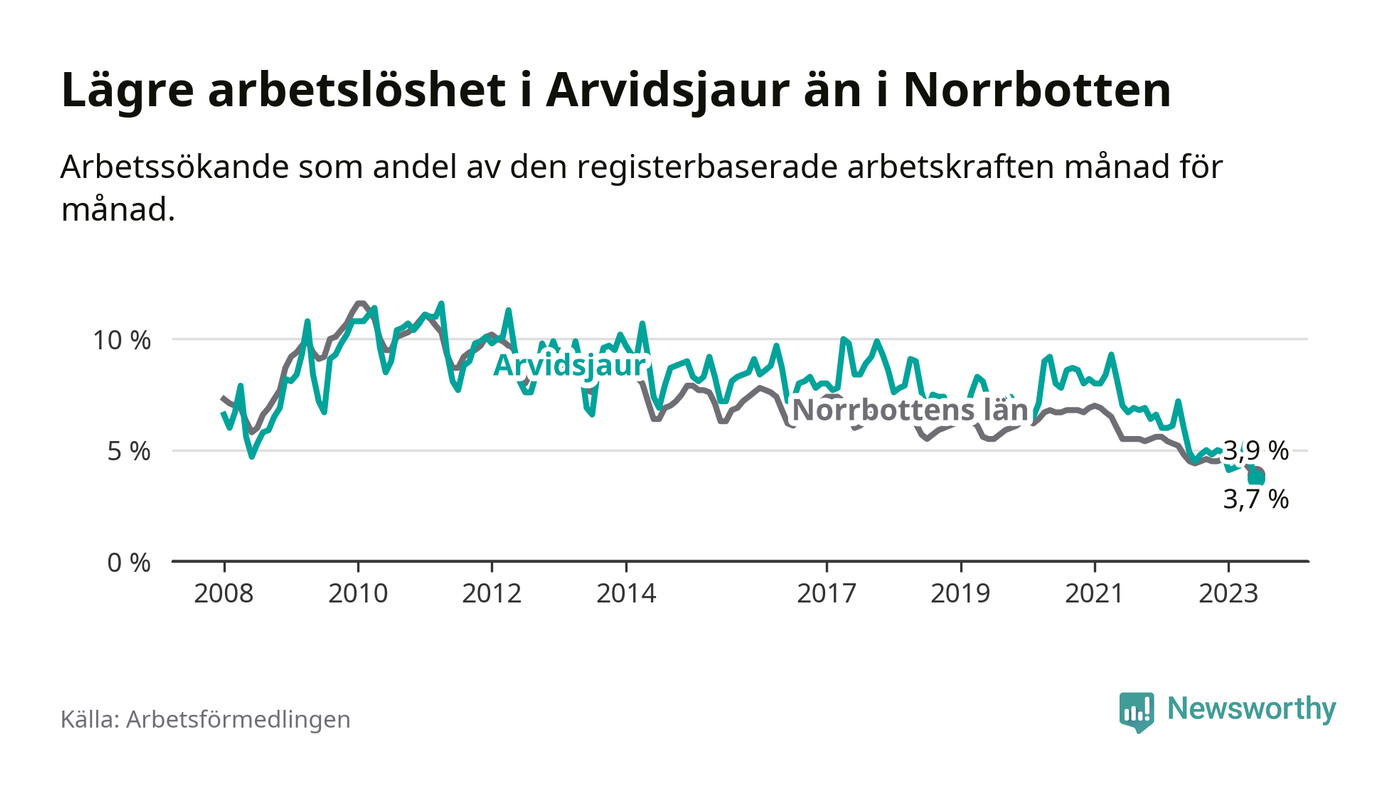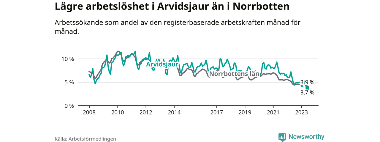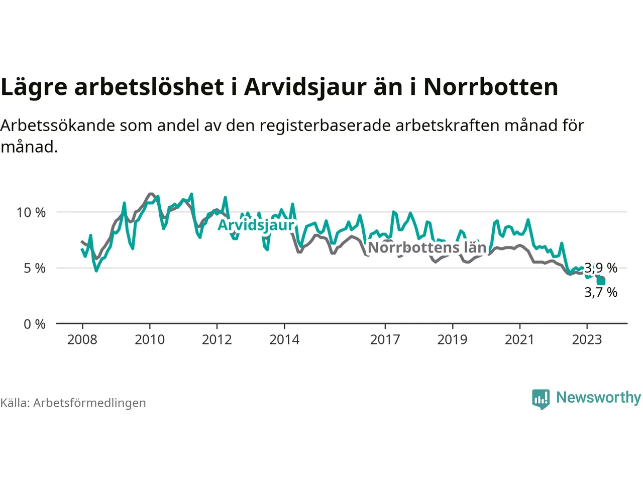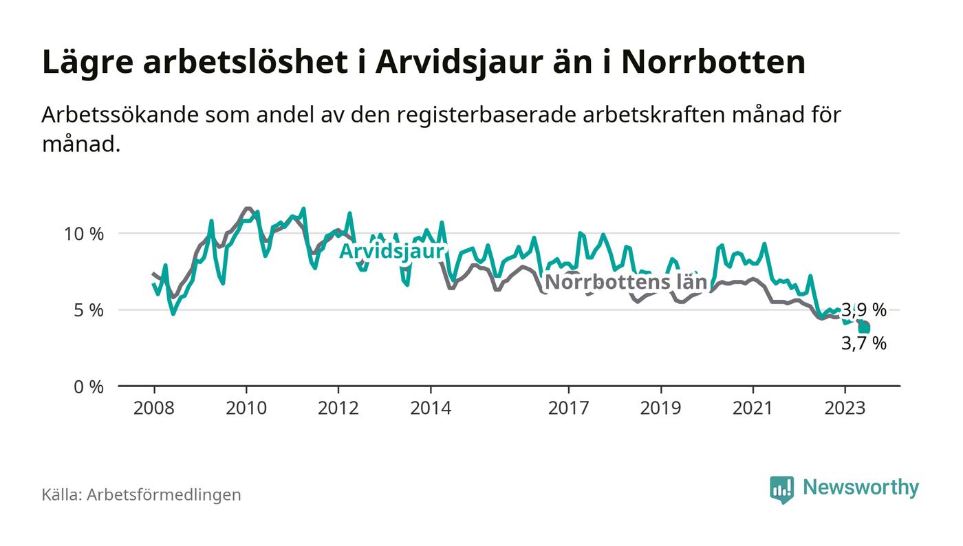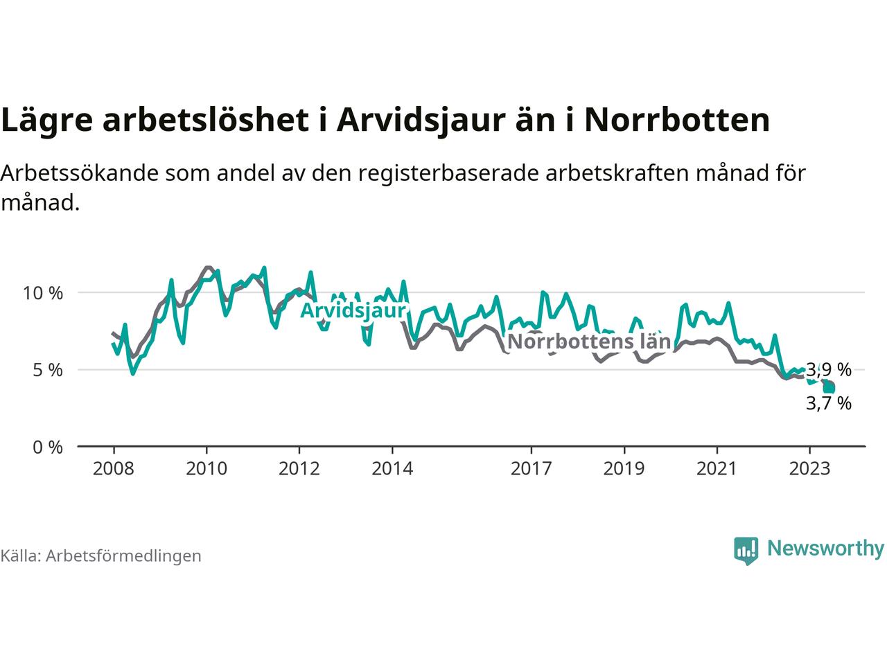 Det är 26:e månaden i följd som arbetslösheten i Arvidsjaur är lägre än den var under samma tidpunkt året innan. Sedan april 2021 har arbetslösheten gått ner från 9,3 till 3,7 procent. Den nuvarande arbetslöshetsnivån är därmed den lägsta sedan januari 2008.