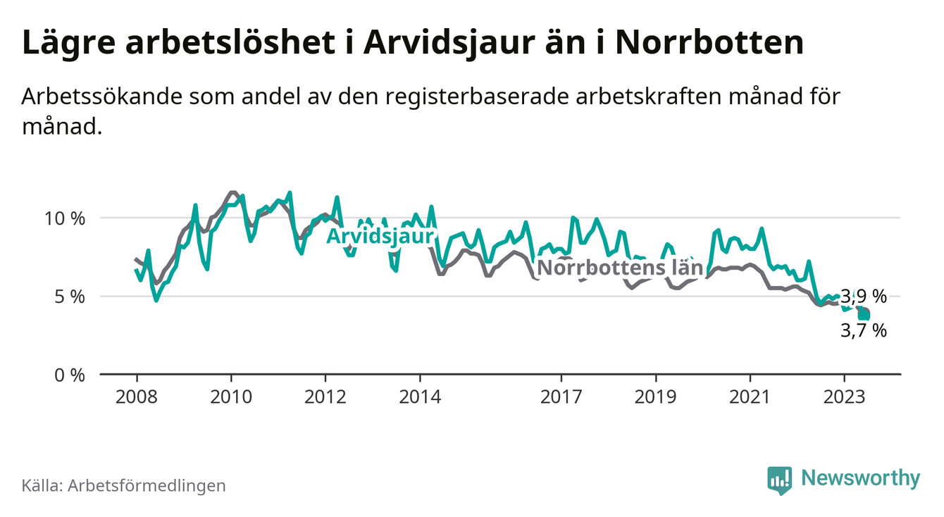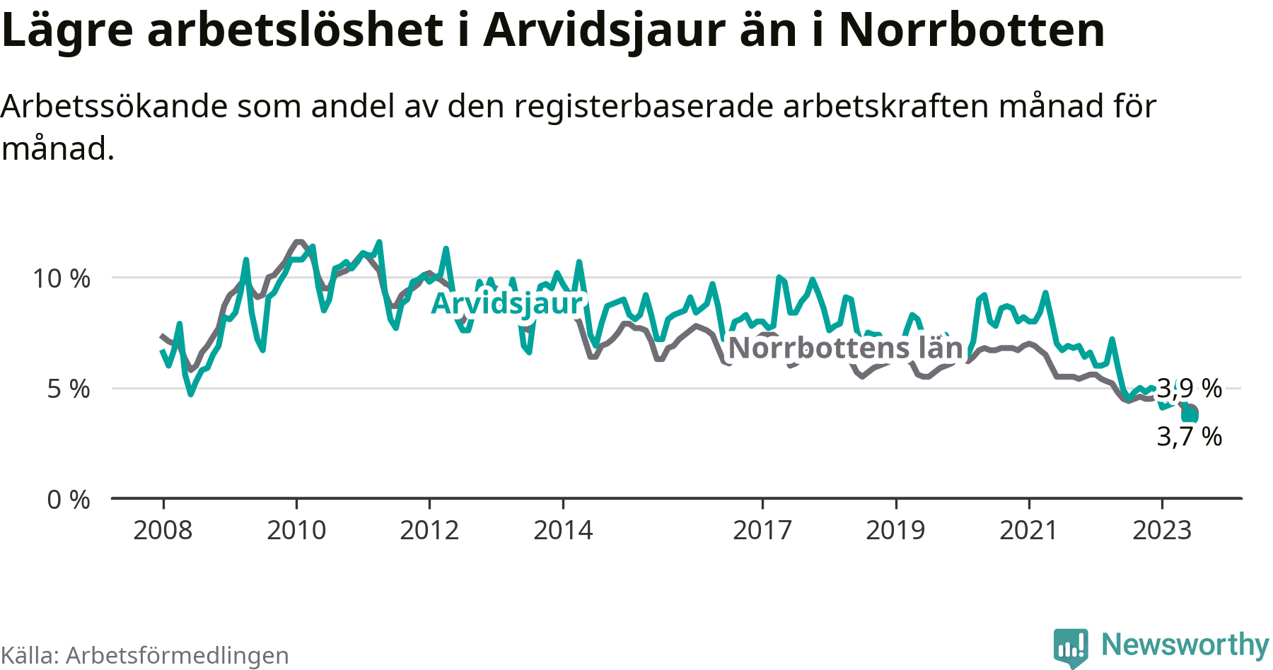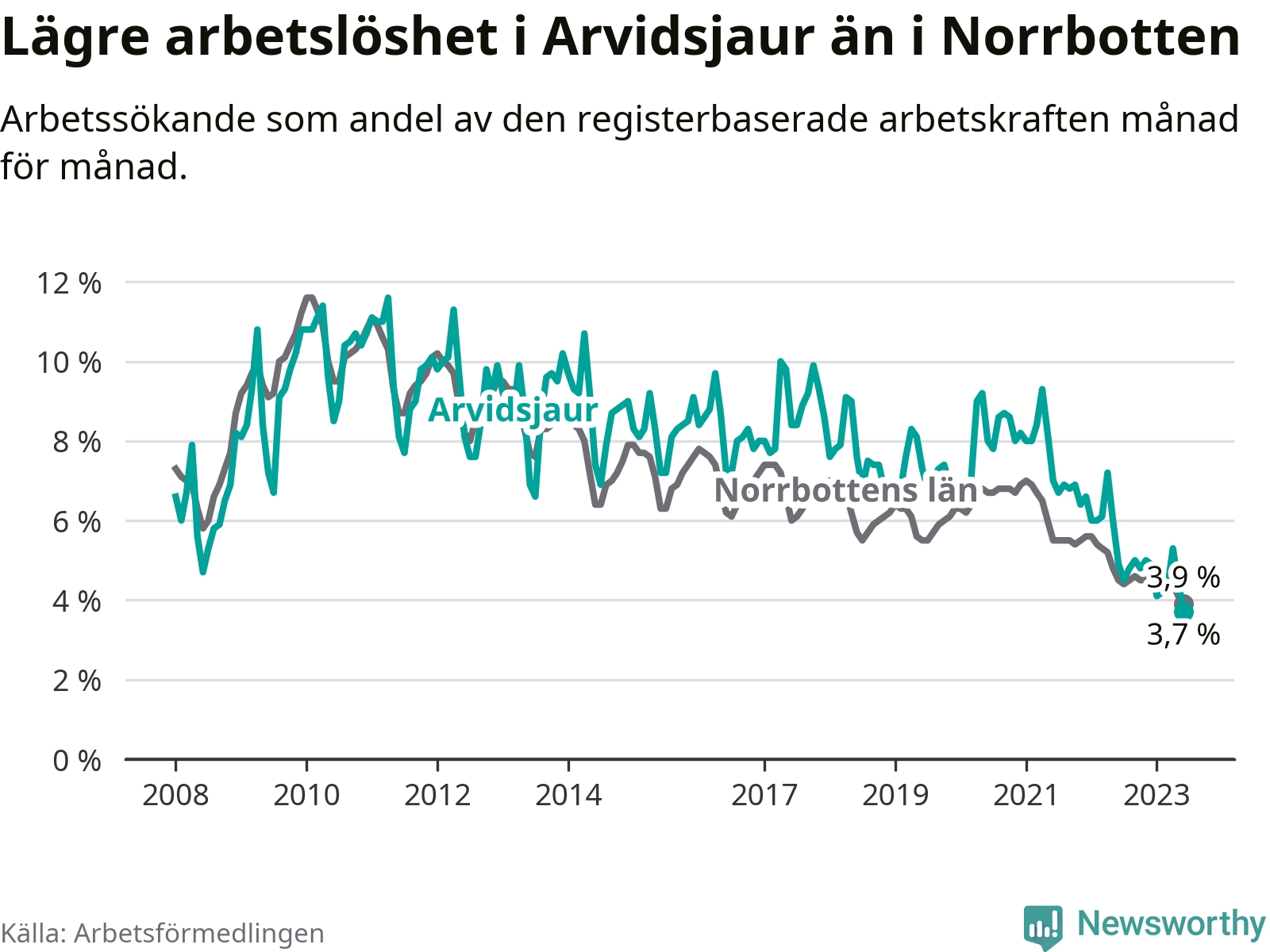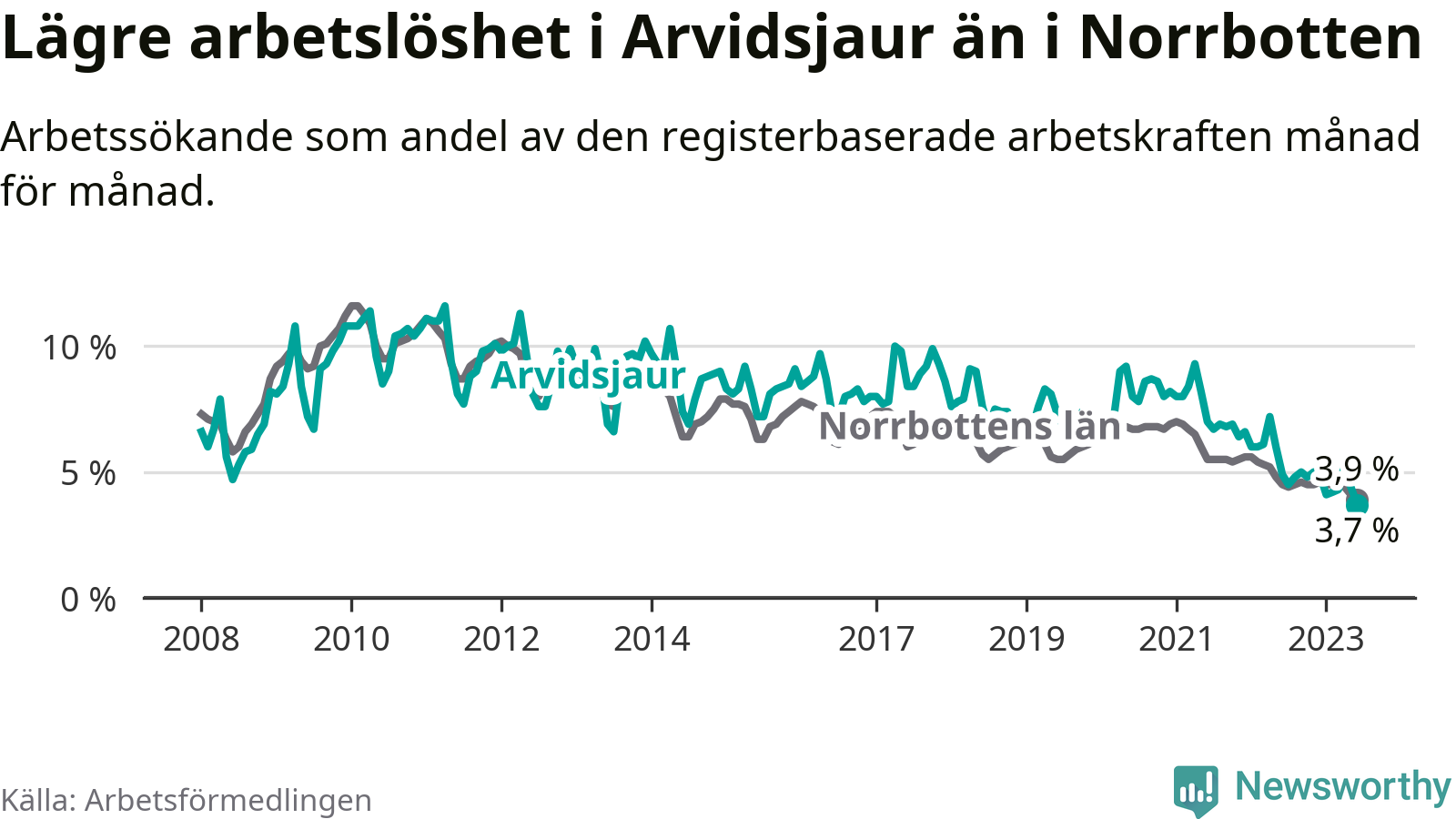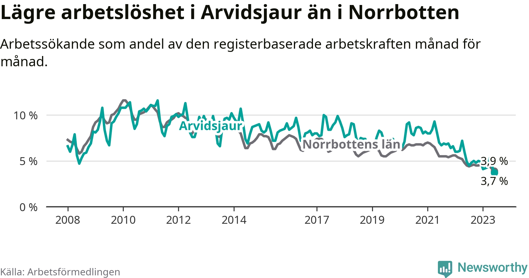 Det är 26:e månaden i följd som arbetslösheten i Arvidsjaur är lägre än den var under samma tidpunkt året innan. Sedan april 2021 har arbetslösheten gått ner från 9,3 till 3,7 procent. Den nuvarande arbetslöshetsnivån är därmed den lägsta sedan januari 2008.