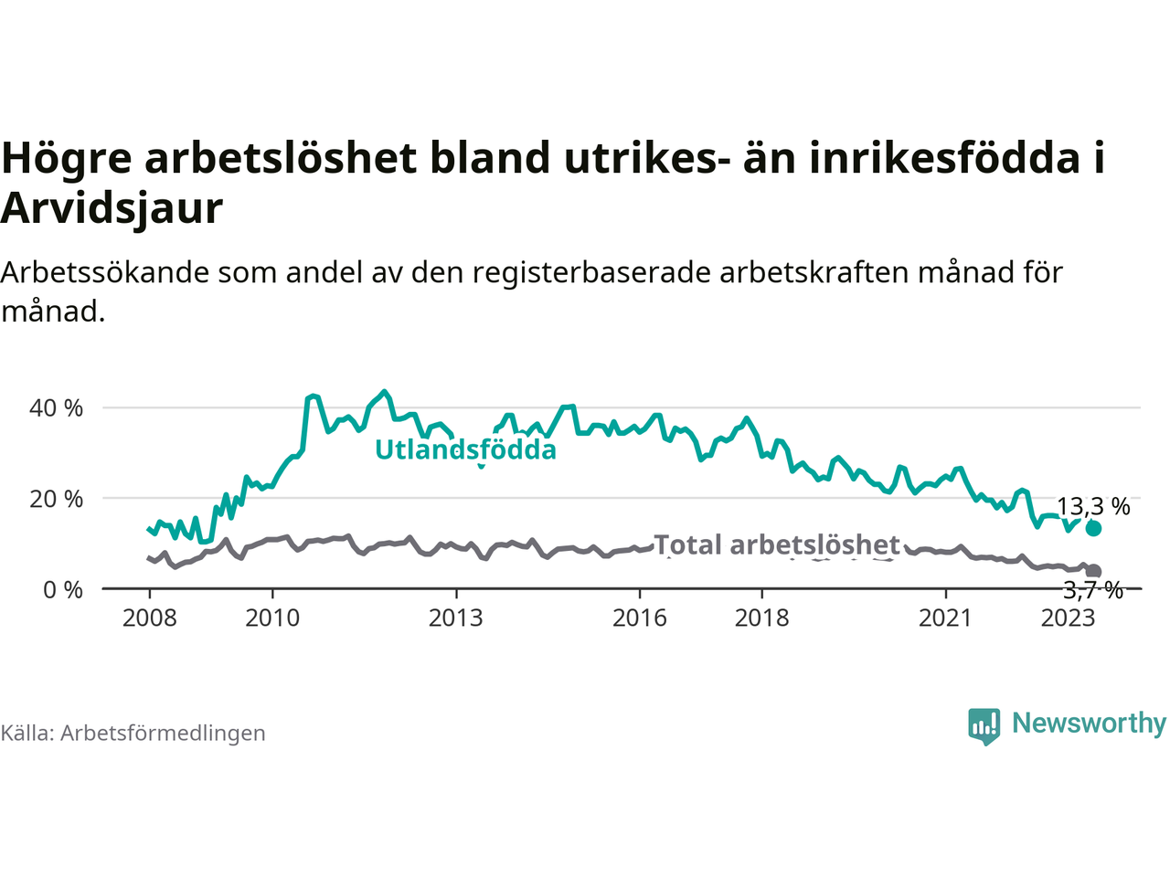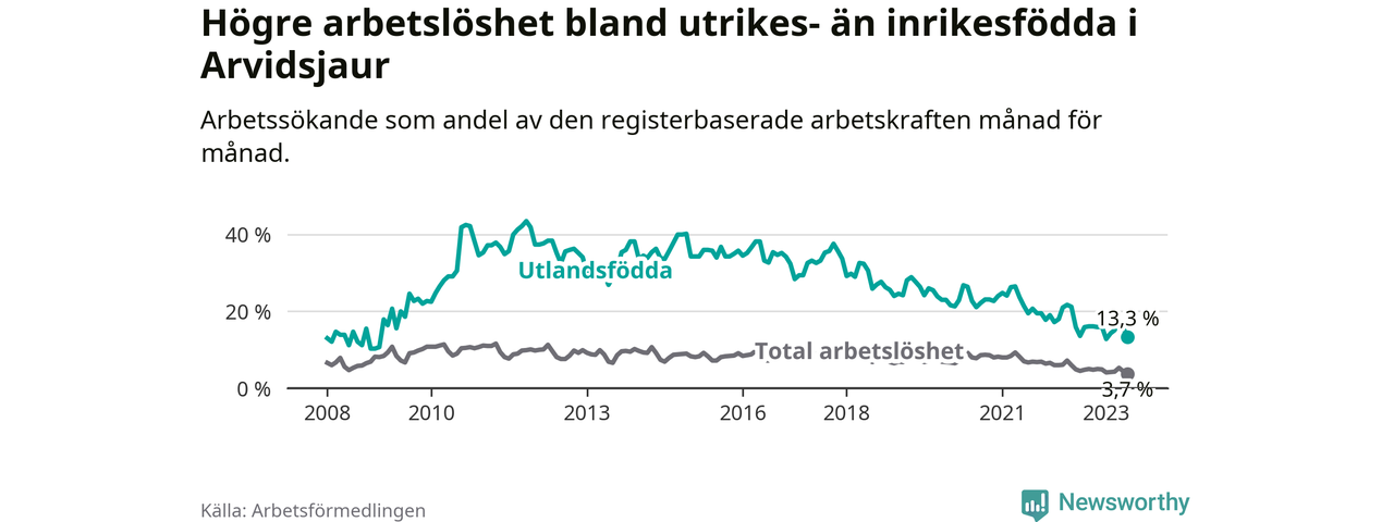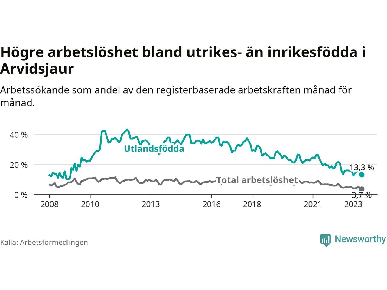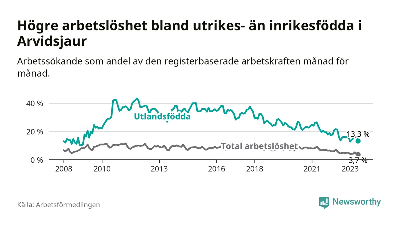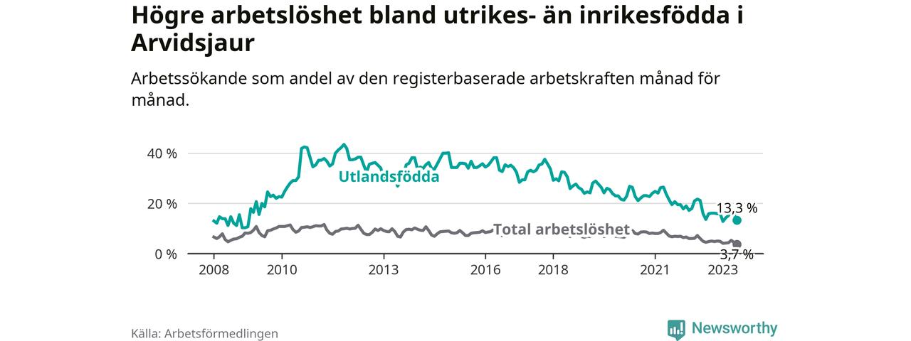 Arbetslösheten bland utlandsfödda var 13,3 procent i Arvidsjaur under juni månad, motsvarande 45 av 338 personer. Det är 2,6 procentenheter färre än vid samma tidpunkt i fjol (−4 om man räknar personer). Därmed har de utlandsföddas arbetslöshet varit lägre än vid samma tidpunkt i fjol i över två år i sträck. Sedan mars 2021 har arbetslösheten bland utlandsfödda minskat från 26,3 till 13,3 procent.