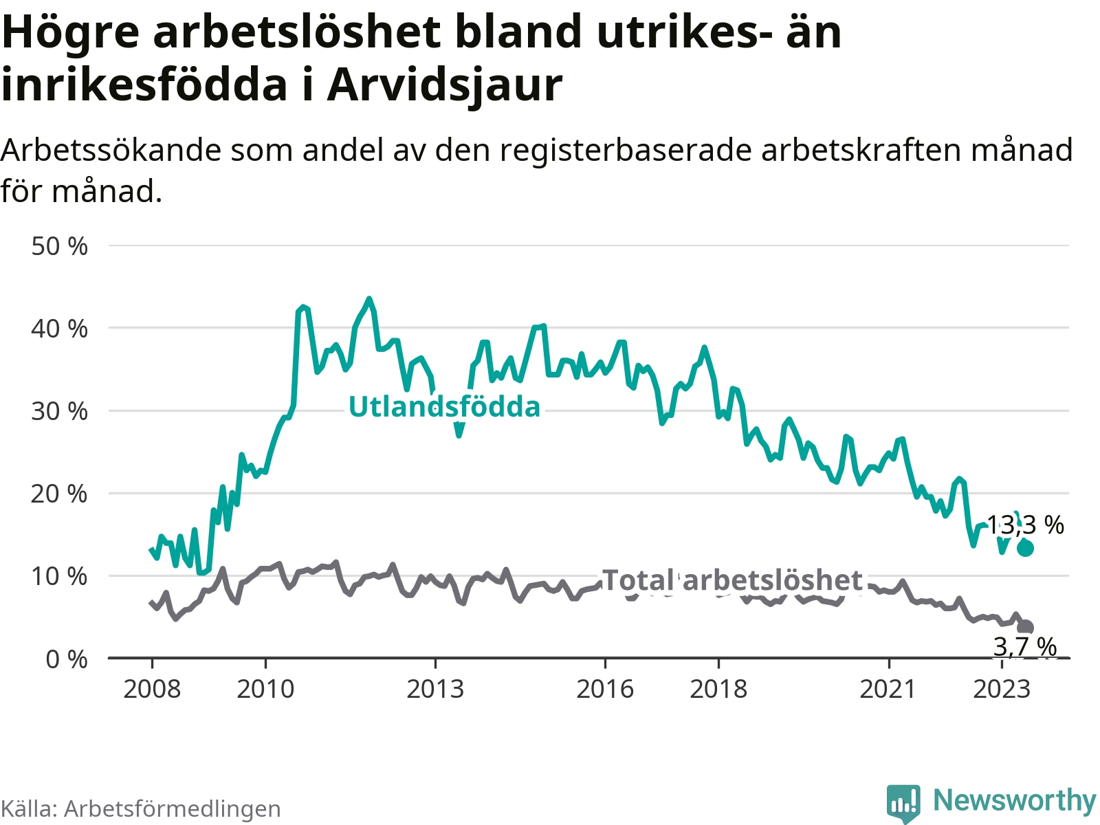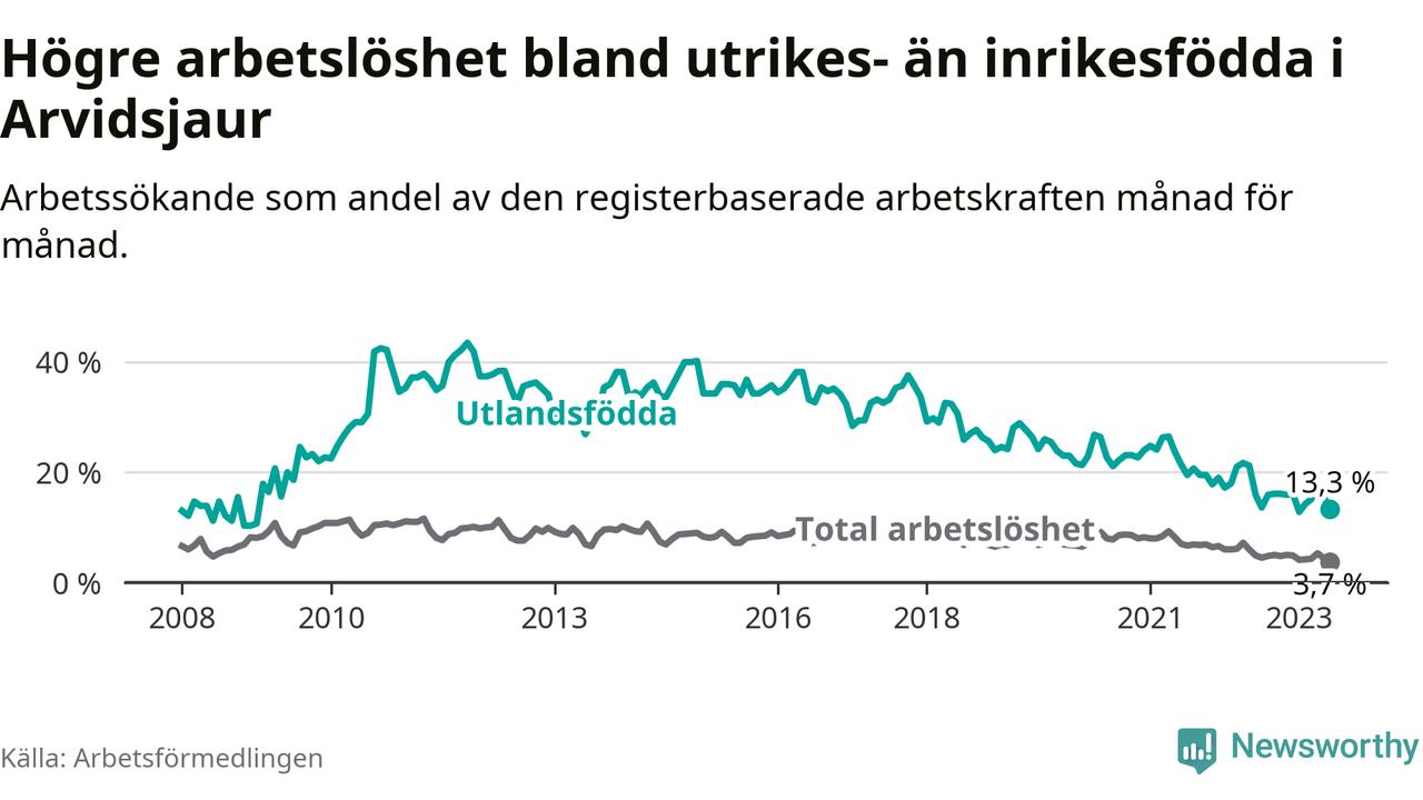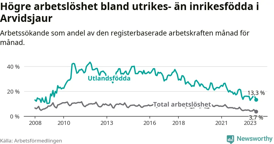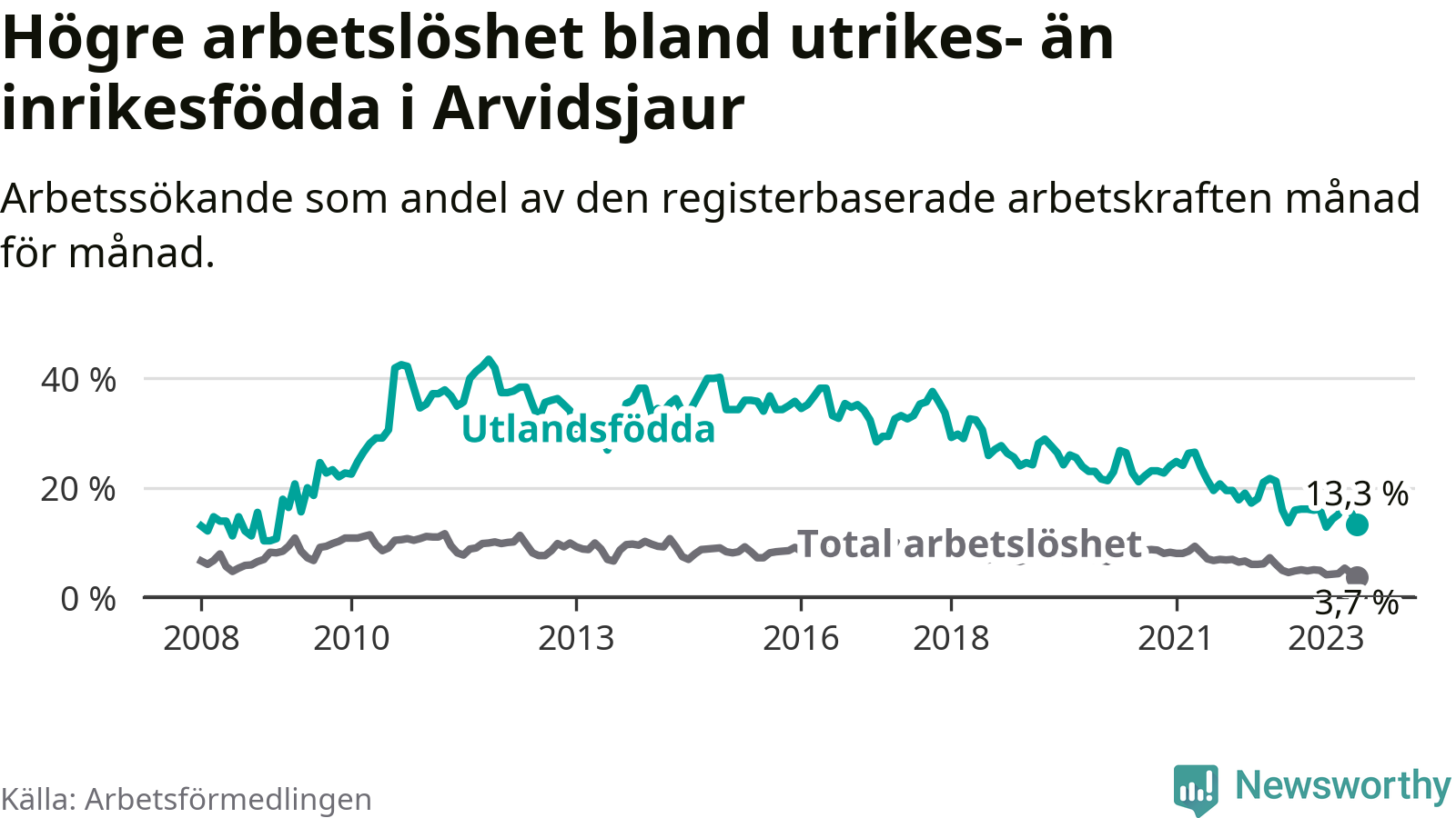 Arbetslösheten bland utlandsfödda var 13,3 procent i Arvidsjaur under juni månad, motsvarande 45 av 338 personer. Det är 2,6 procentenheter färre än vid samma tidpunkt i fjol (−4 om man räknar personer). Därmed har de utlandsföddas arbetslöshet varit lägre än vid samma tidpunkt i fjol i över två år i sträck. Sedan mars 2021 har arbetslösheten bland utlandsfödda minskat från 26,3 till 13,3 procent.