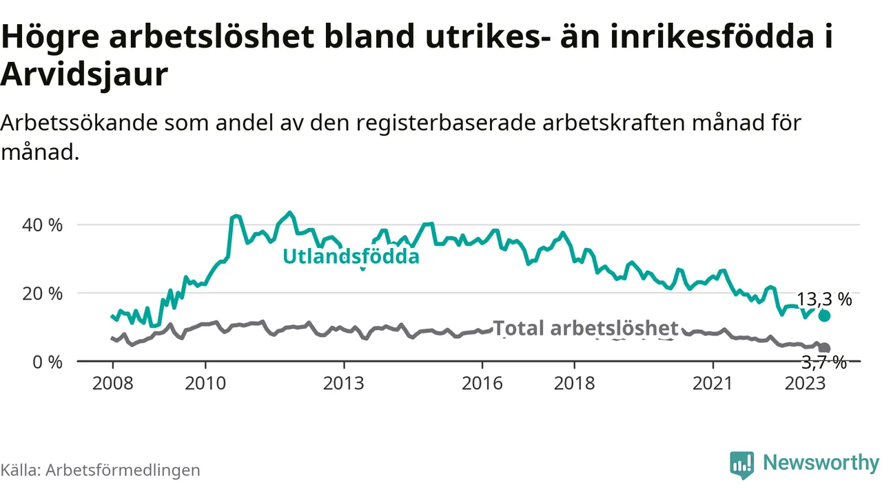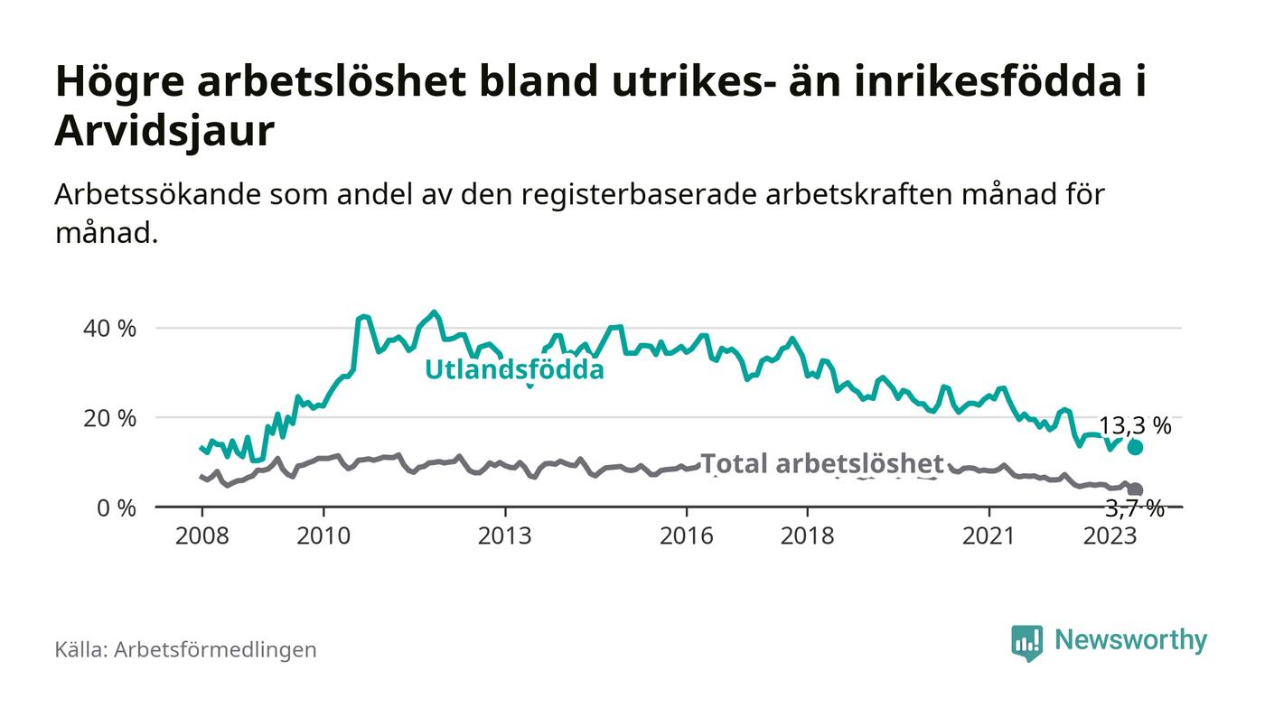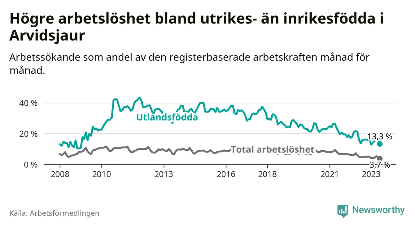 Skillnaden i arbetslöshet mellan utrikesfödda och hela befolkningen är 9,6 procentenheter i Arvidsjaur. Det är en mindre skillnad än för ett år sedan (−1,4 procentenheter).