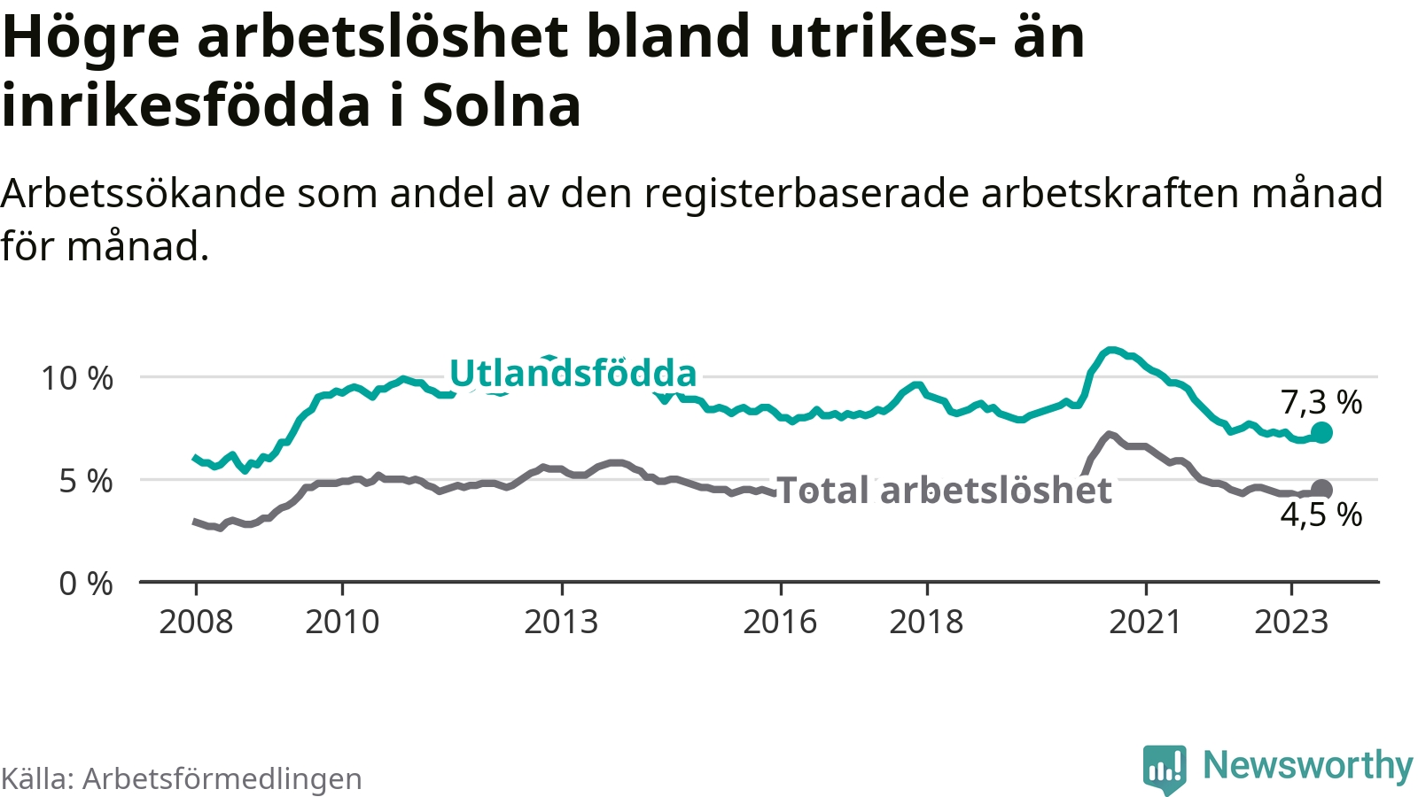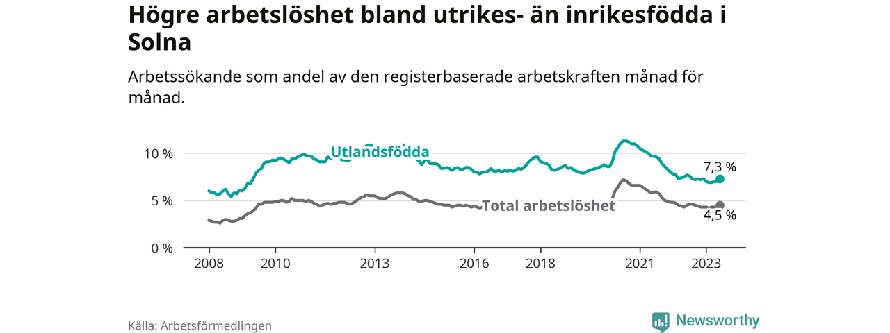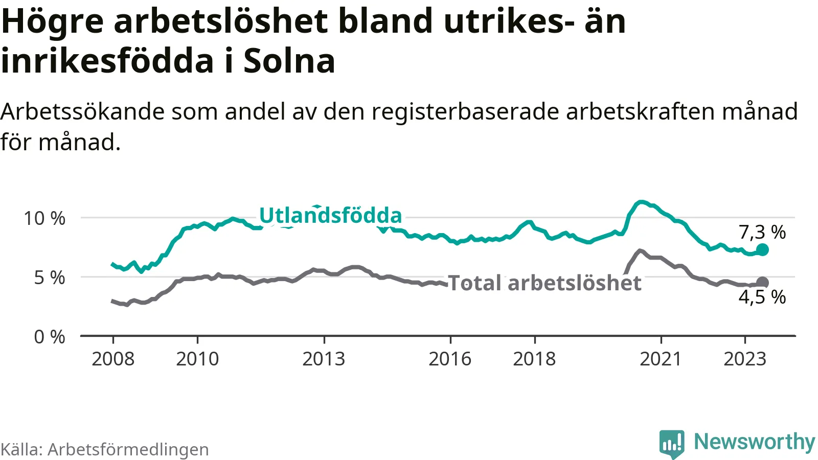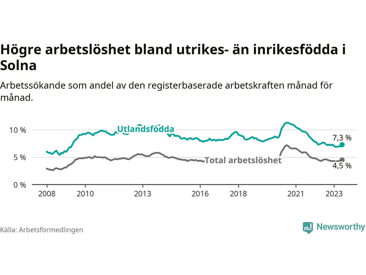 Skillnaden i arbetslöshet mellan utrikesfödda och hela befolkningen är 2,8 procentenheter i Solna.