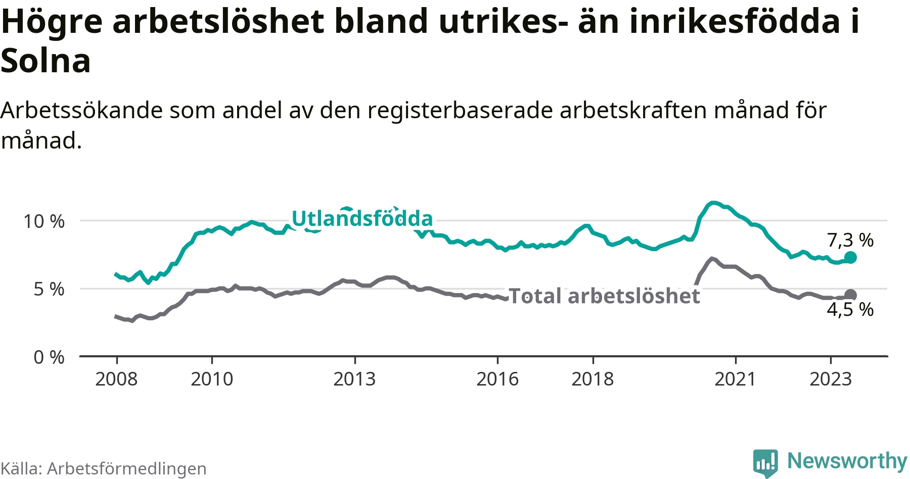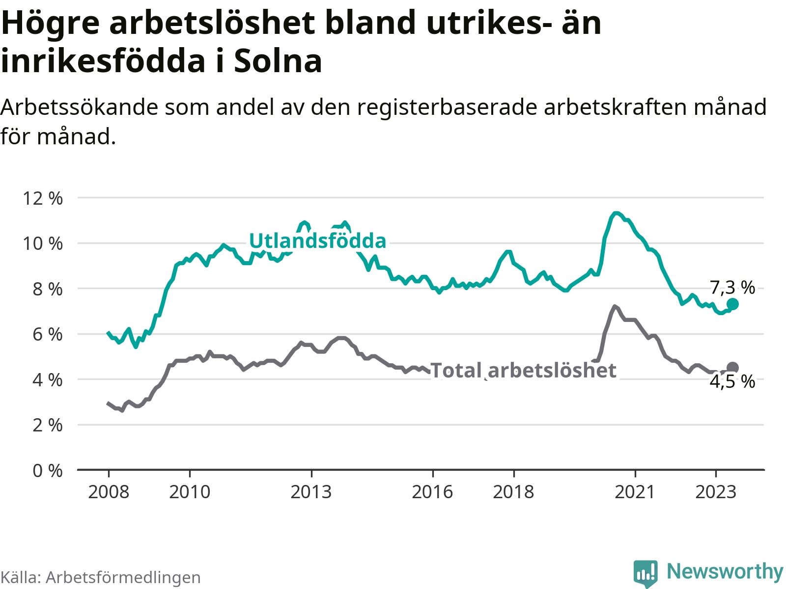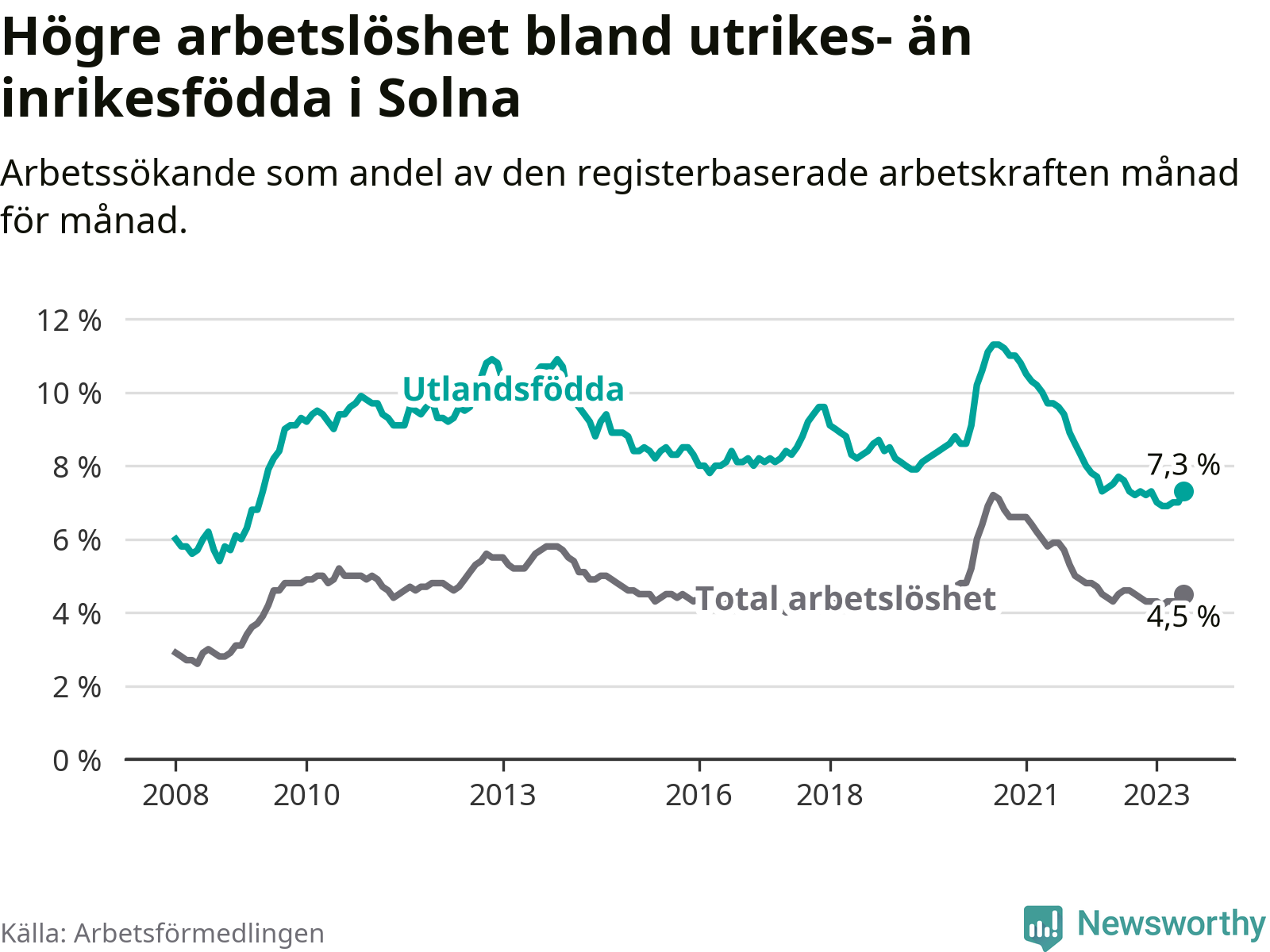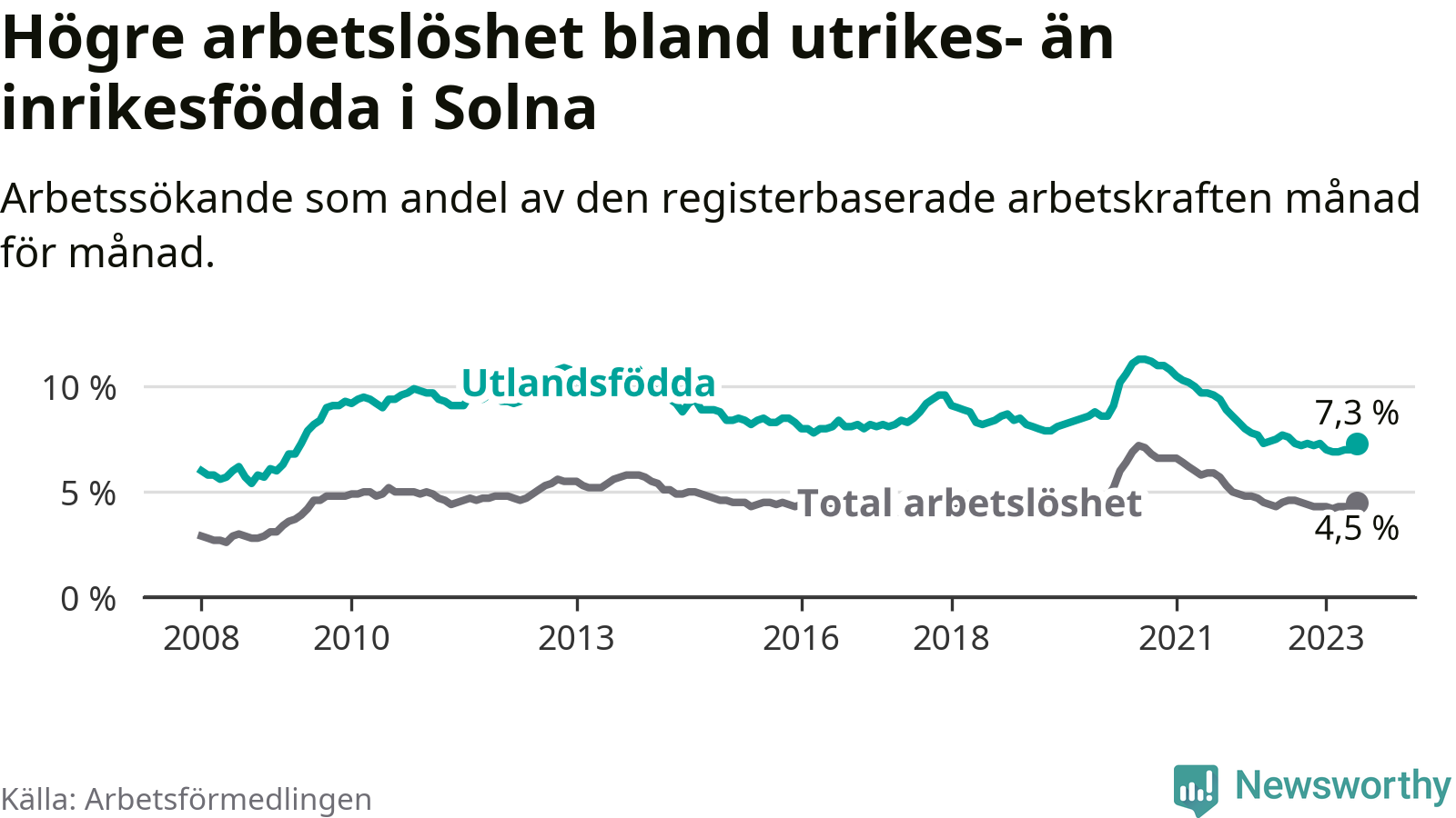 Skillnaden i arbetslöshet mellan utrikesfödda och hela befolkningen är 2,8 procentenheter i Solna.