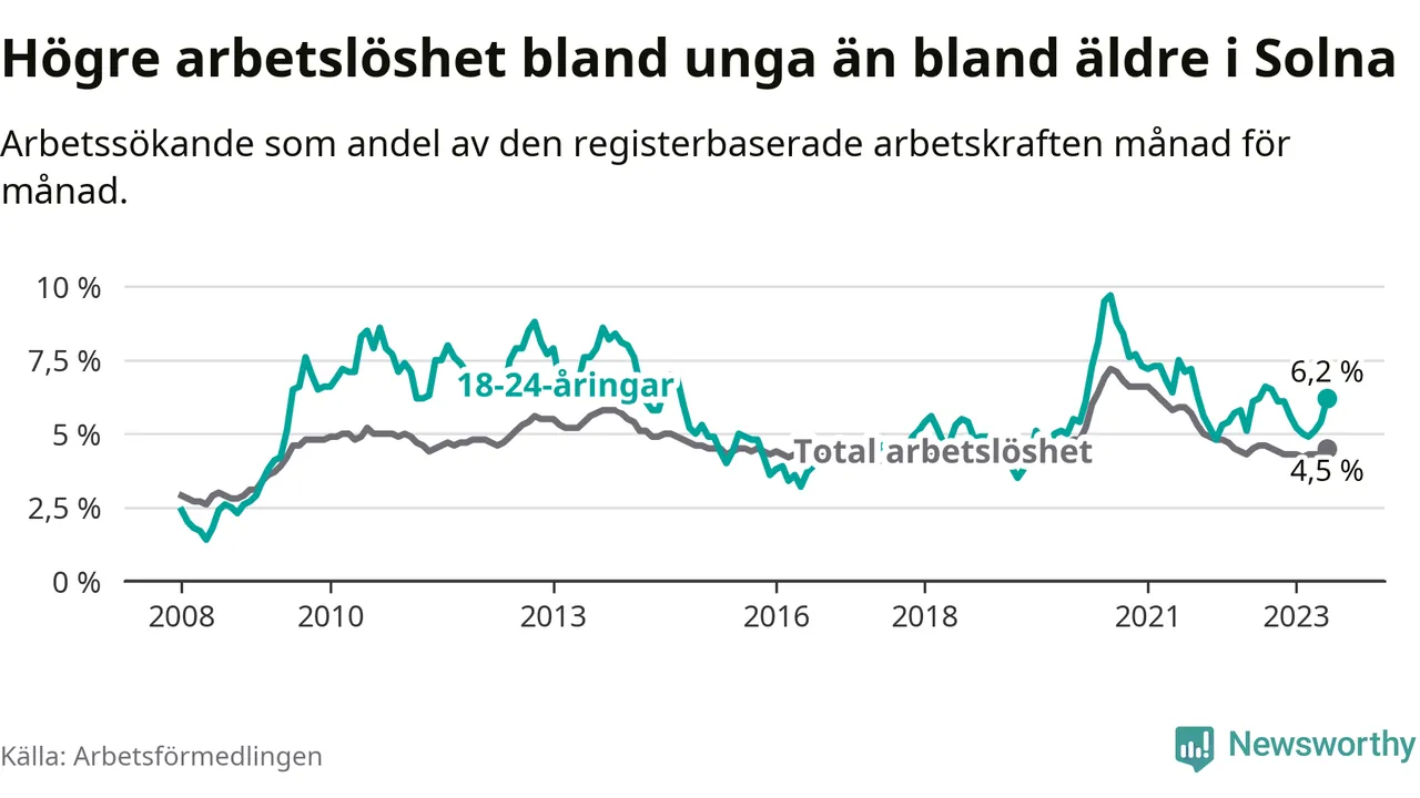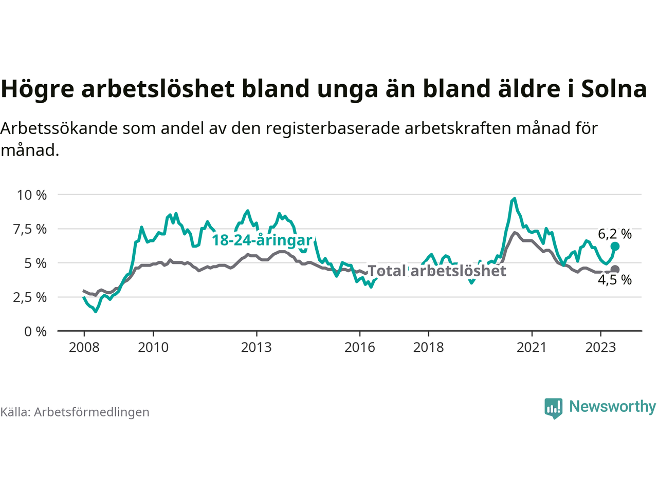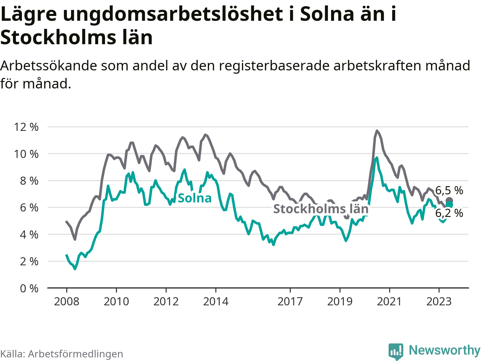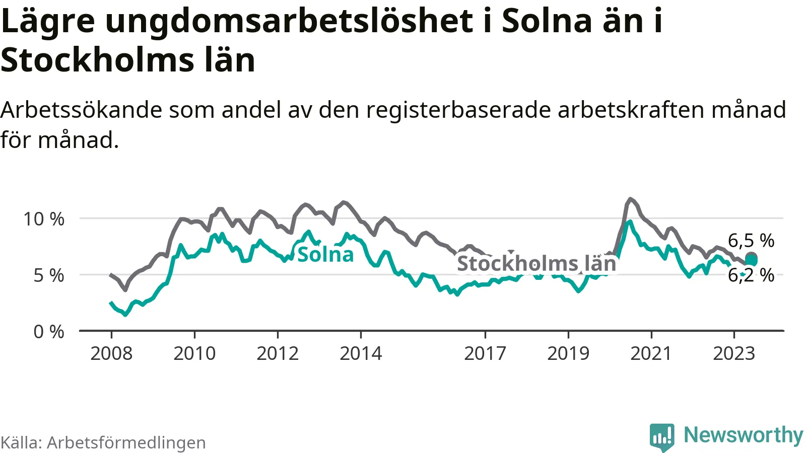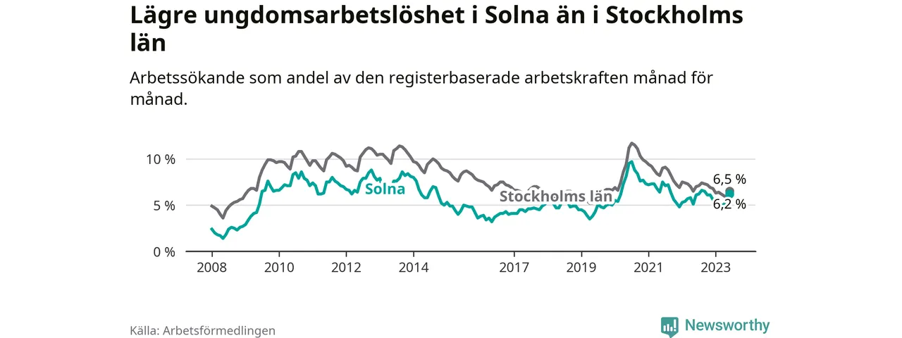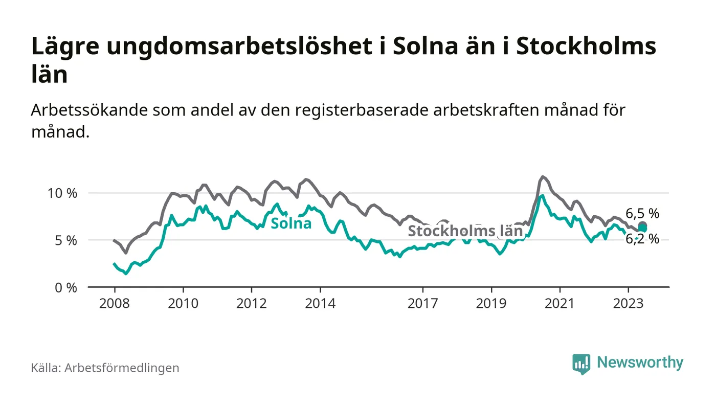 Precis som den totala arbetslösheten ligger ungdomsarbetslösheten i Solna lägre än i Stockholms län som helhet. Skillnaden mellan kommunen och länet är 0,3 procentenheter.
