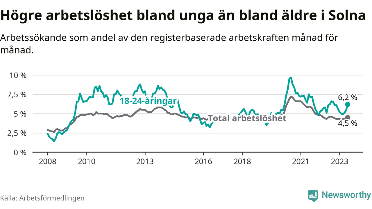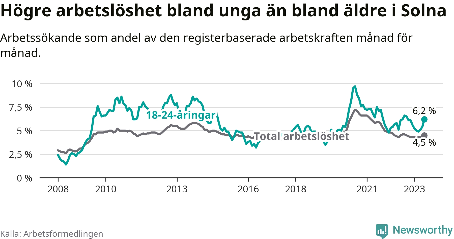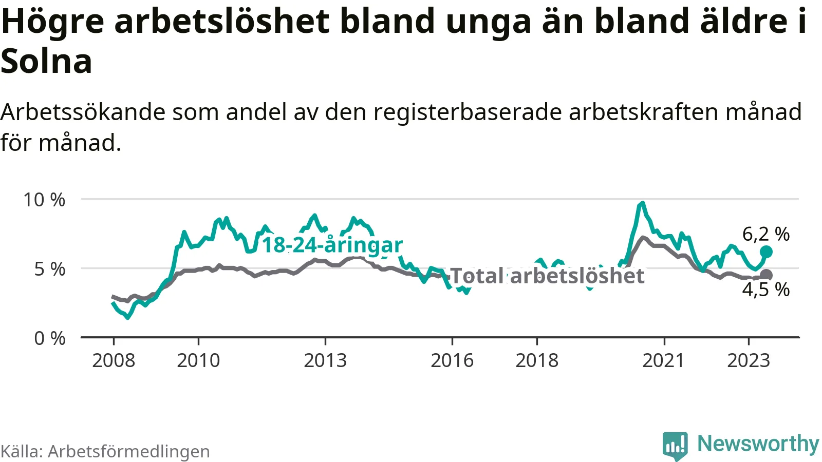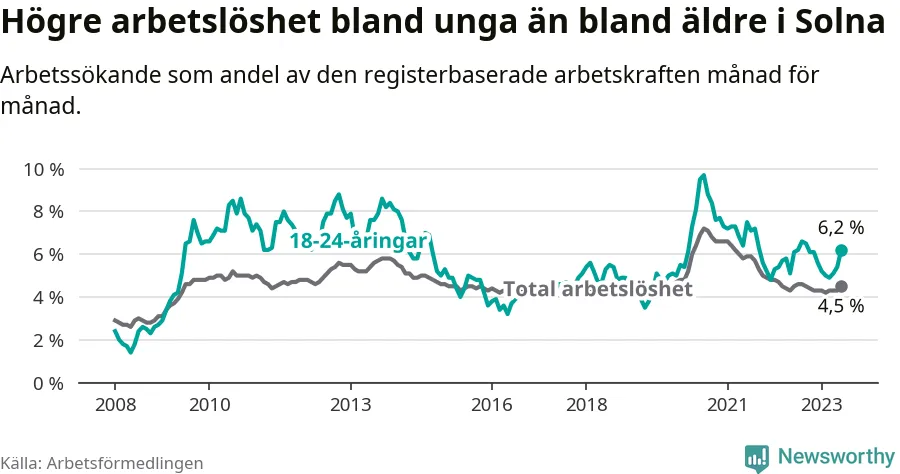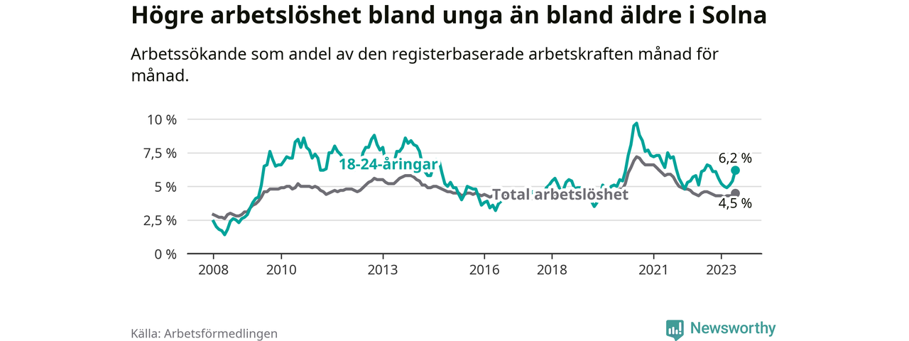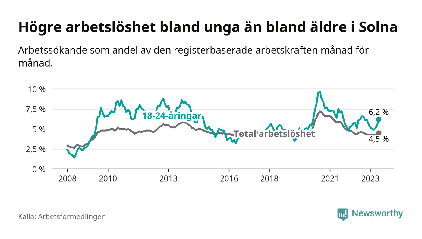 Sett till antalet personer betyder det att 2 136 av 47 467 invånare i åldern 16 till 651 år i Solna kommun var inskrivna som arbetssökande (84 fler än i juni i fjol).
