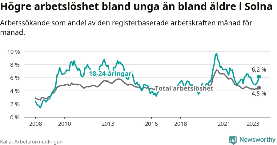 Till skillnad från den totala arbetslösheten stiger arbetslösheten bland unga (+0,1 procentenheter). I juni var 6,2 procent av 18–24-åringarna inskrivna som arbetssökande (motsvarande 208 personer). Mäter vi antalet inskrivna ser vi en ökning med 14 personer på ett års sikt.