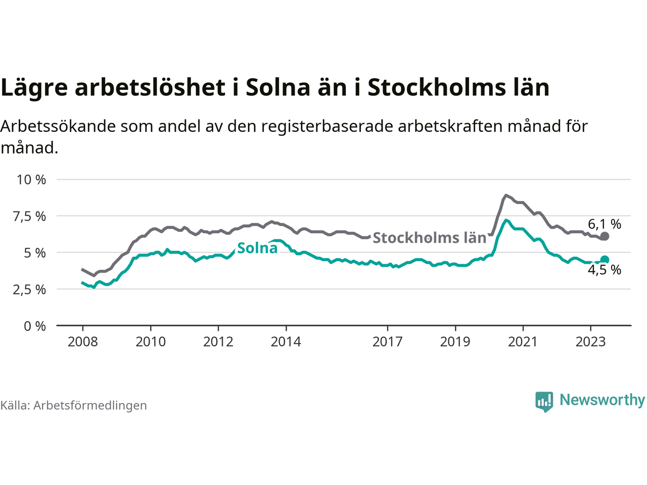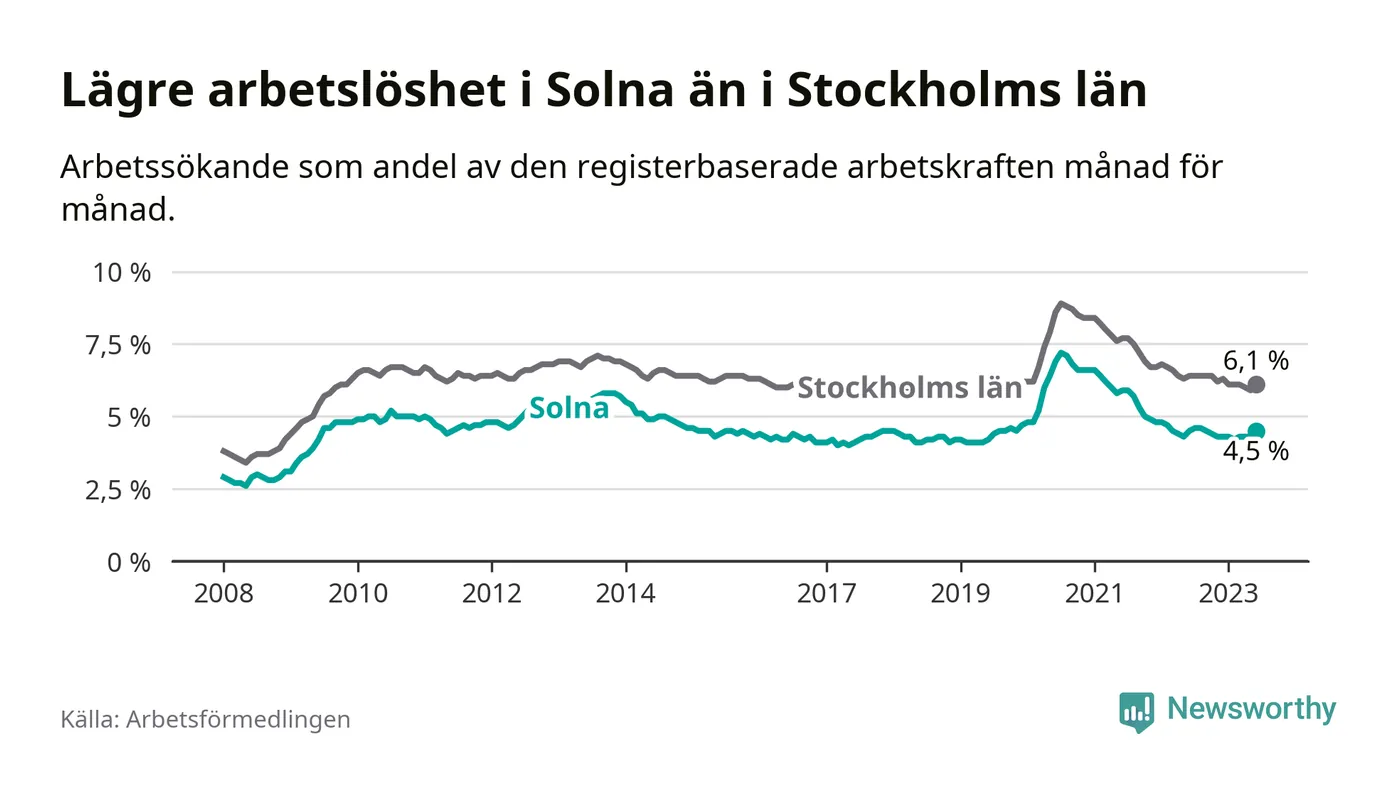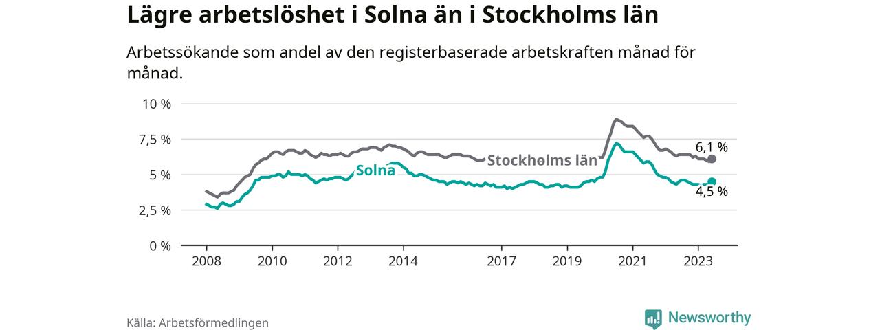 Under juni månad rapporterade Solna kommun en total arbetslöshet på 4,5 procent. Det är i samma nivå som i juni i fjol. I Stockholms län däremot sjunker arbetslösheten