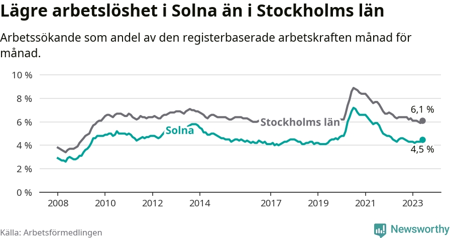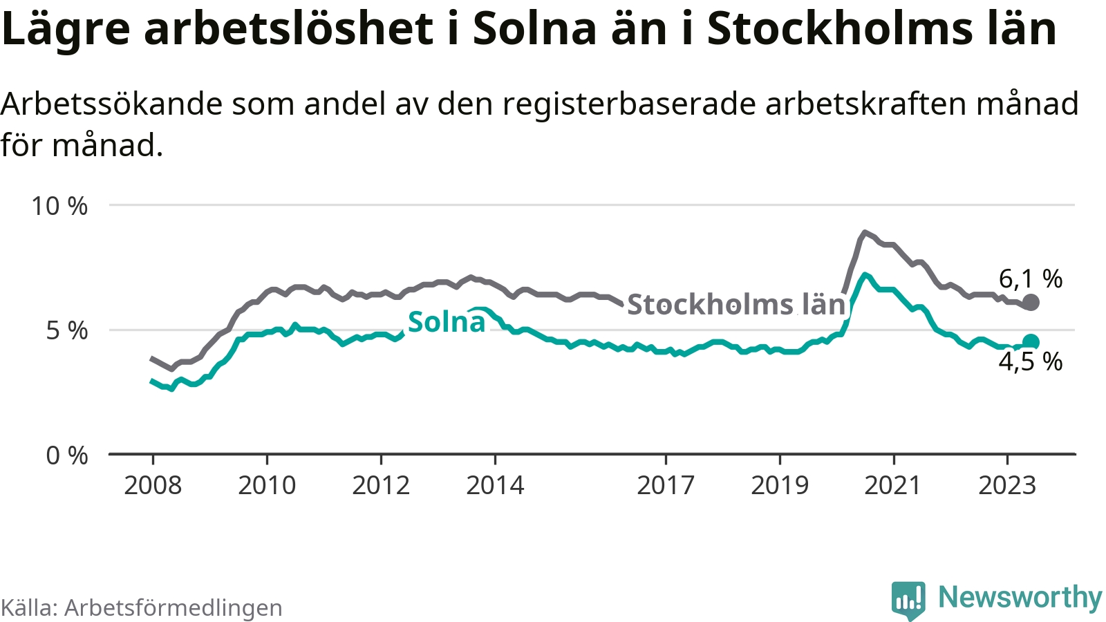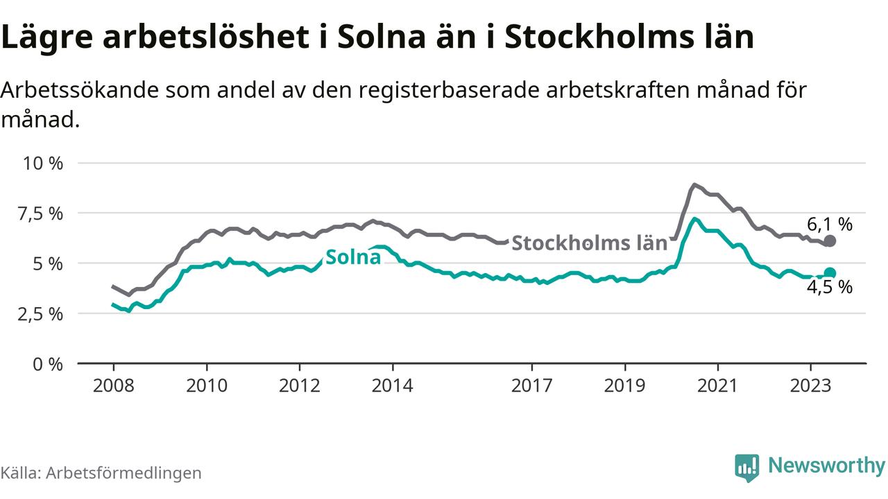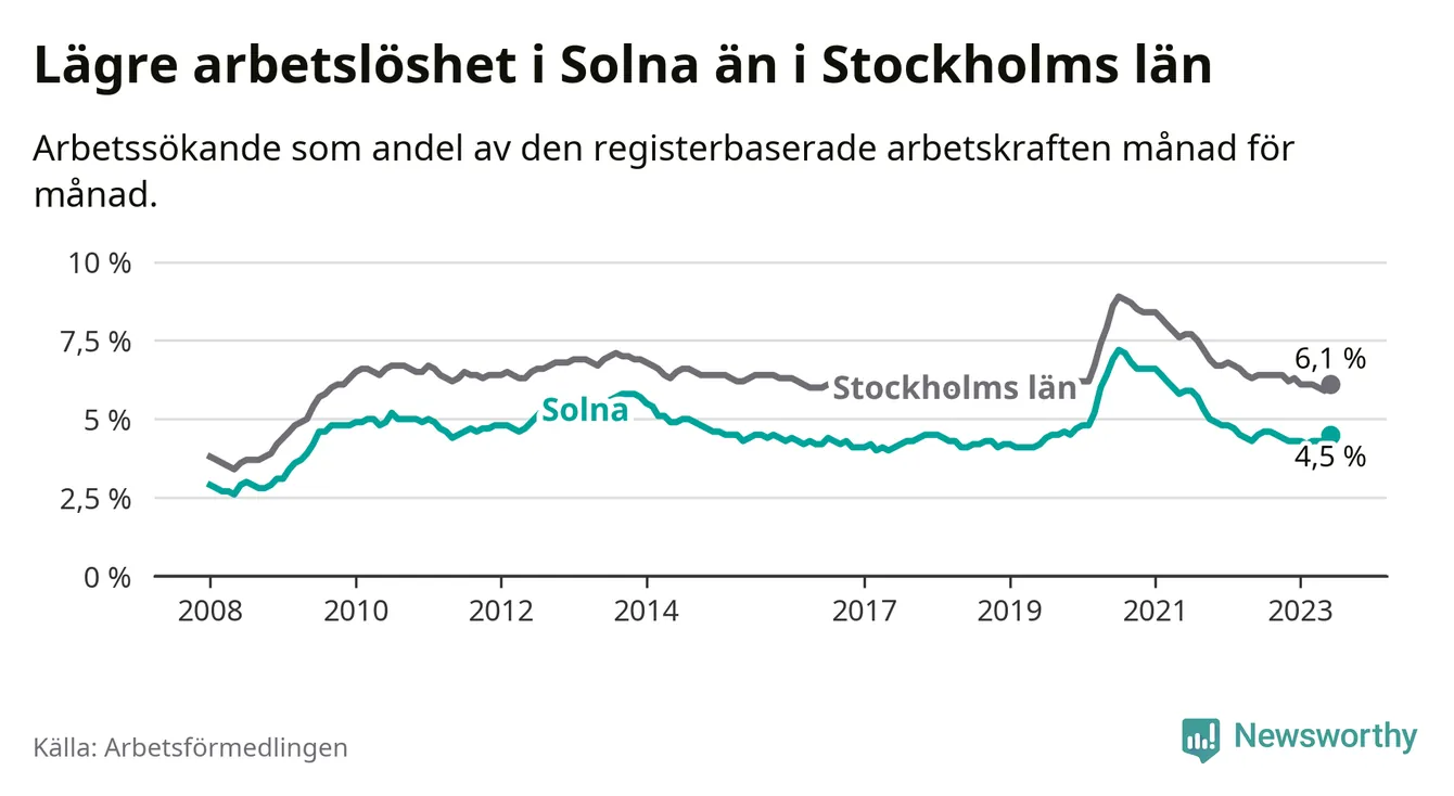 Under juni månad rapporterade Solna kommun en total arbetslöshet på 4,5 procent. Det är i samma nivå som i juni i fjol. I Stockholms län däremot sjunker arbetslösheten
