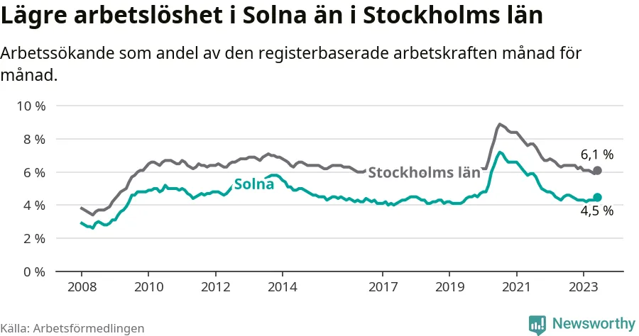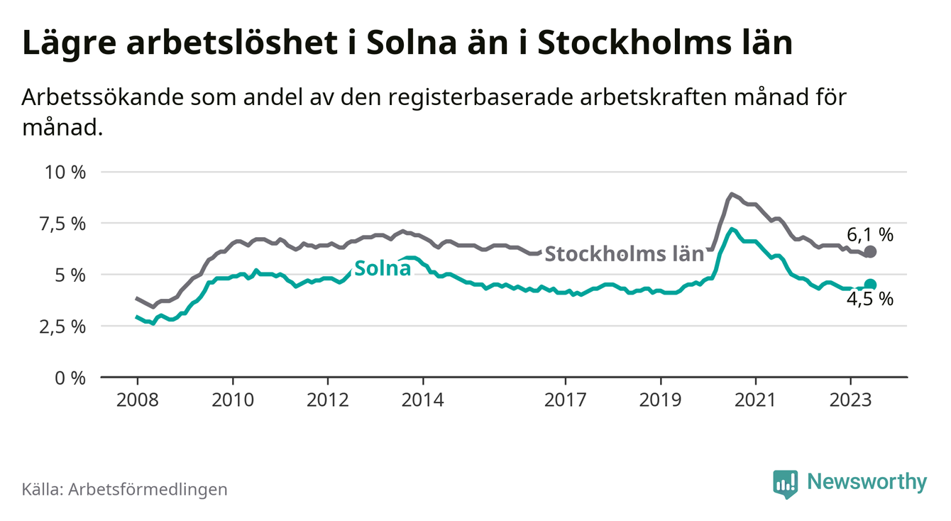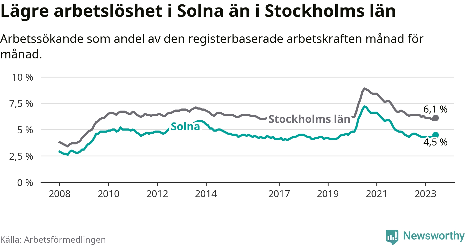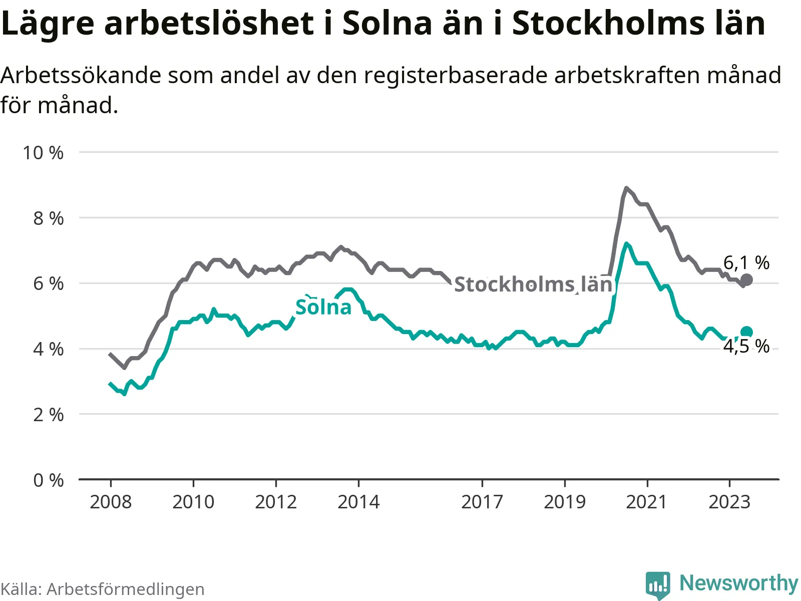 Solna går därmed mot strömmen i förhållande till andra kommuner i Stockholms län. I de flesta andra kommuner i länet går arbetslösheten nedåt. Störst är minskningen i Södertälje, där arbetslösheten sjunker med 1,2 procentenheter. I tabellen längre ner ser du utvecklingen i samtliga kommuner i länet.