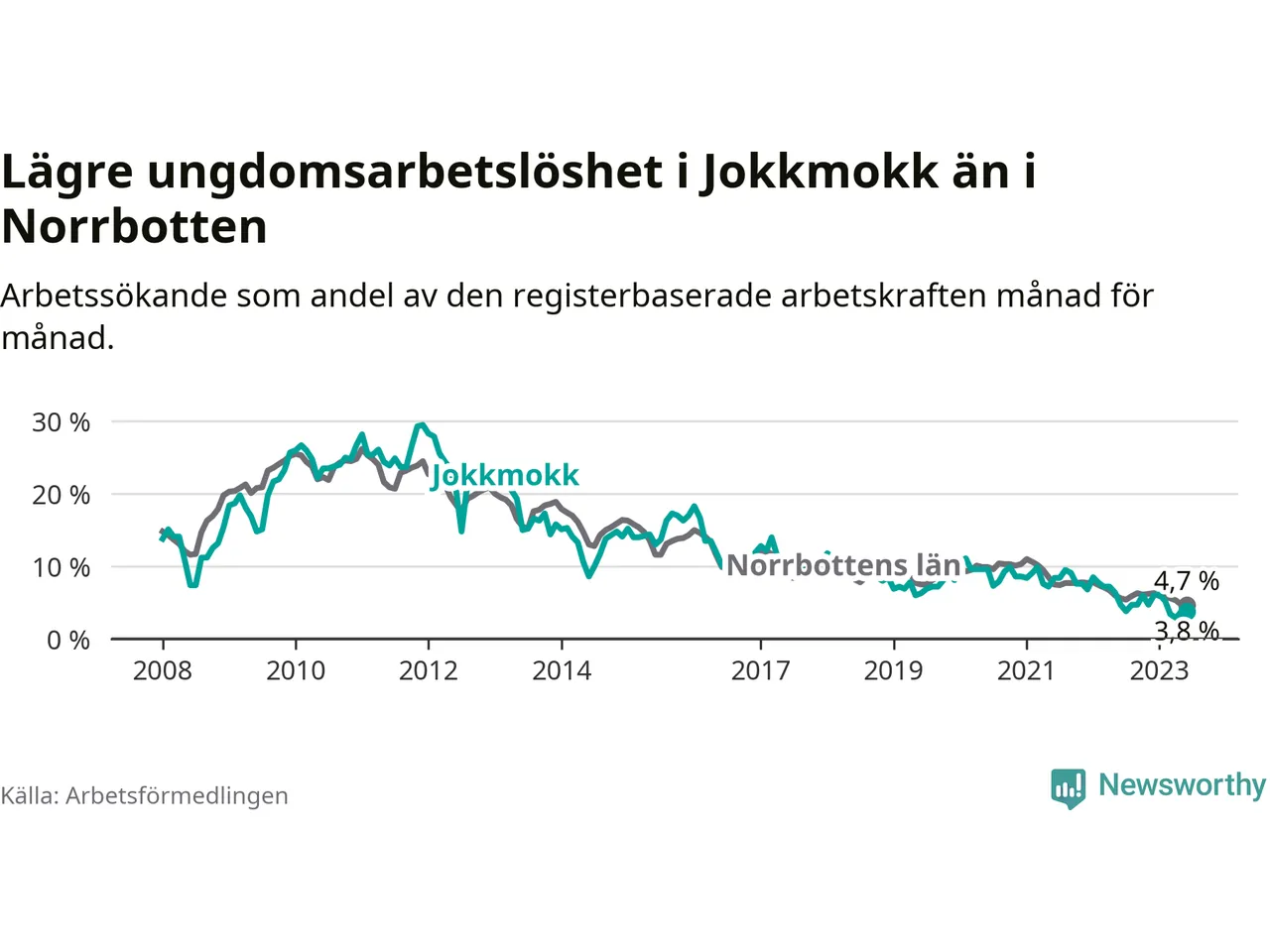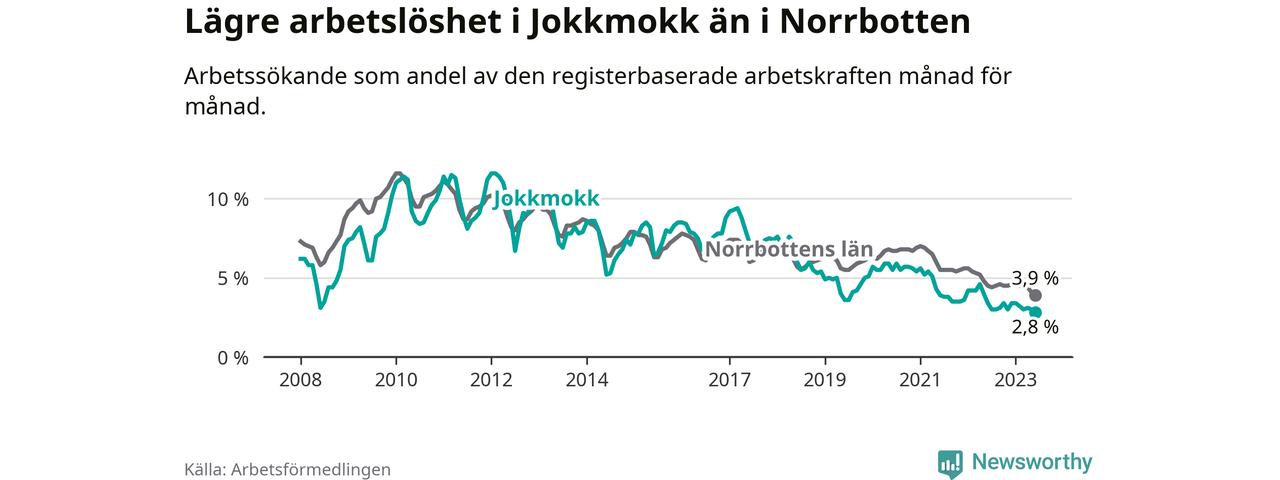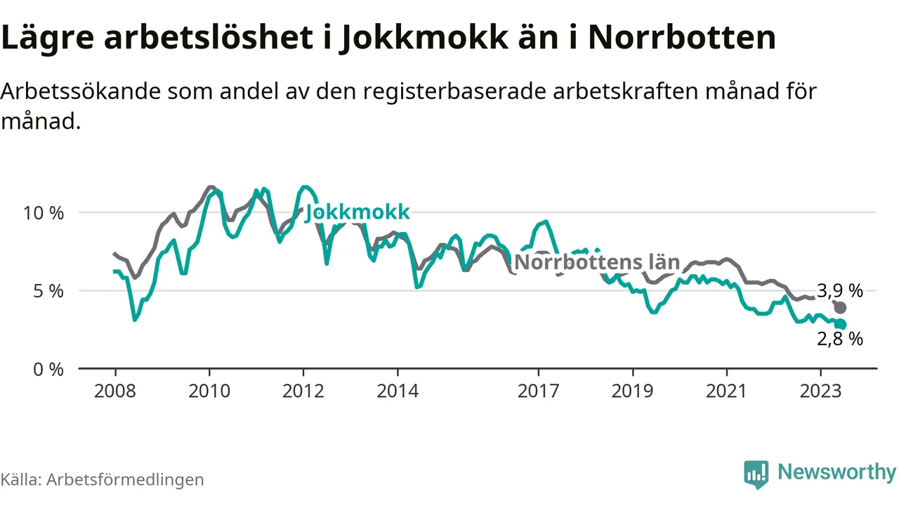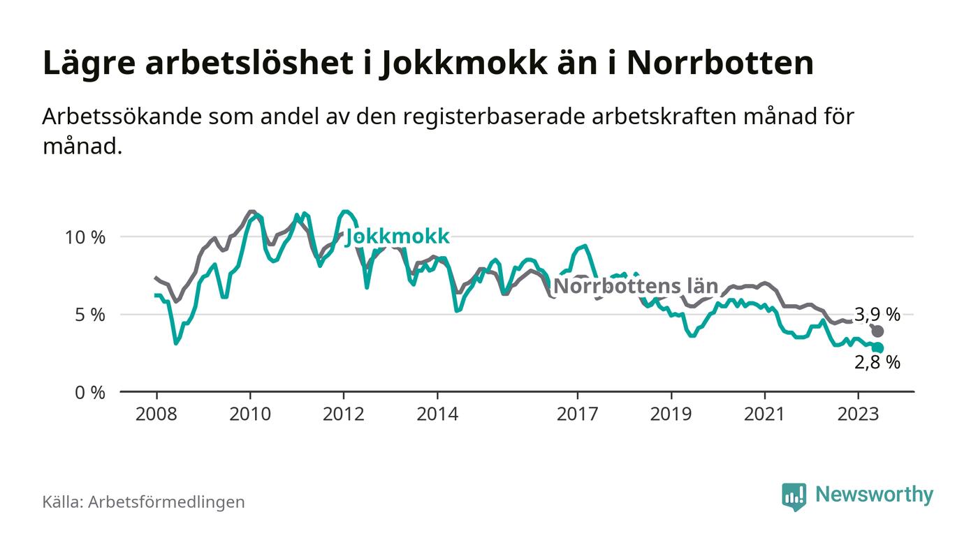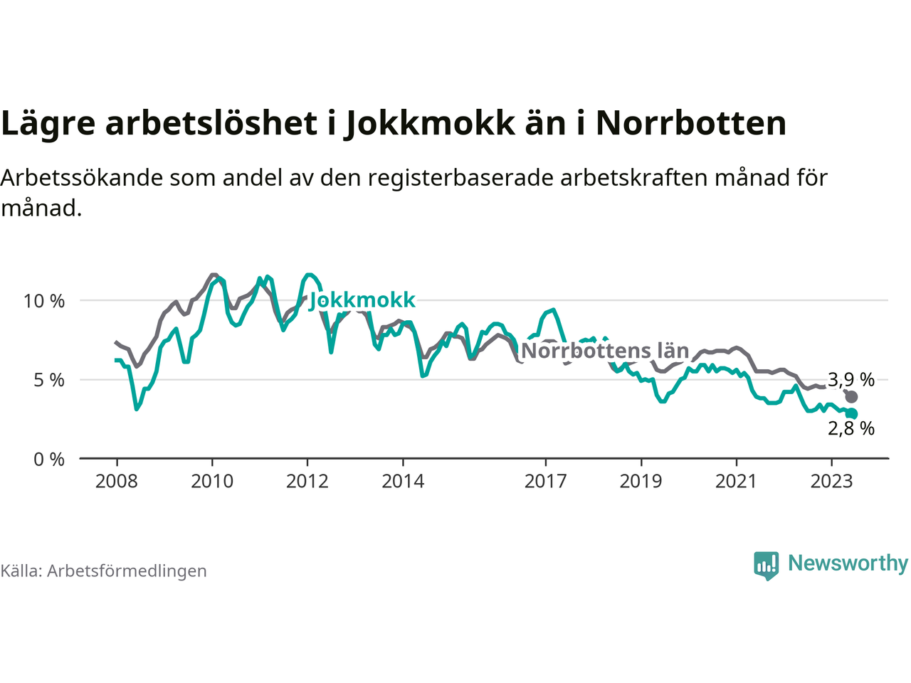Det är 30:e månaden i följd som arbetslösheten i Jokkmokk är lägre än den var under samma tidpunkt året innan. Sedan december 2020 har arbetslösheten gått ner från 5,4 till 2,8 procent. Den nuvarande arbetslöshetsnivån är därmed den lägsta sedan januari 2008.