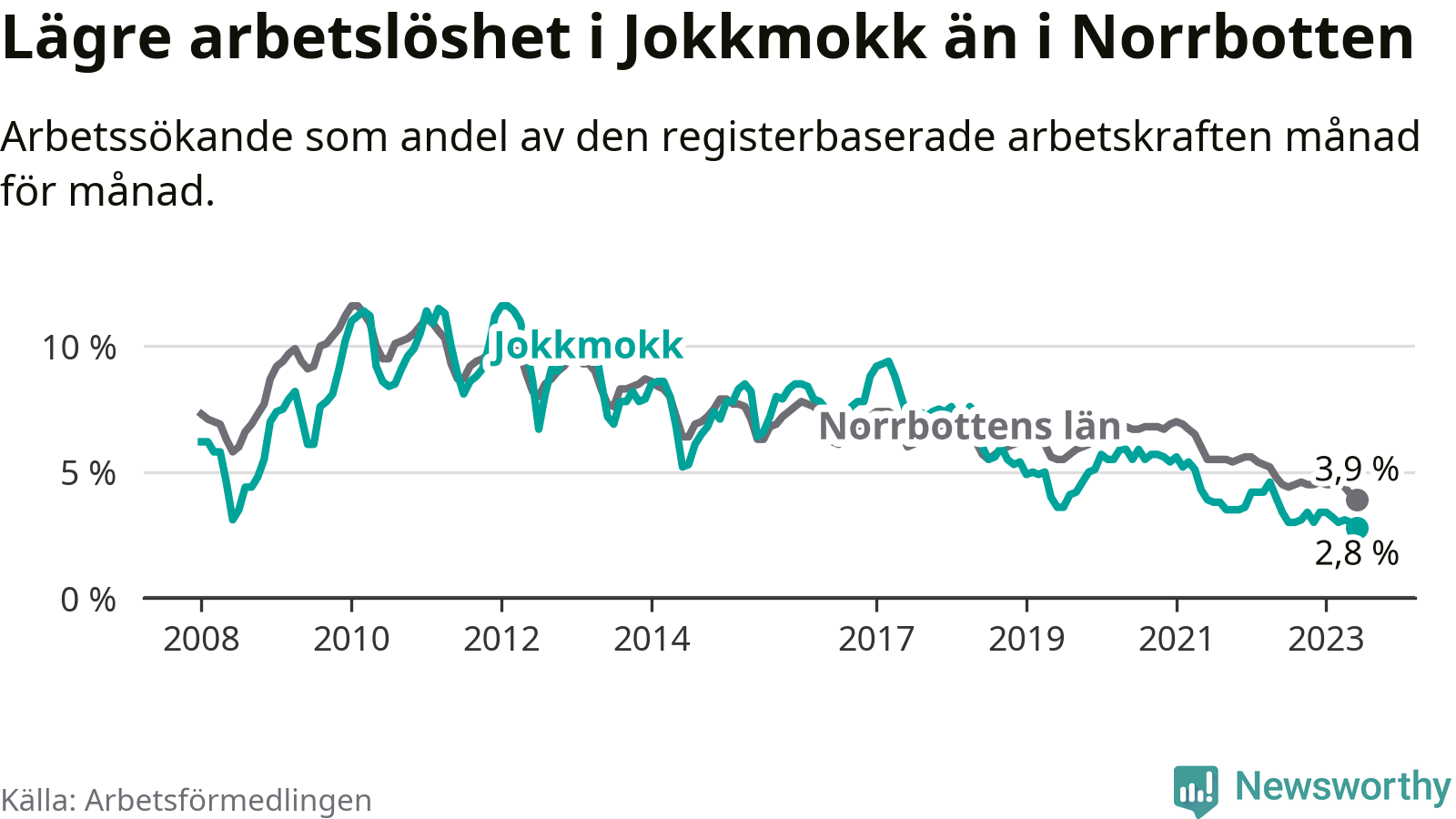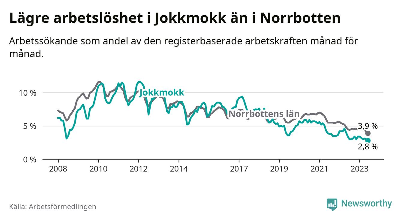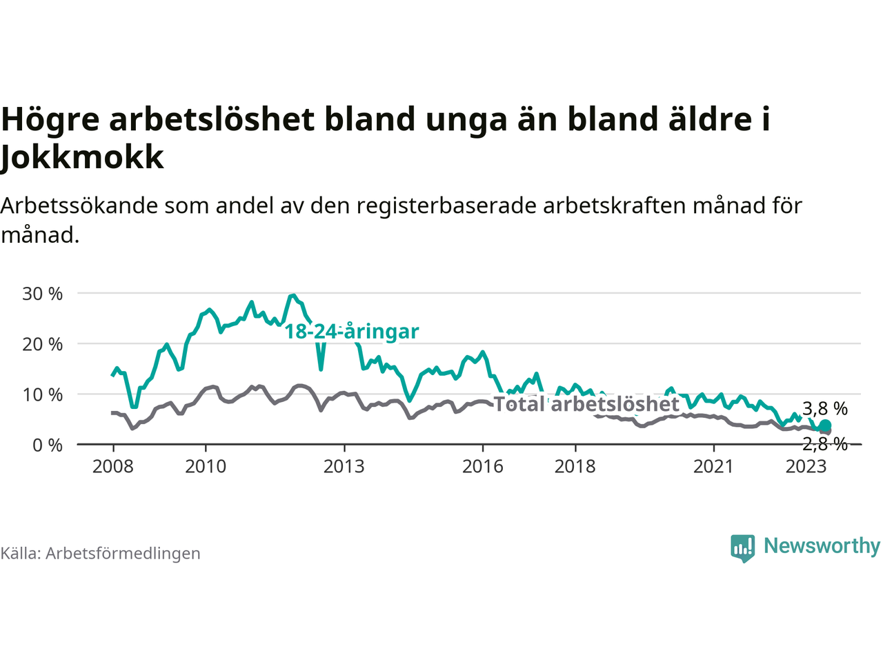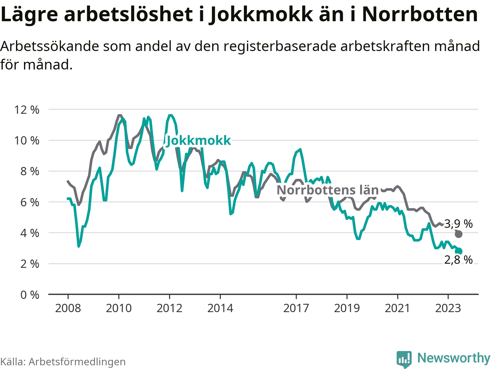 Det är 30:e månaden i följd som arbetslösheten i Jokkmokk är lägre än den var under samma tidpunkt året innan. Sedan december 2020 har arbetslösheten gått ner från 5,4 till 2,8 procent. Den nuvarande arbetslöshetsnivån är därmed den lägsta sedan januari 2008.