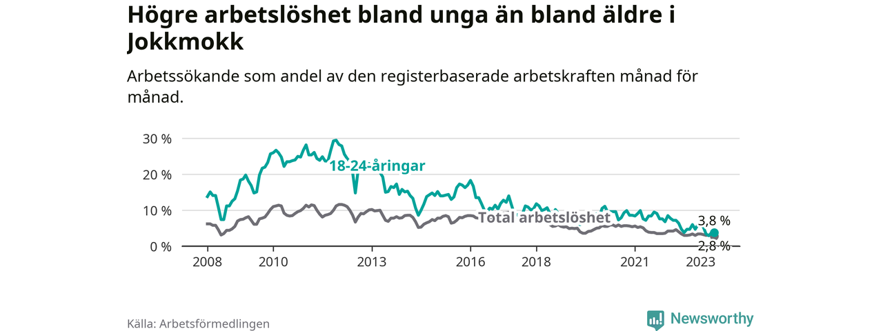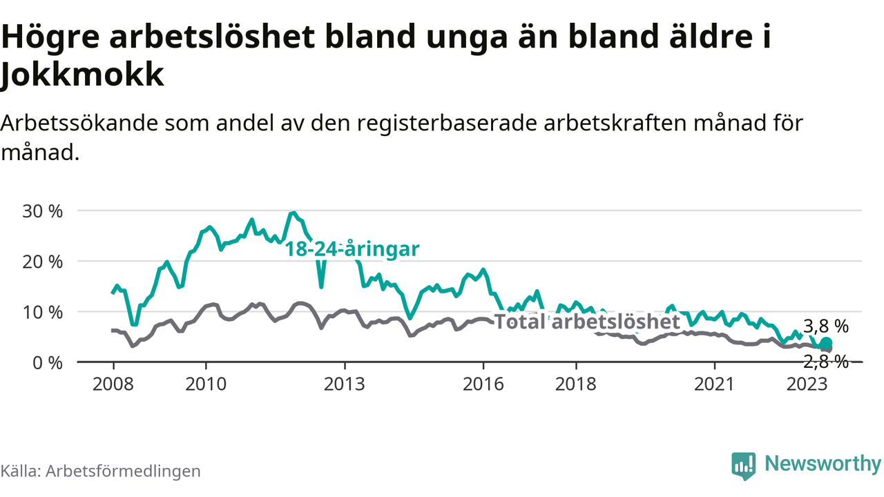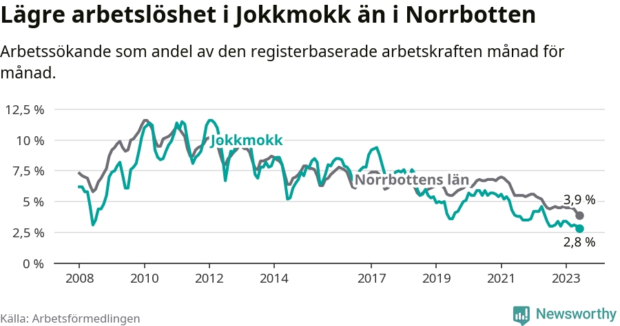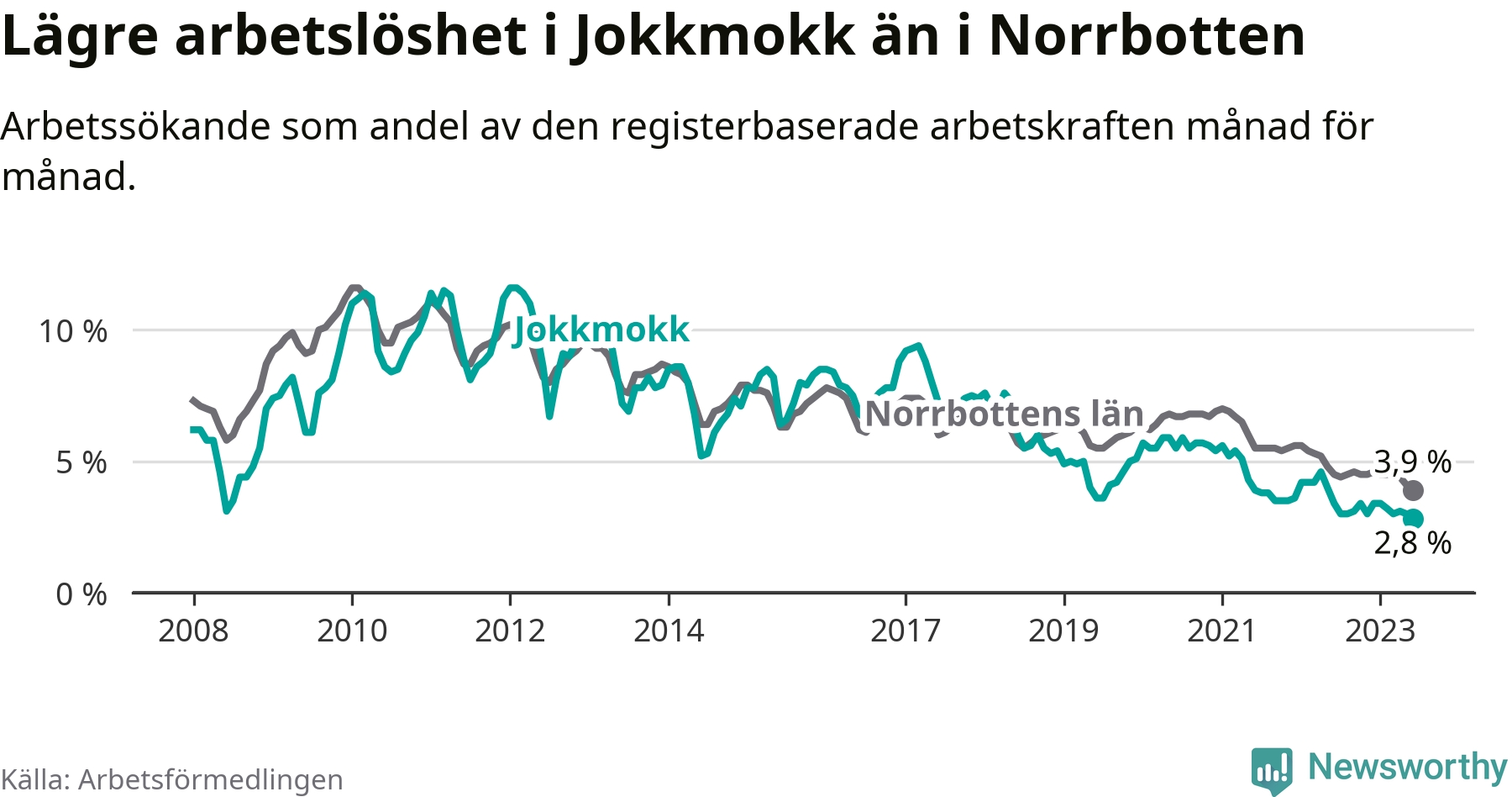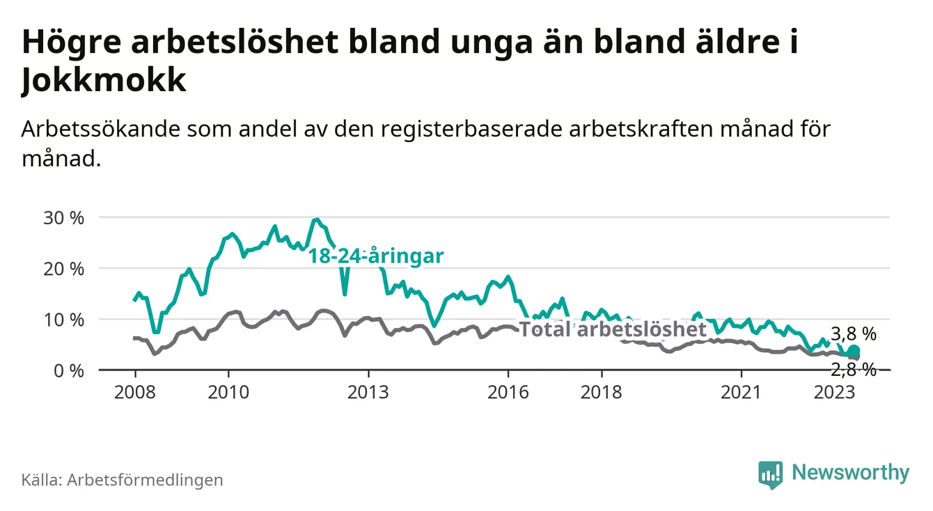 Det är 30:e månaden i följd som arbetslösheten i Jokkmokk är lägre än den var under samma tidpunkt året innan. Sedan december 2020 har arbetslösheten gått ner från 5,4 till 2,8 procent. Den nuvarande arbetslöshetsnivån är därmed den lägsta sedan januari 2008.