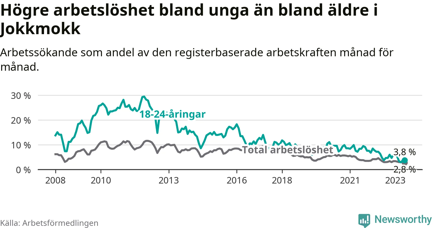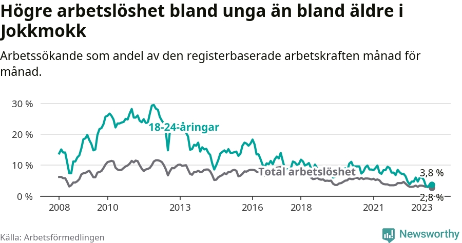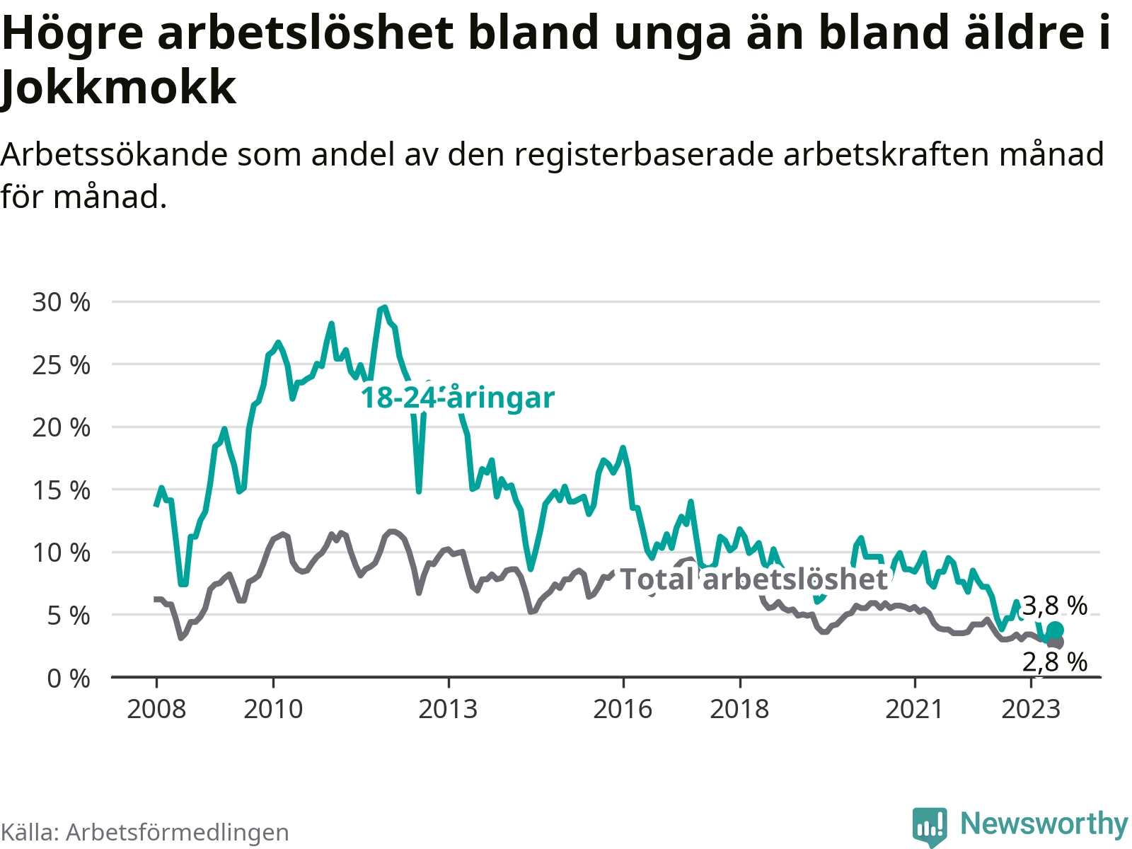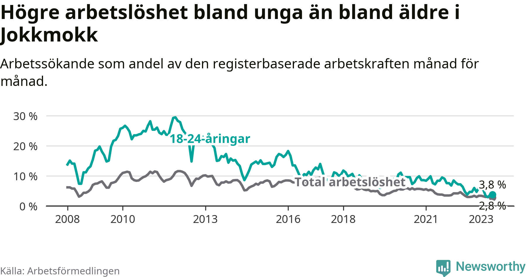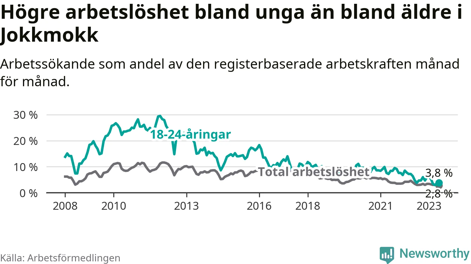 Det är 30:e månaden i följd som arbetslösheten i Jokkmokk är lägre än den var under samma tidpunkt året innan. Sedan december 2020 har arbetslösheten gått ner från 5,4 till 2,8 procent. Den nuvarande arbetslöshetsnivån är därmed den lägsta sedan januari 2008.