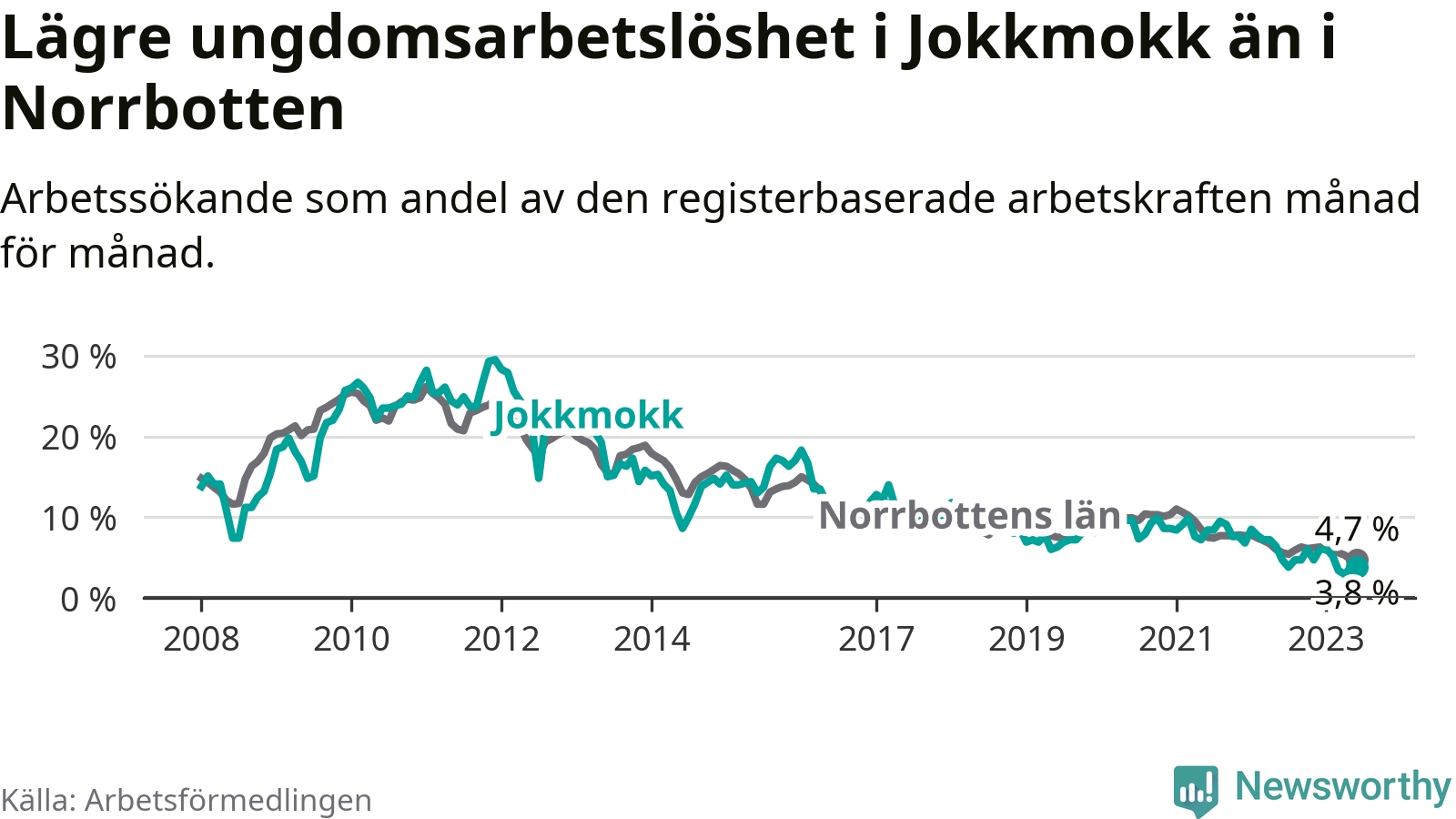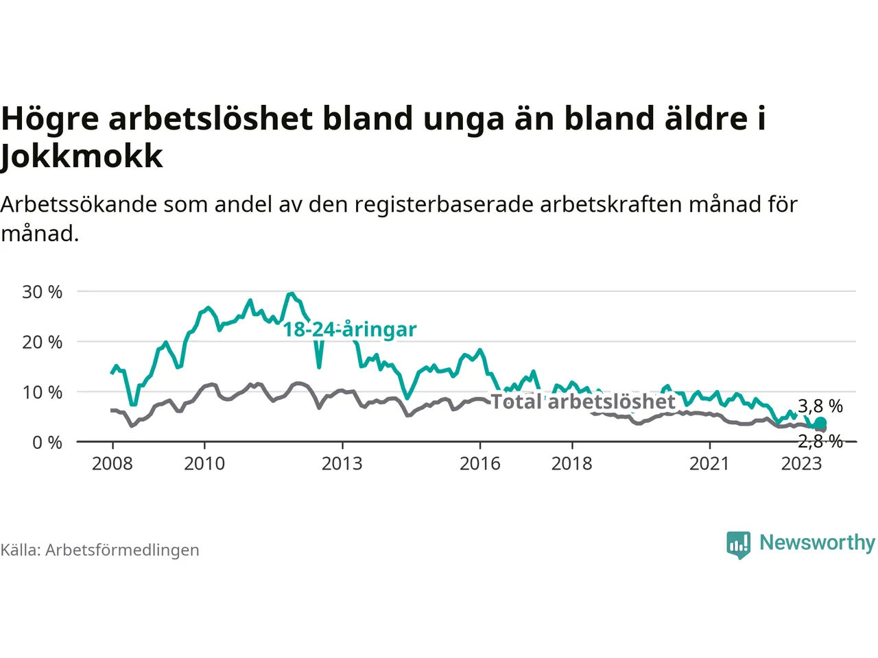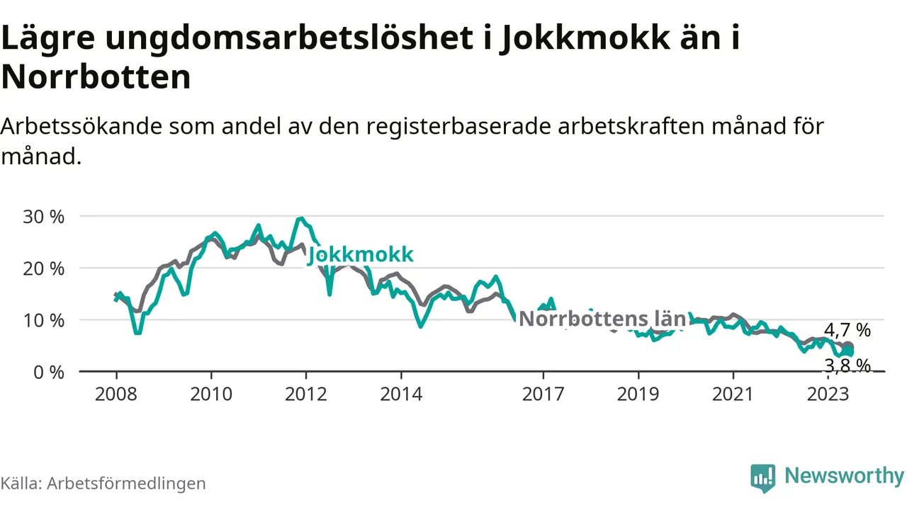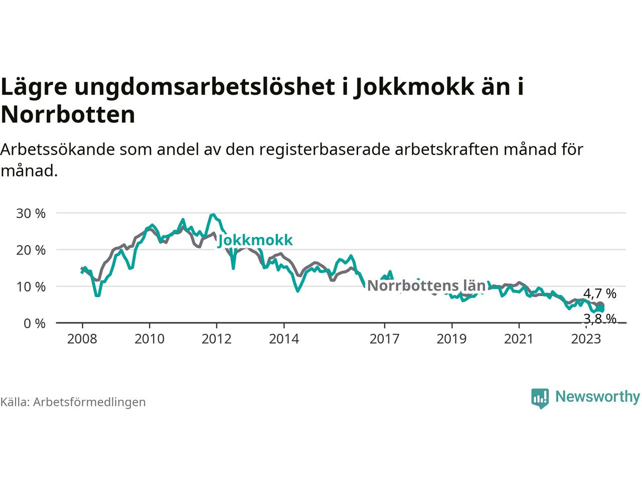 I och med den senaste månadens nedgång har de ungas arbetslöshet i Jokkmokk sjunkit 17 månader i följd (ner från 8,5 procent i januari 2022 till 3,8 procent nu).