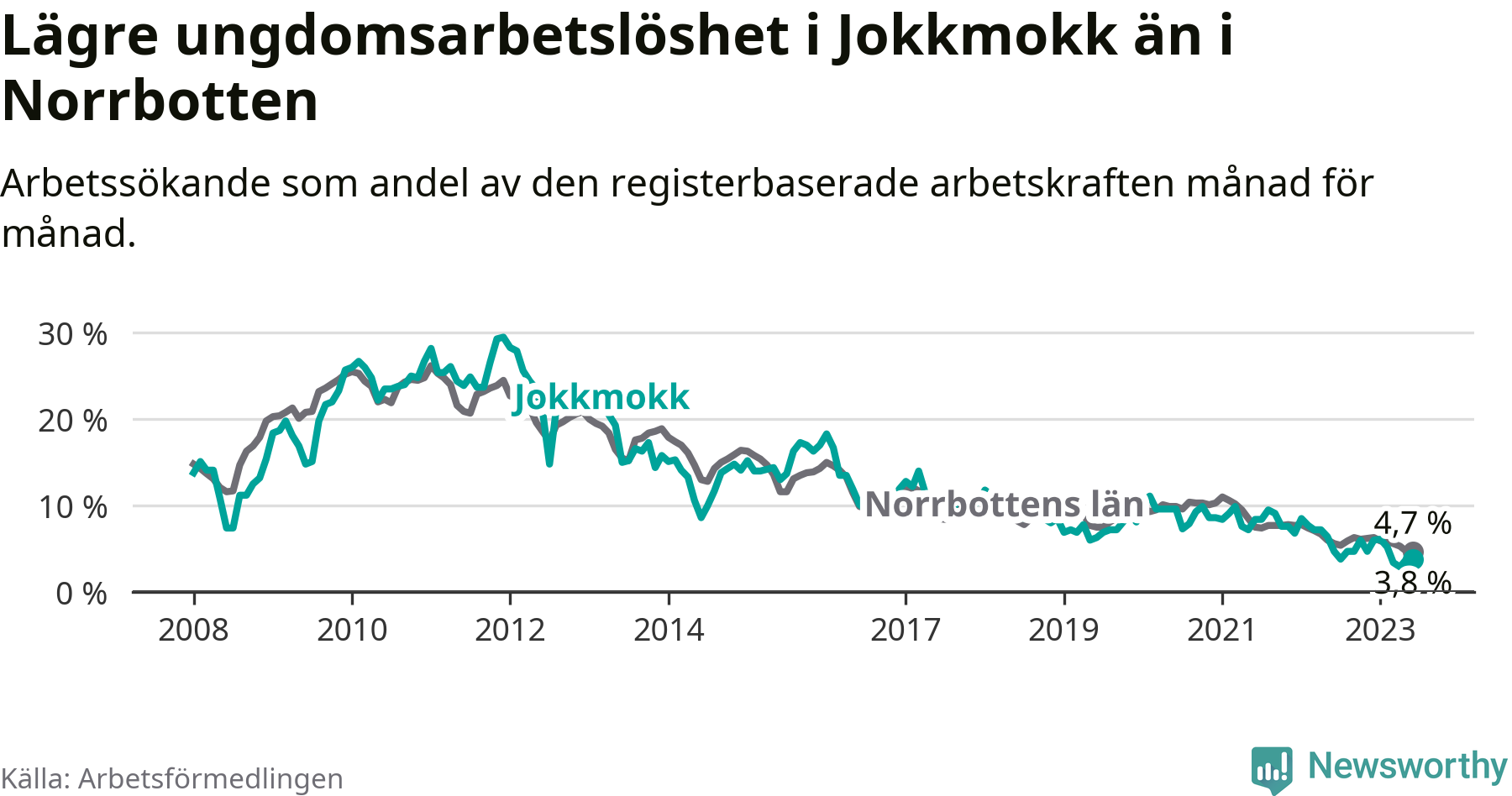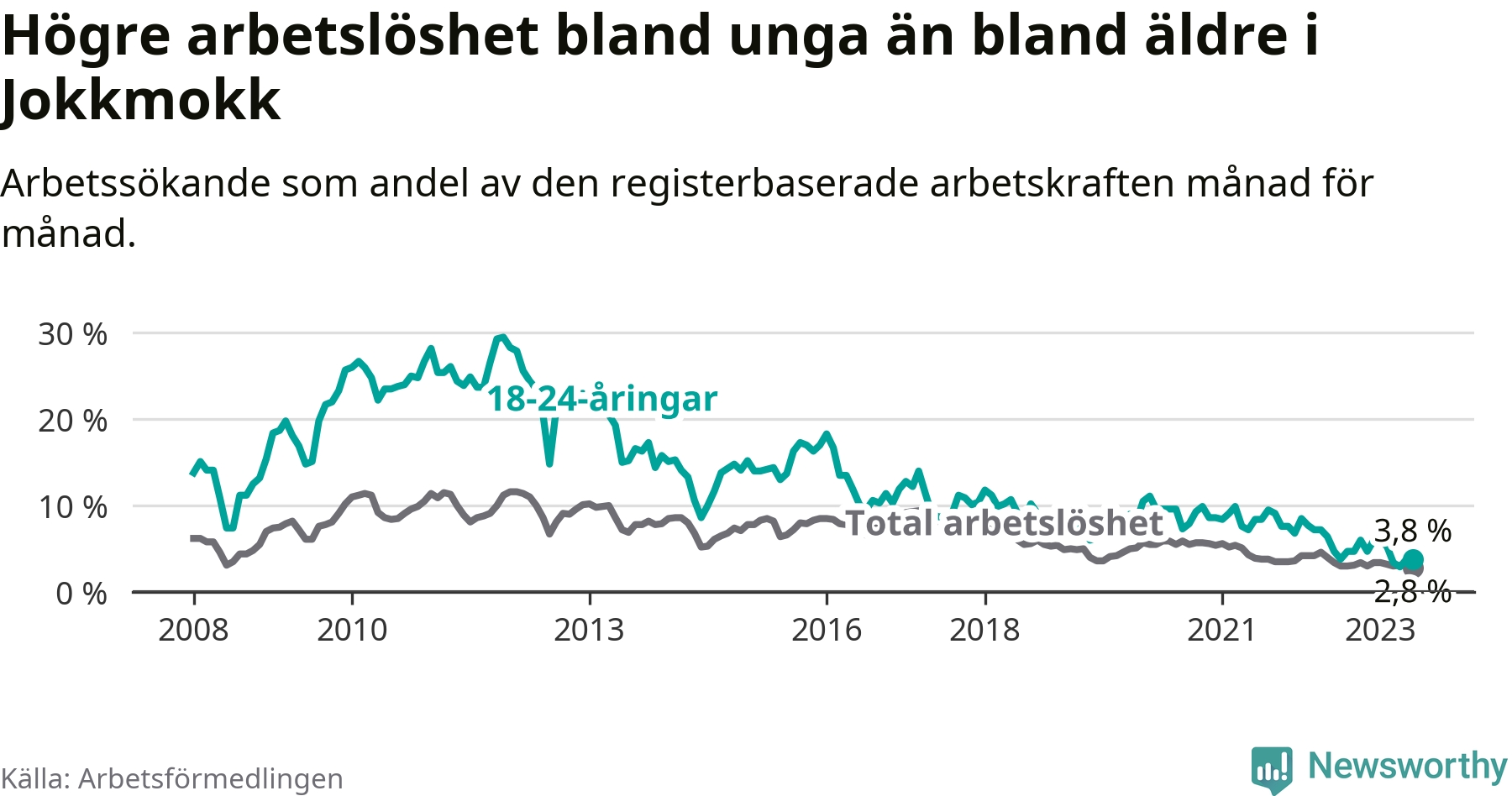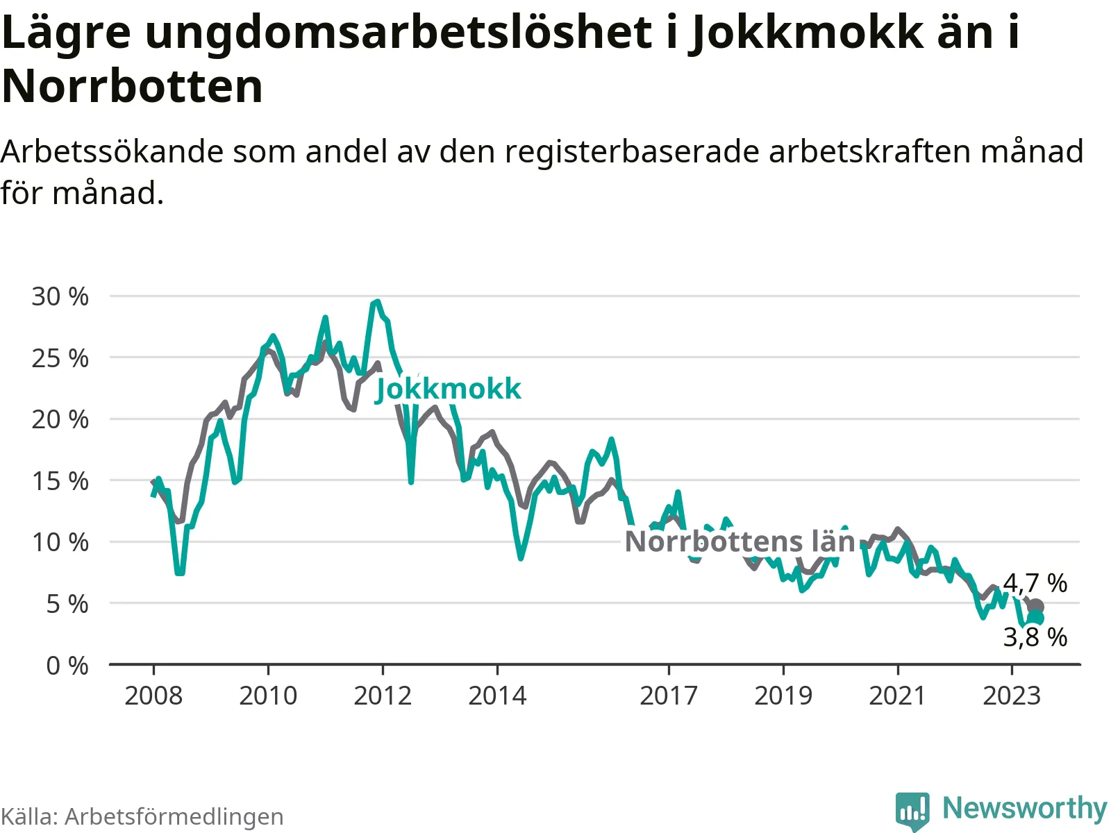 I och med den senaste månadens nedgång har de ungas arbetslöshet i Jokkmokk sjunkit 17 månader i följd (ner från 8,5 procent i januari 2022 till 3,8 procent nu).