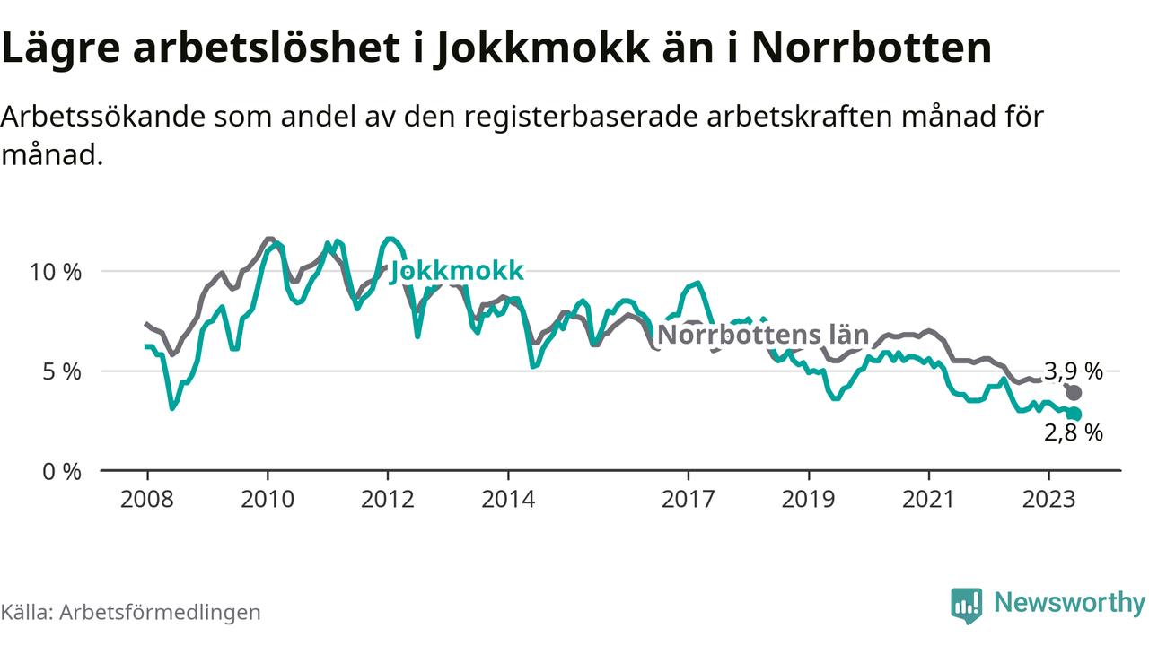 Perstorp är den kommun som har högst arbetslöshet just nu (12,3 procent) i landet som helhet, medan Kiruna har den lägsta (2,2 procent). Jokkmokks arbetslöshet sticker ut som den nionde lägsta i hela landet.