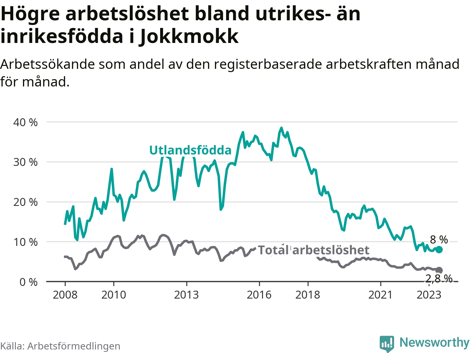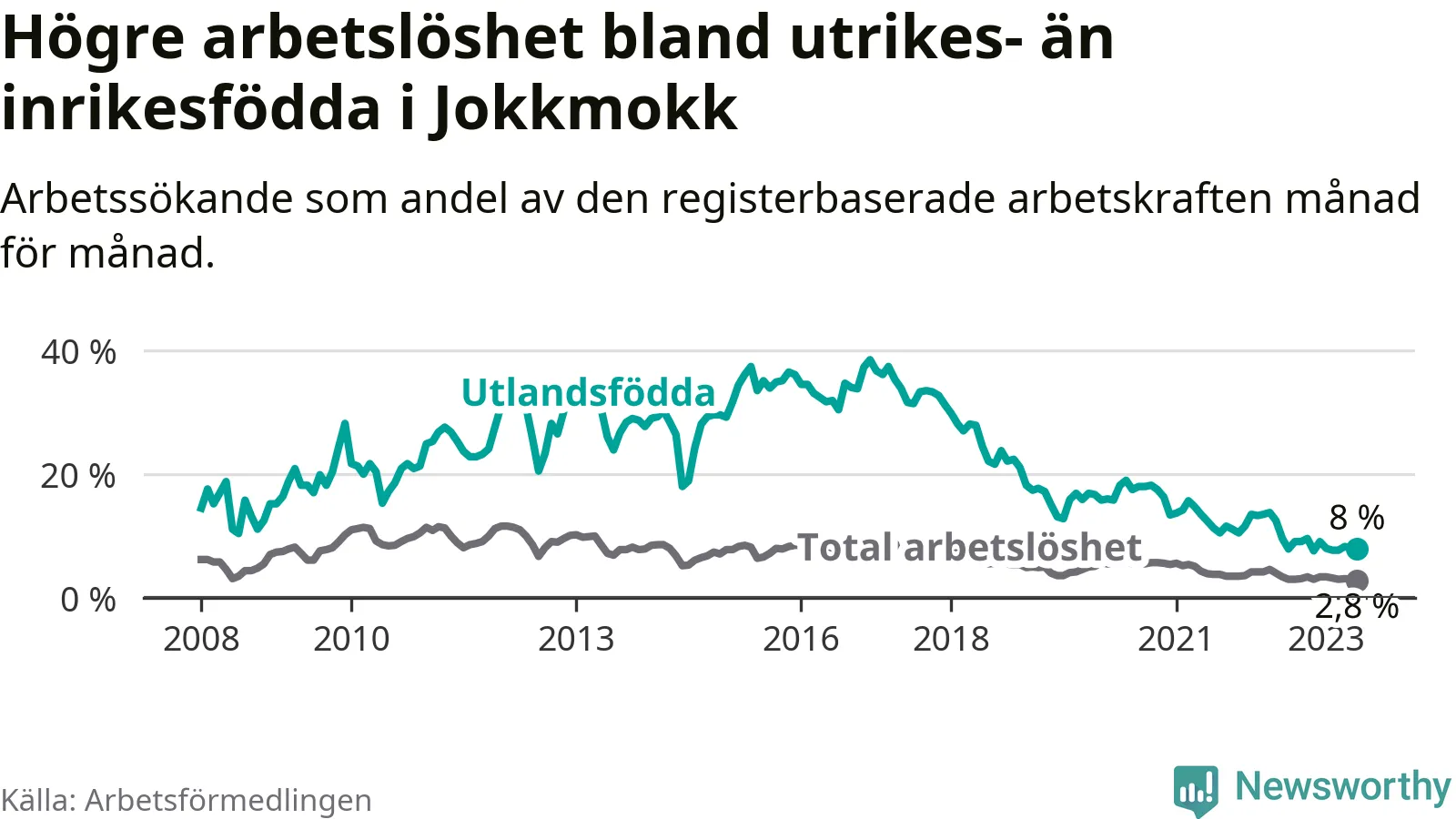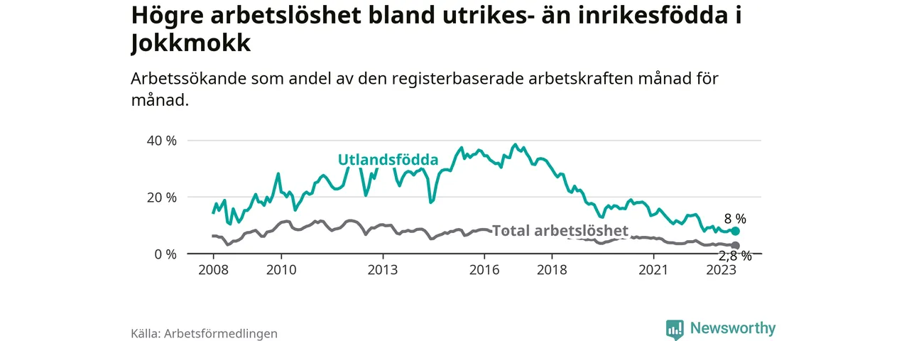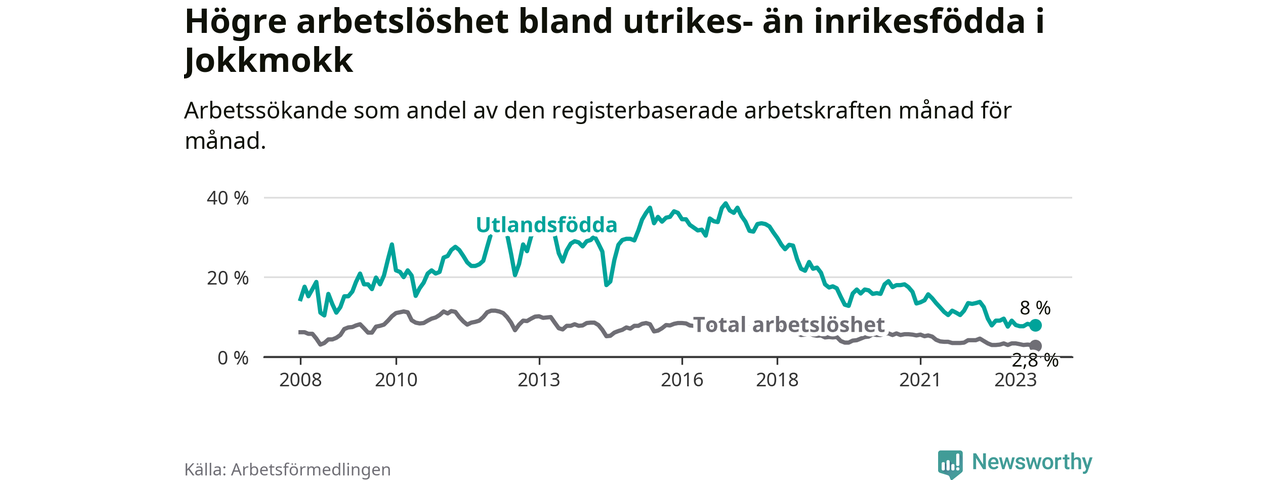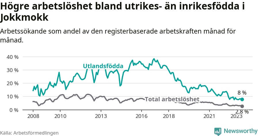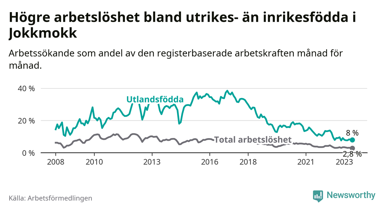 Arbetslösheten bland utlandsfödda var 8,0 procent i Jokkmokk under juni månad, motsvarande 26 av 325 personer. Det är 1,6 procentenheter färre än vid samma tidpunkt i fjol (−4 om man räknar personer). Därmed har de utlandsföddas arbetslöshet varit lägre än vid samma tidpunkt i fjol i över två år i sträck. Sedan oktober 2020 har arbetslösheten bland utlandsfödda minskat från 17,5 till 8,0 procent.