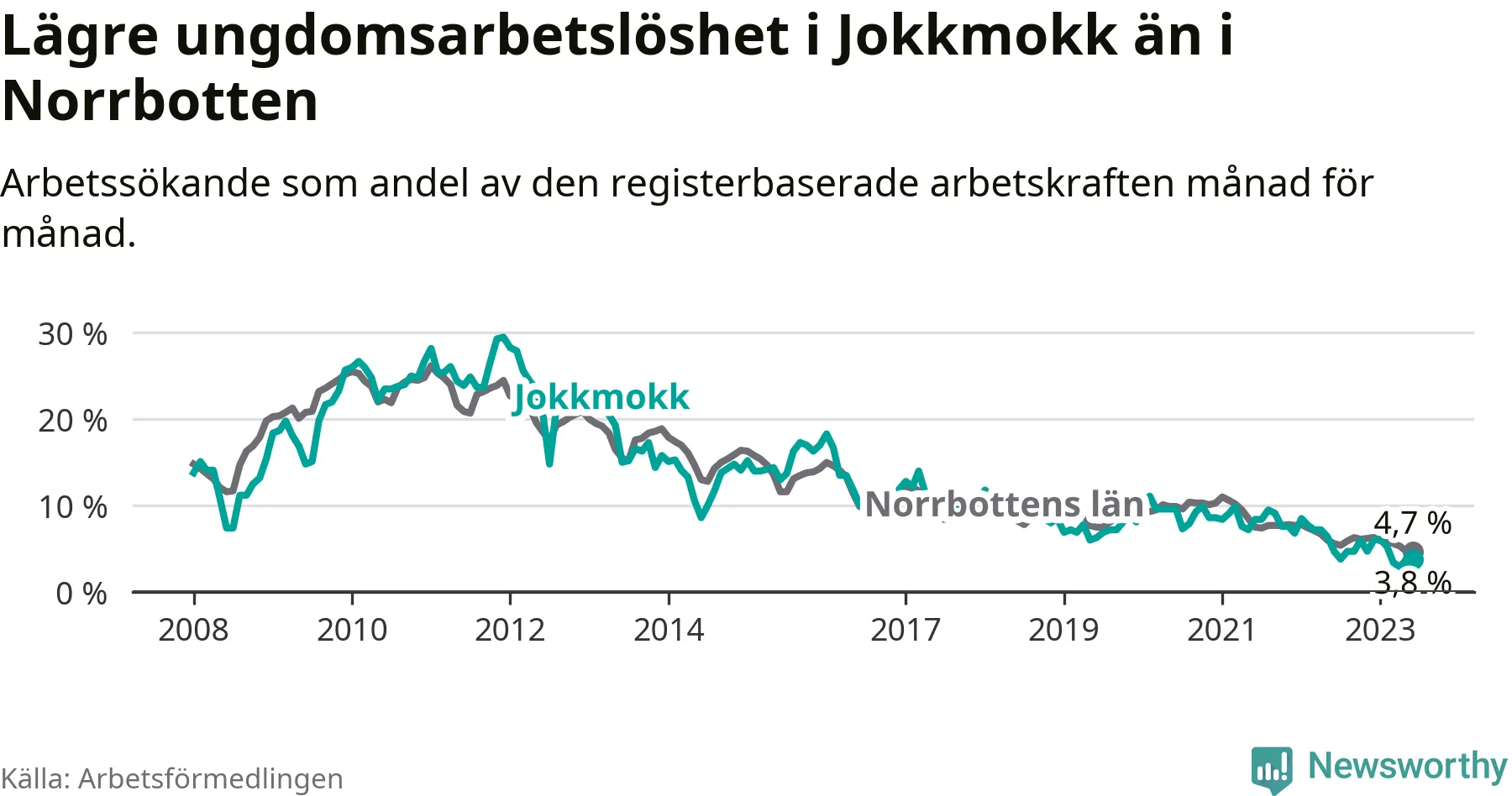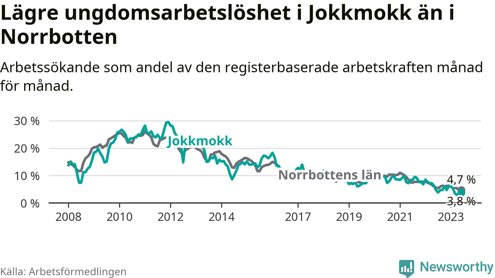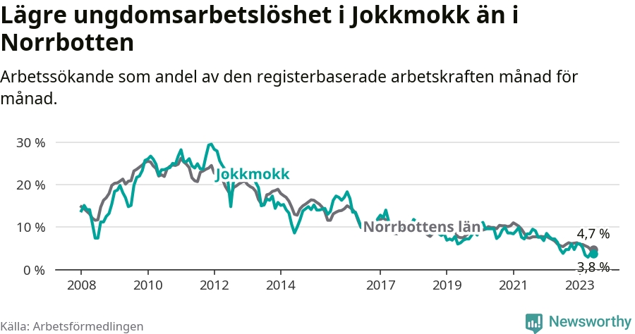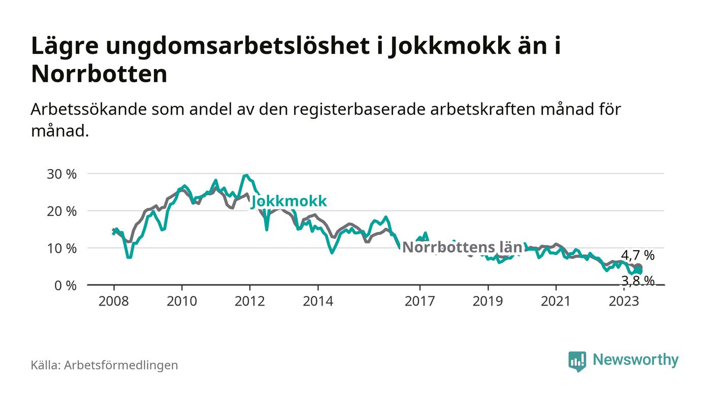 Precis som den totala arbetslösheten ligger ungdomsarbetslösheten i Jokkmokk lägre än i Norrbotten som helhet. Skillnaden mellan kommunen och länet är 0,9 procentenheter.