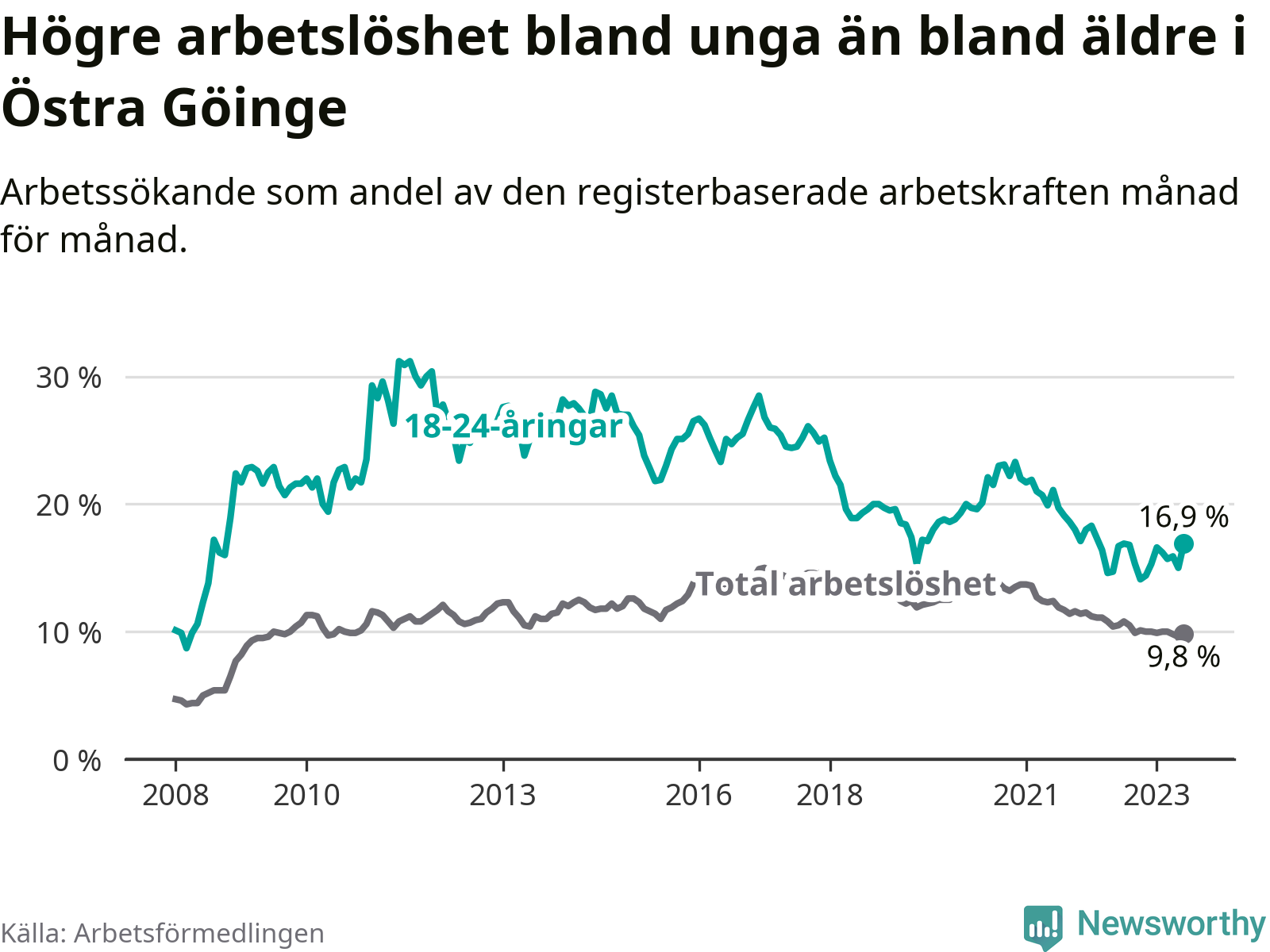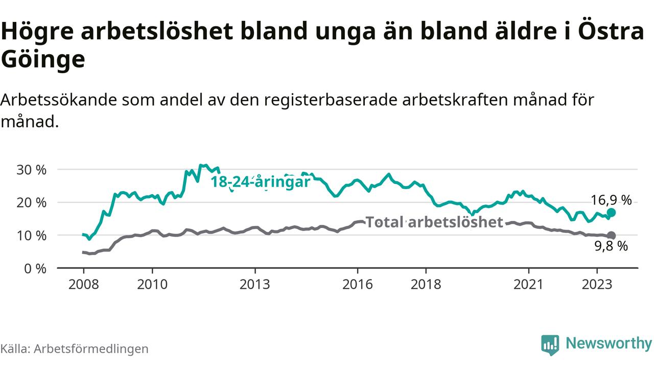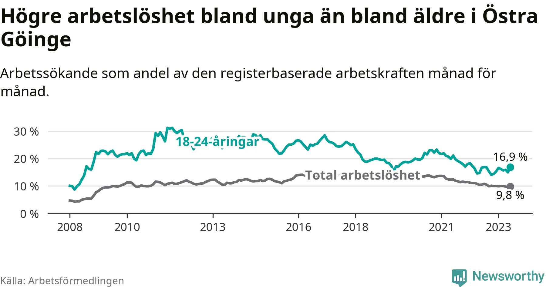 Till skillnad från den totala arbetslösheten stiger arbetslösheten bland unga (+0,2 procentenheter). I juni var 16,9 procent av 18–24-åringarna inskrivna som arbetssökande (motsvarande 103 personer). Mäter vi antalet inskrivna ser vi en ökning med ett personer på ett års sikt.