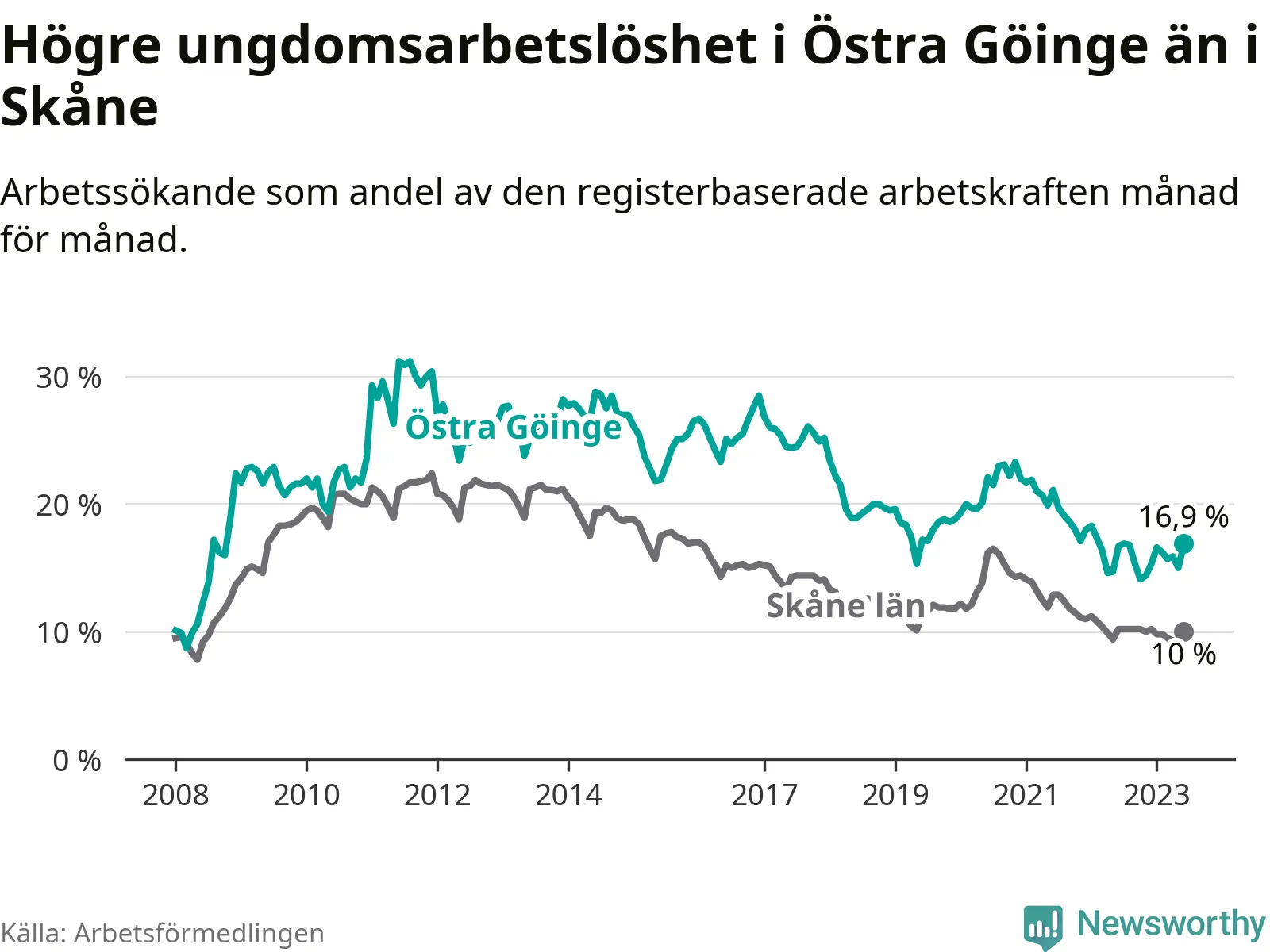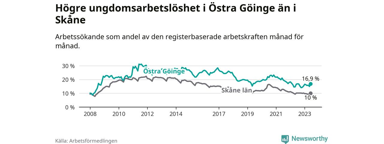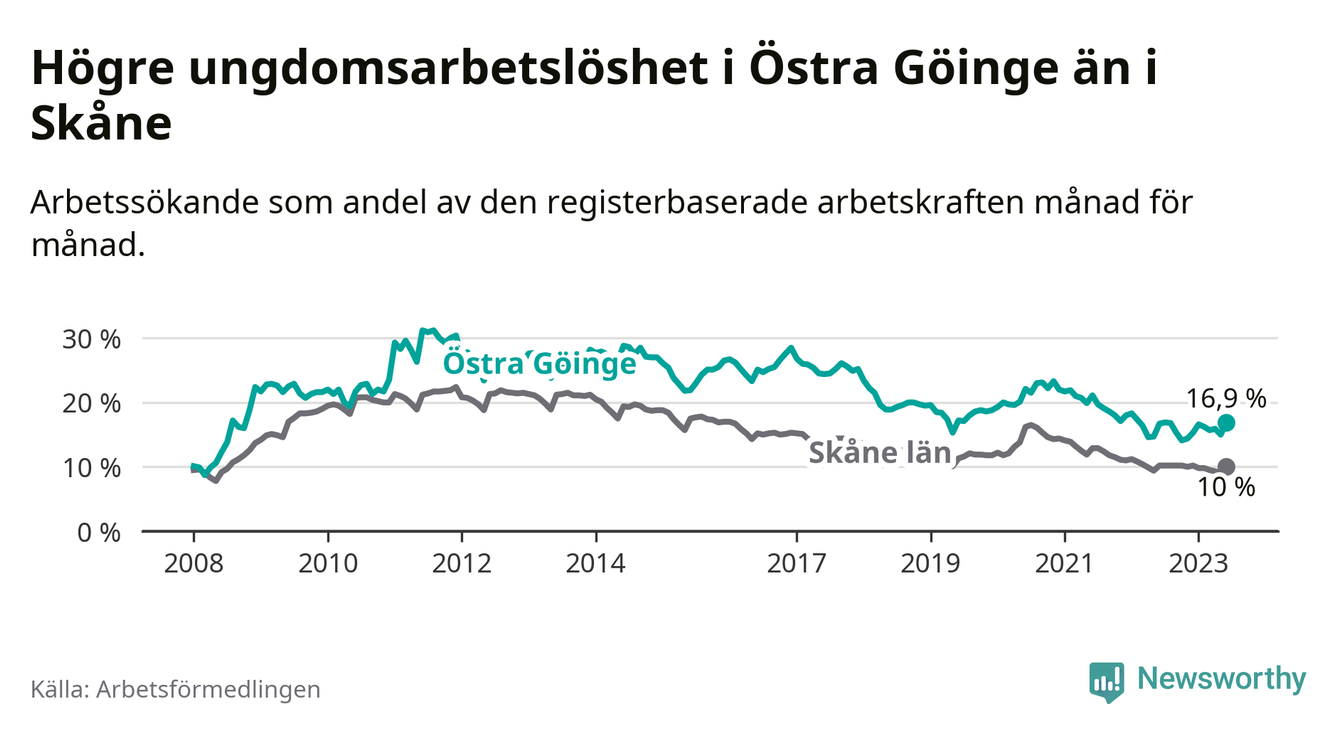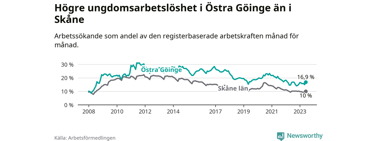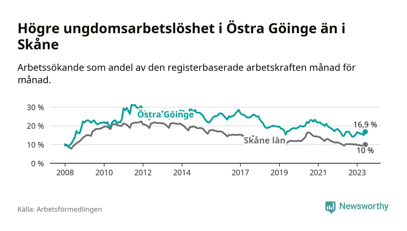 Precis som den totala arbetslösheten ligger ungdomsarbetslösheten i Östra Göinge högre än i Skåne som helhet. Skillnaden mellan kommunen och länet är 6,9 procentenheter.