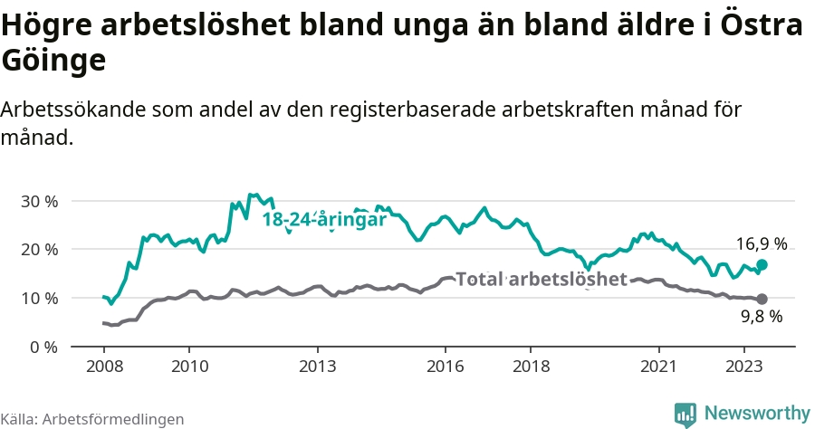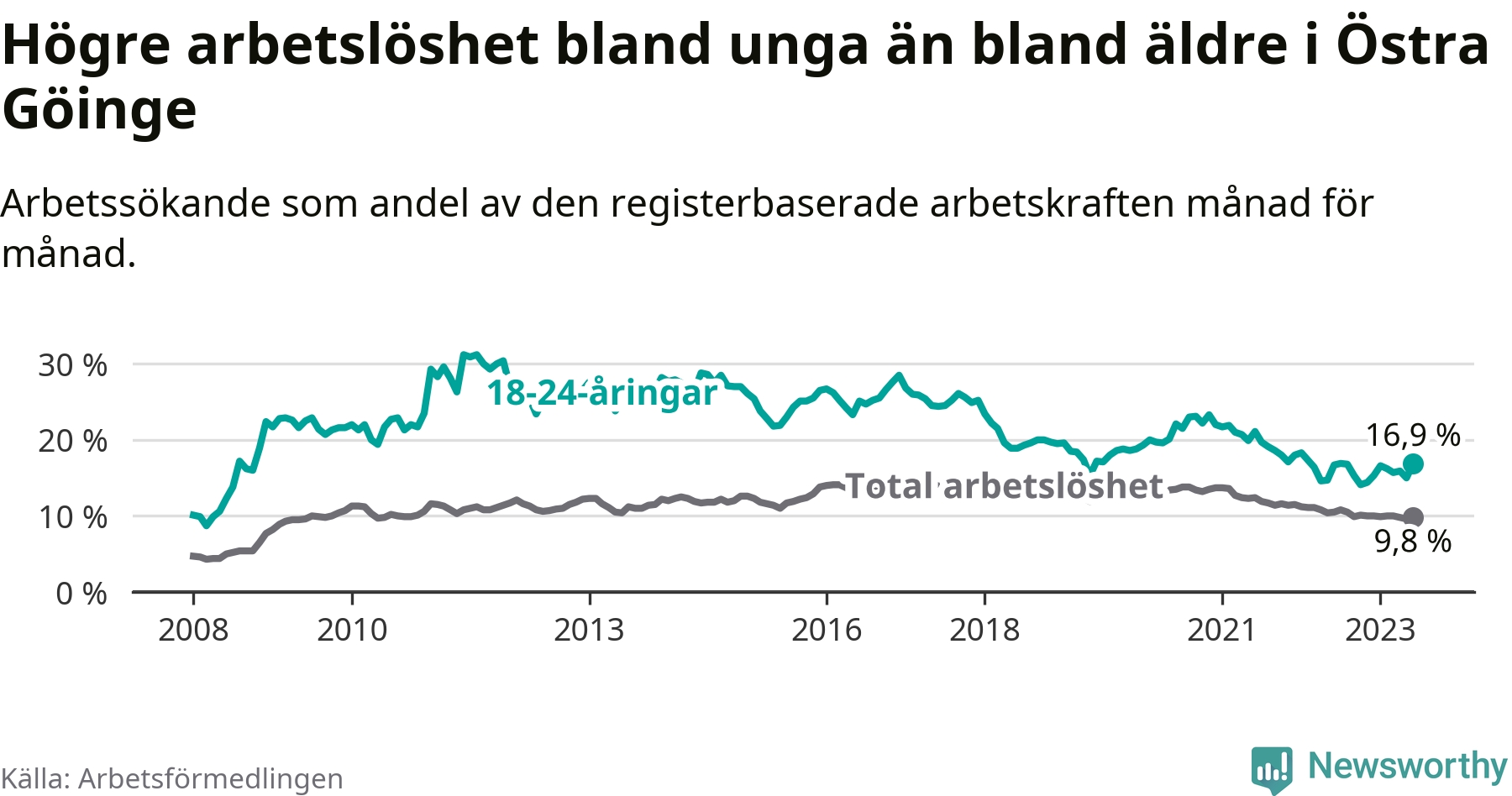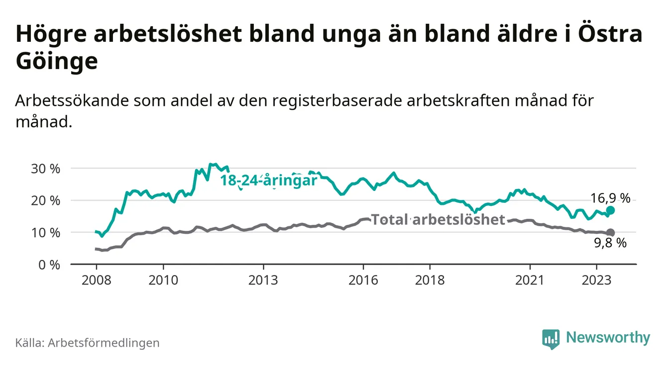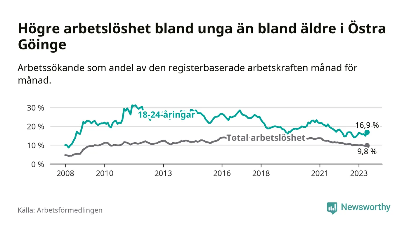 Precis som den totala arbetslösheten ligger ungdomsarbetslösheten i Östra Göinge högre än i Skåne som helhet. Skillnaden mellan kommunen och länet är 6,9 procentenheter.