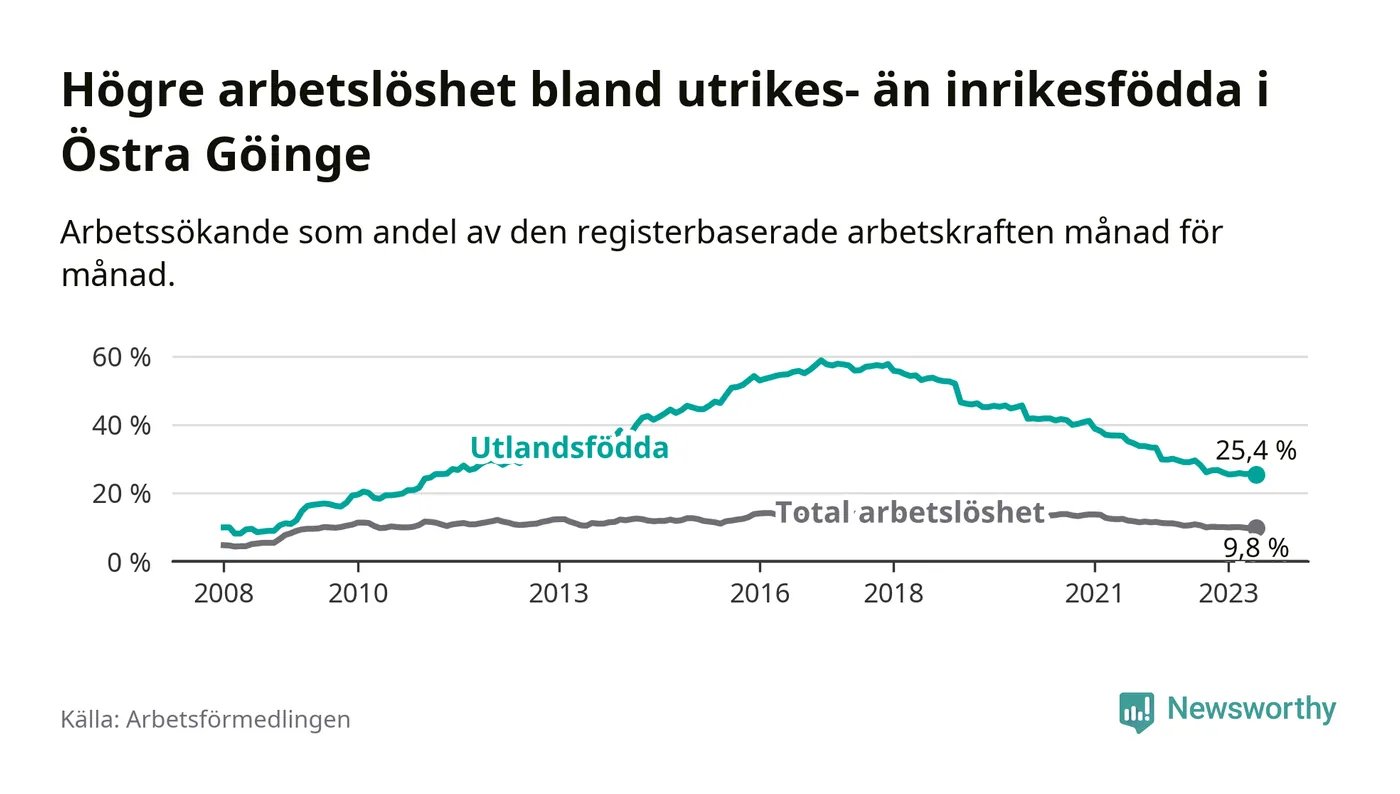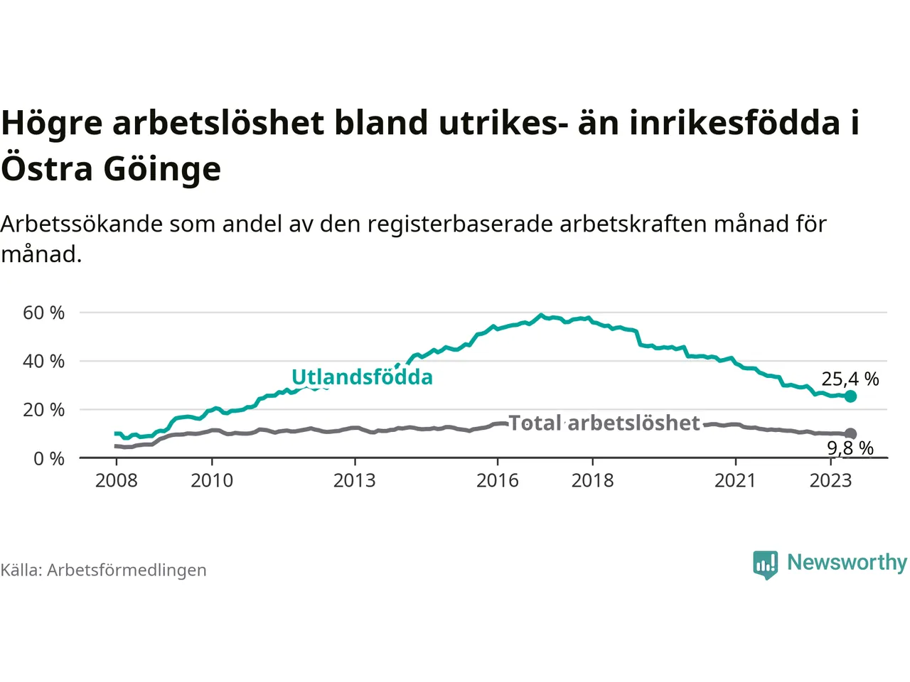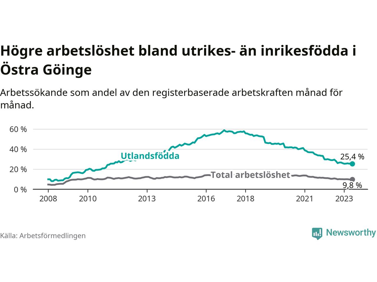 Skillnaden i arbetslöshet mellan utrikesfödda och hela befolkningen är 15,6 procentenheter i Östra Göinge. Det är en betydligt mindre skillnad än för ett år sedan (−2,9 procentenheter).