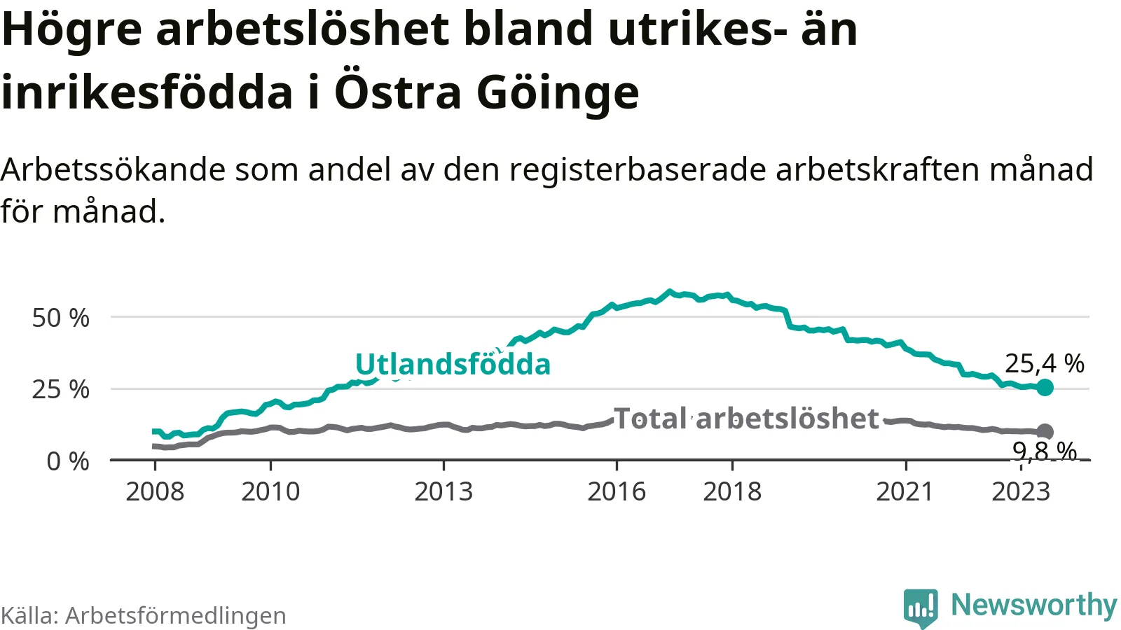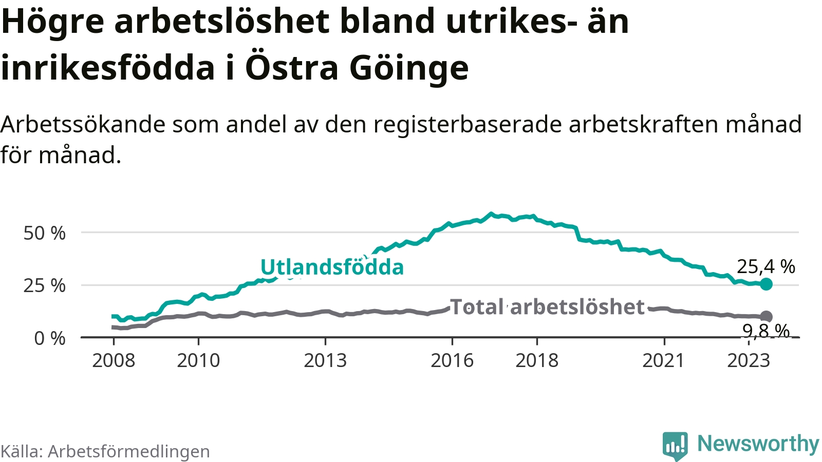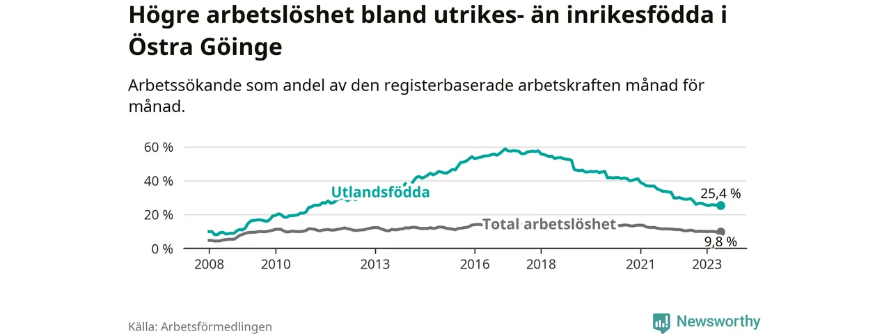 Skillnaden i arbetslöshet mellan utrikesfödda och hela befolkningen är 15,6 procentenheter i Östra Göinge. Det är en betydligt mindre skillnad än för ett år sedan (−2,9 procentenheter).