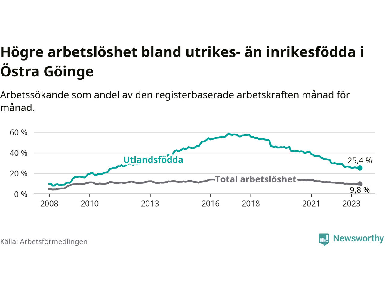 Arbetslösheten bland utlandsfödda var 25,4 procent i Östra Göinge under juni månad, motsvarande 359 av 1 413 personer. Det är 3,6 procentenheter färre än vid samma tidpunkt i fjol (−53 om man räknar personer). Därmed har de utlandsföddas arbetslöshet varit lägre än vid samma tidpunkt i fjol i över fem år i sträck. Sedan oktober 2017 har arbetslösheten bland utlandsfödda minskat från 57,4 till 25,4 procent.