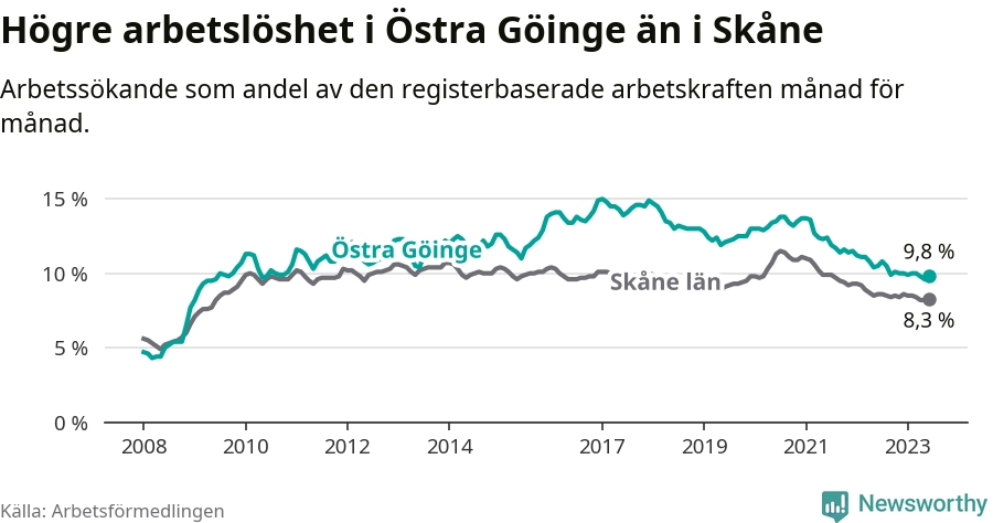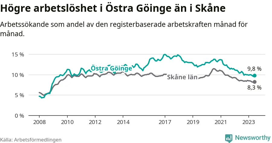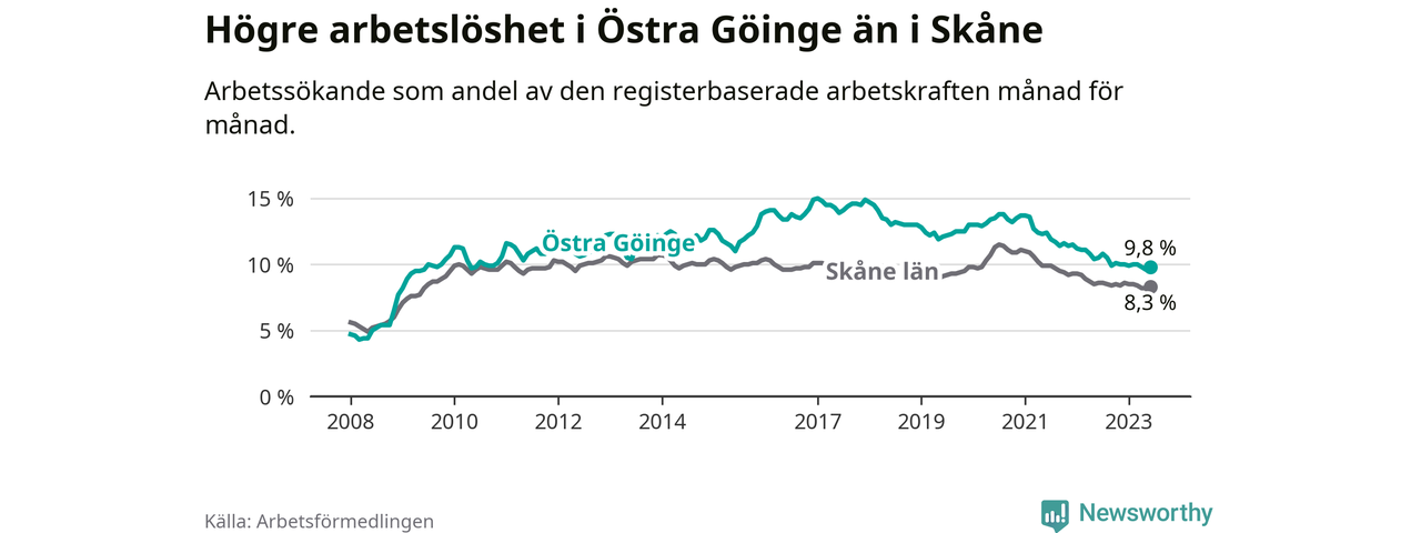 Det är 28:e månaden i följd som arbetslösheten i Östra Göinge är lägre än den var under samma tidpunkt året innan. Sedan februari 2021 har arbetslösheten gått ner från 13,6 till 9,8 procent.