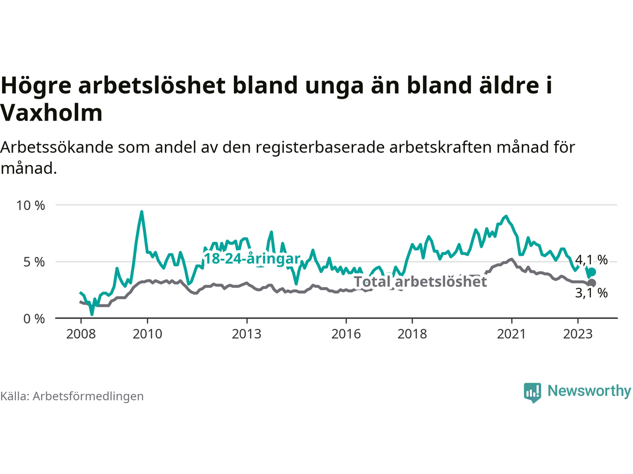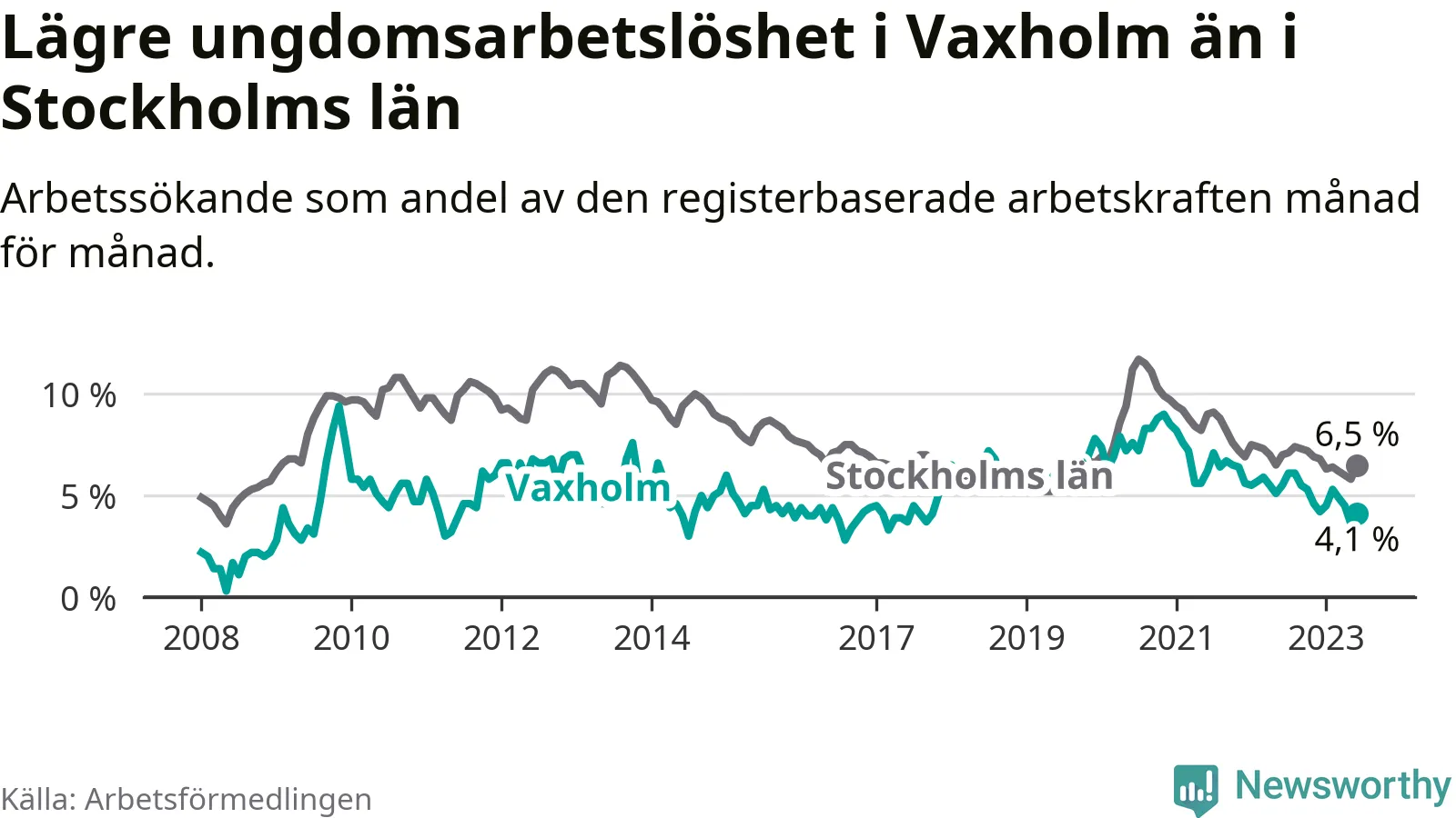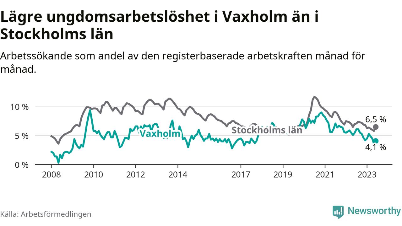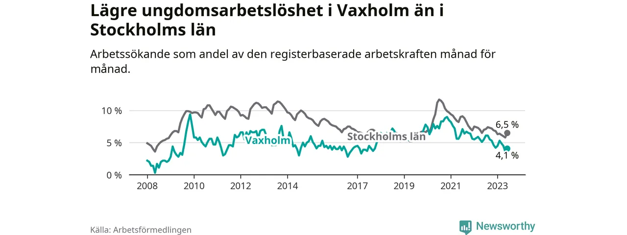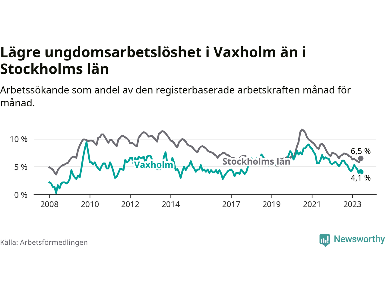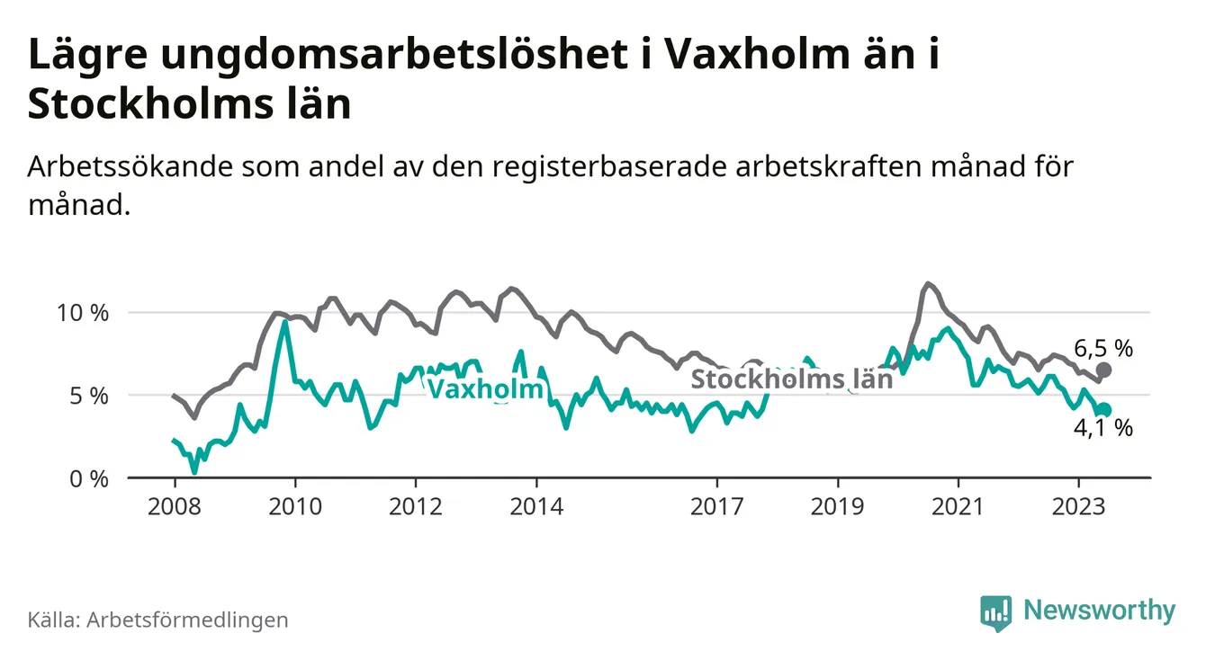 I och med den senaste månadens nedgång har de ungas arbetslöshet i Vaxholm sjunkit över två år i sträck (ner från 7,2 procent i mars 2021 till 4,1 procent nu).