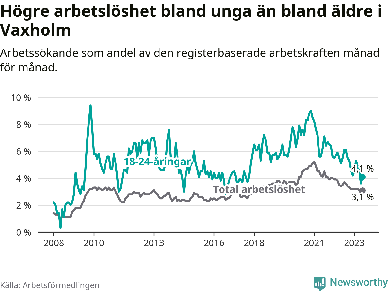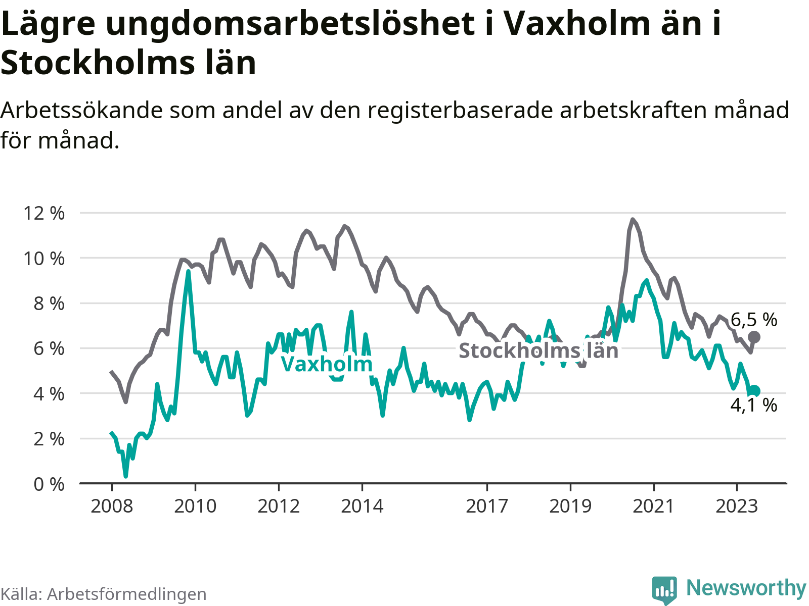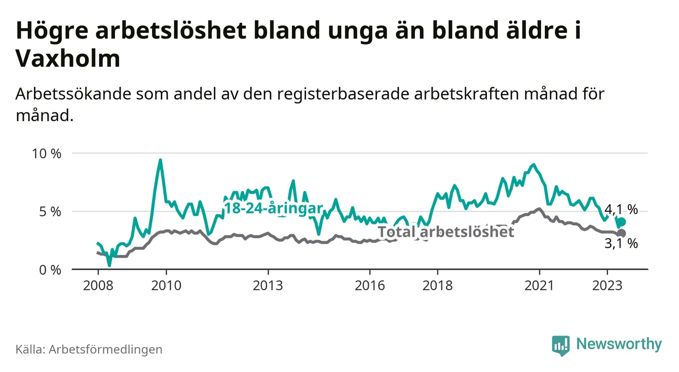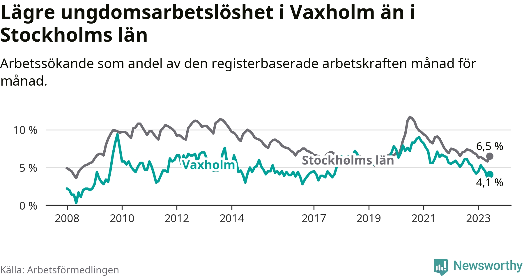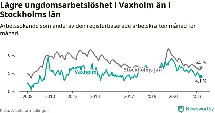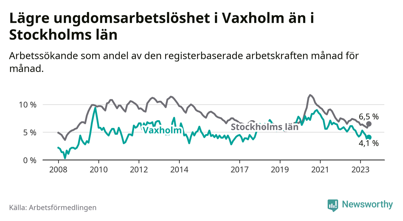 I och med den senaste månadens nedgång har de ungas arbetslöshet i Vaxholm sjunkit över två år i sträck (ner från 7,2 procent i mars 2021 till 4,1 procent nu).