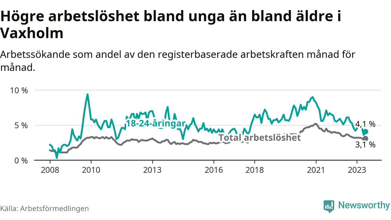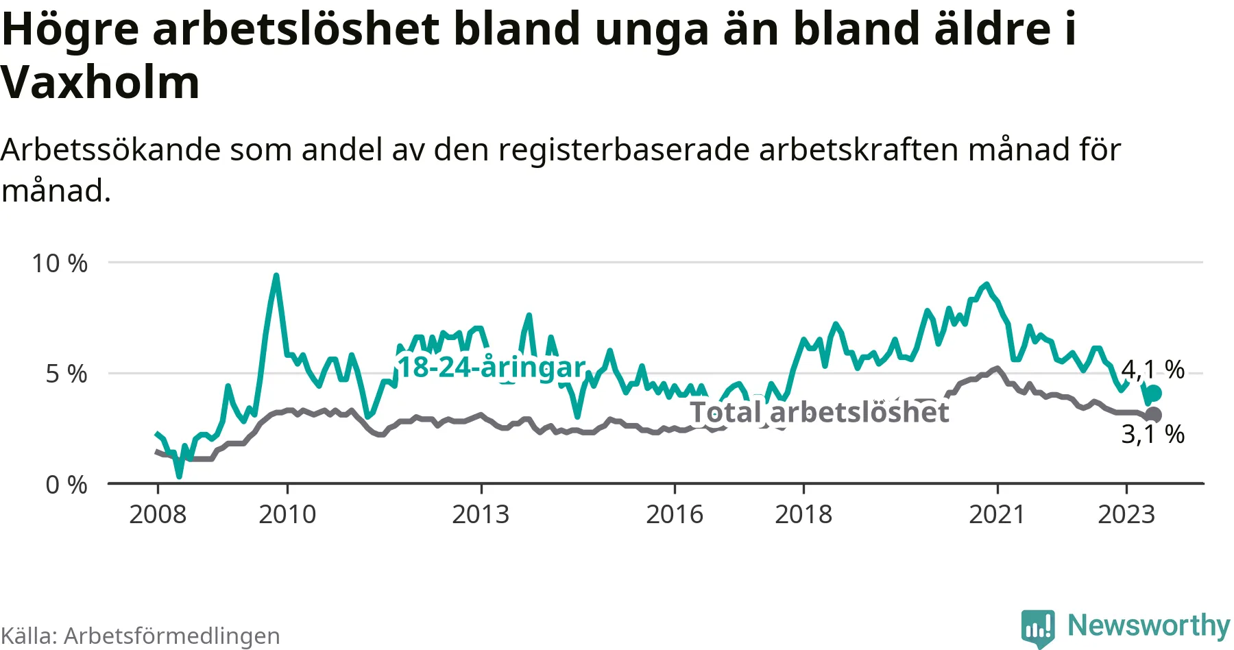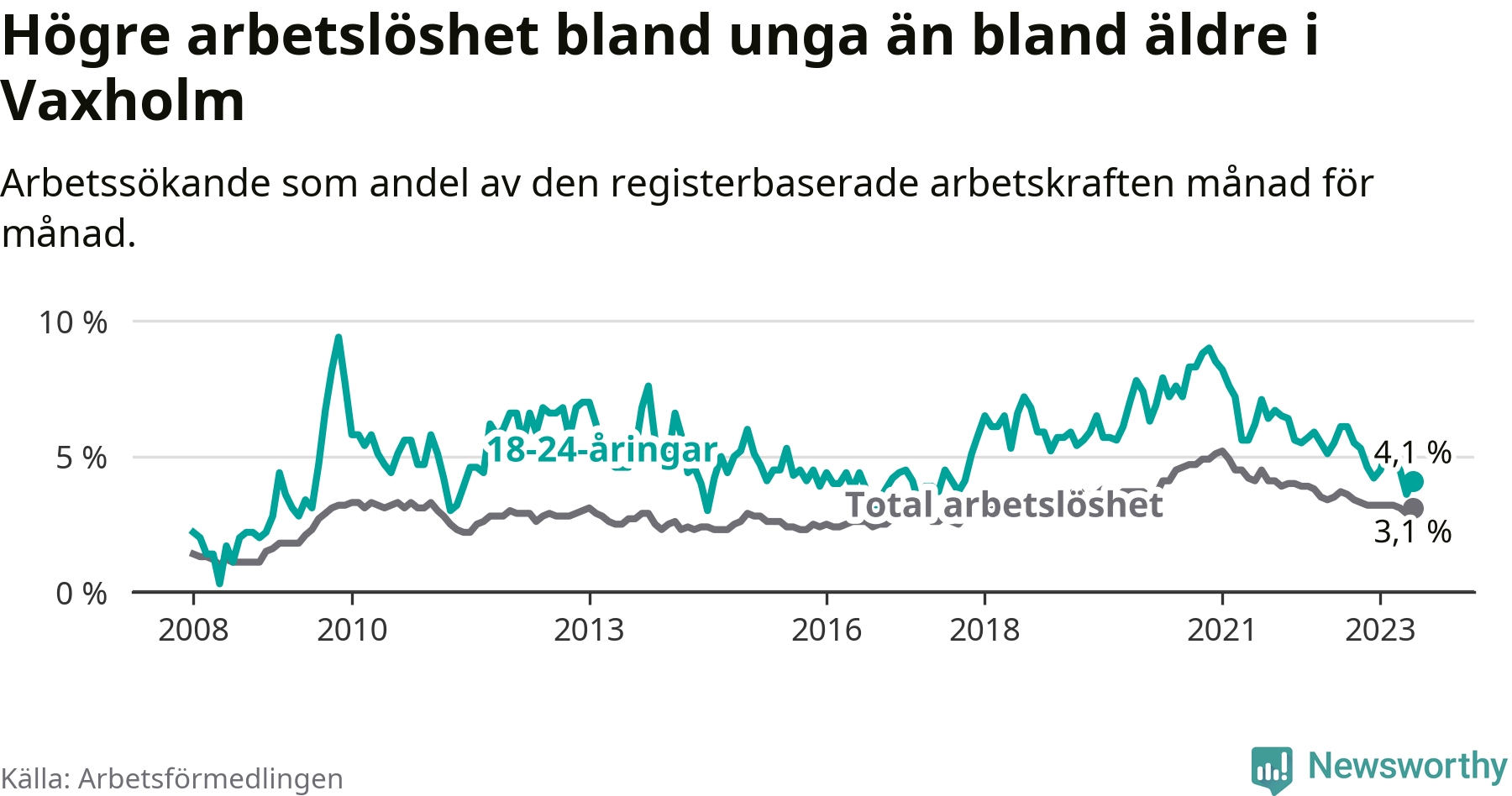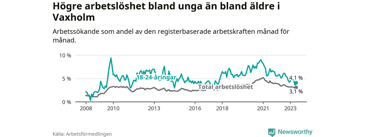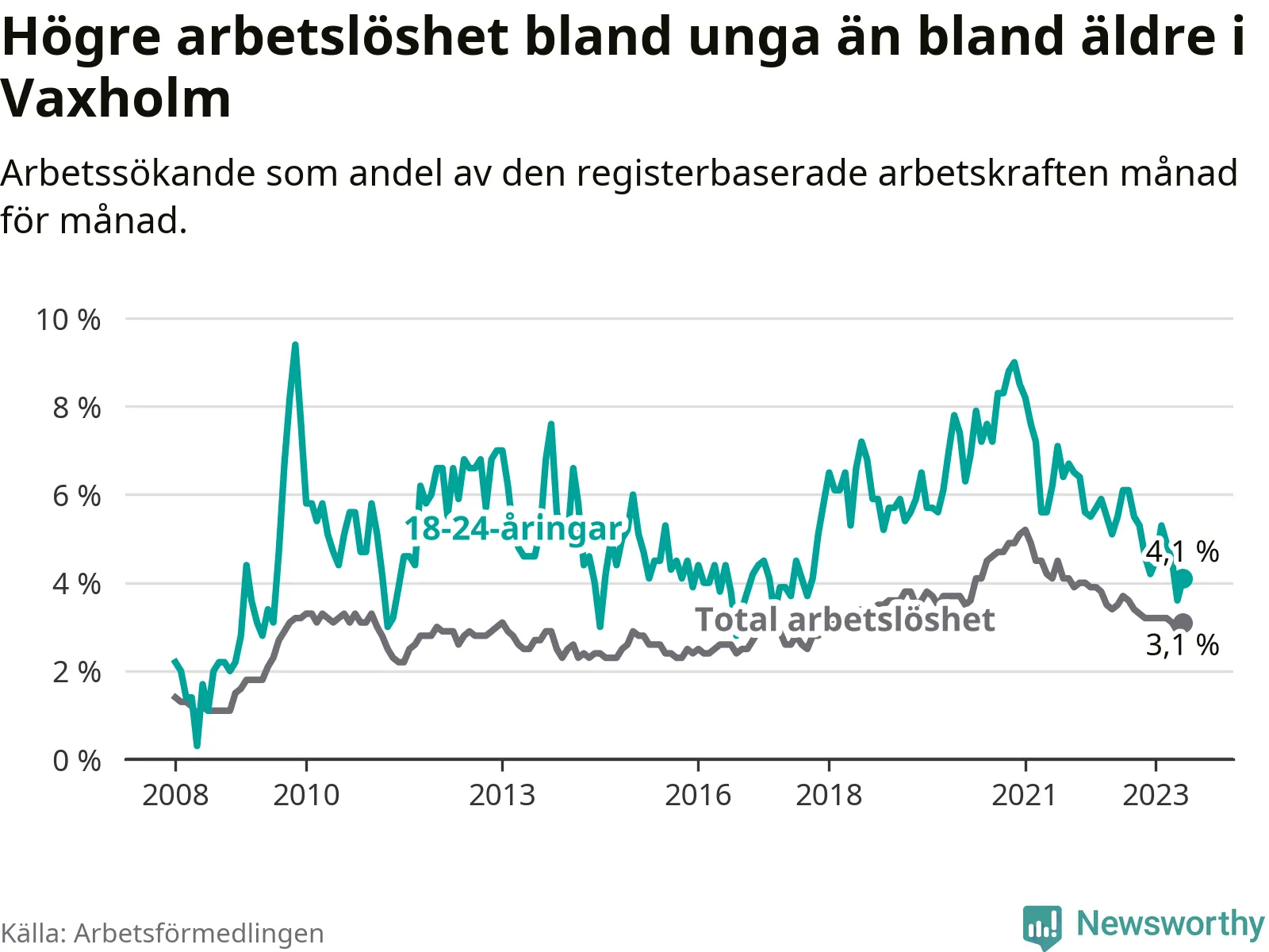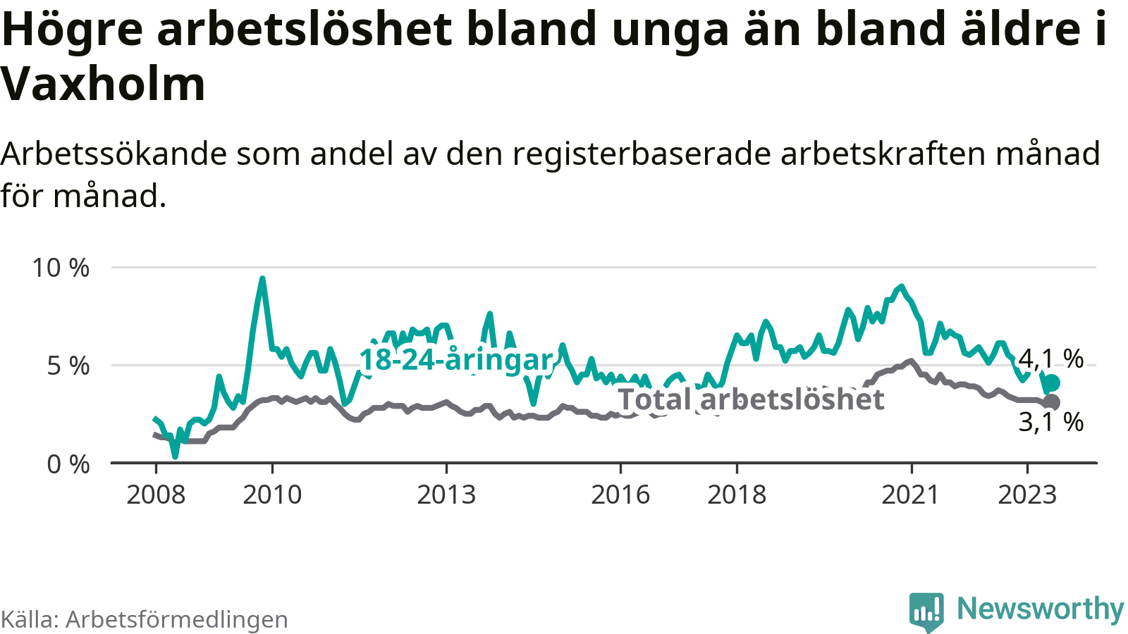 I och med den senaste månadens nedgång har de ungas arbetslöshet i Vaxholm sjunkit över två år i sträck (ner från 7,2 procent i mars 2021 till 4,1 procent nu).