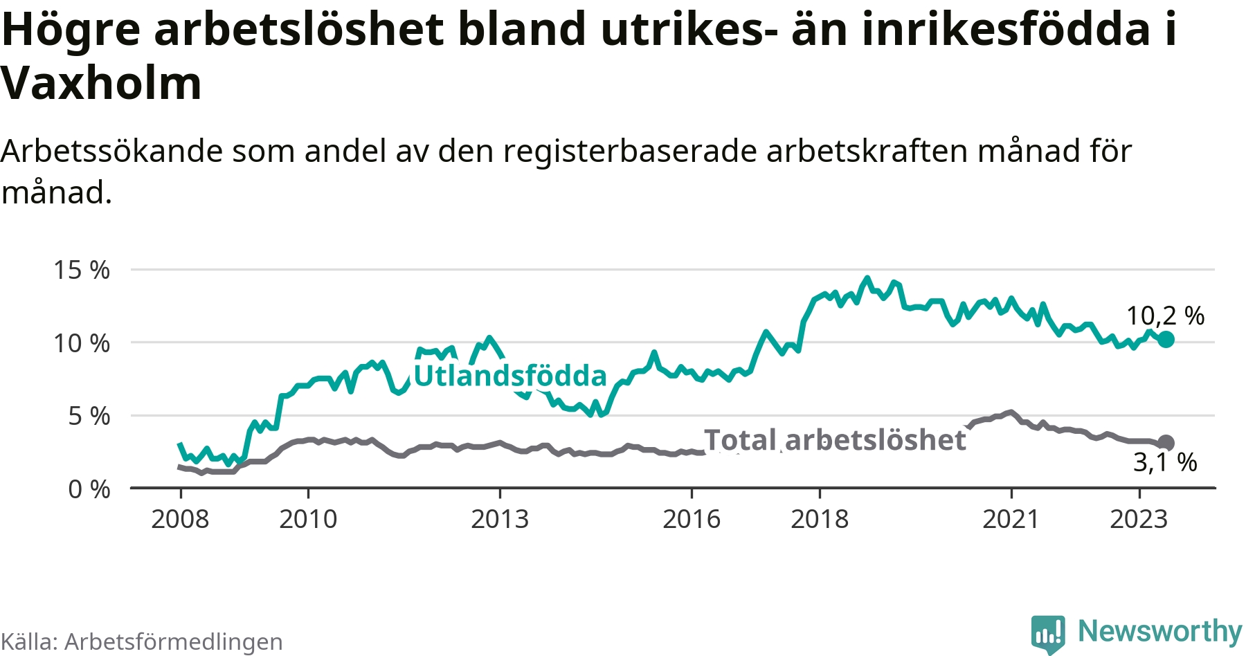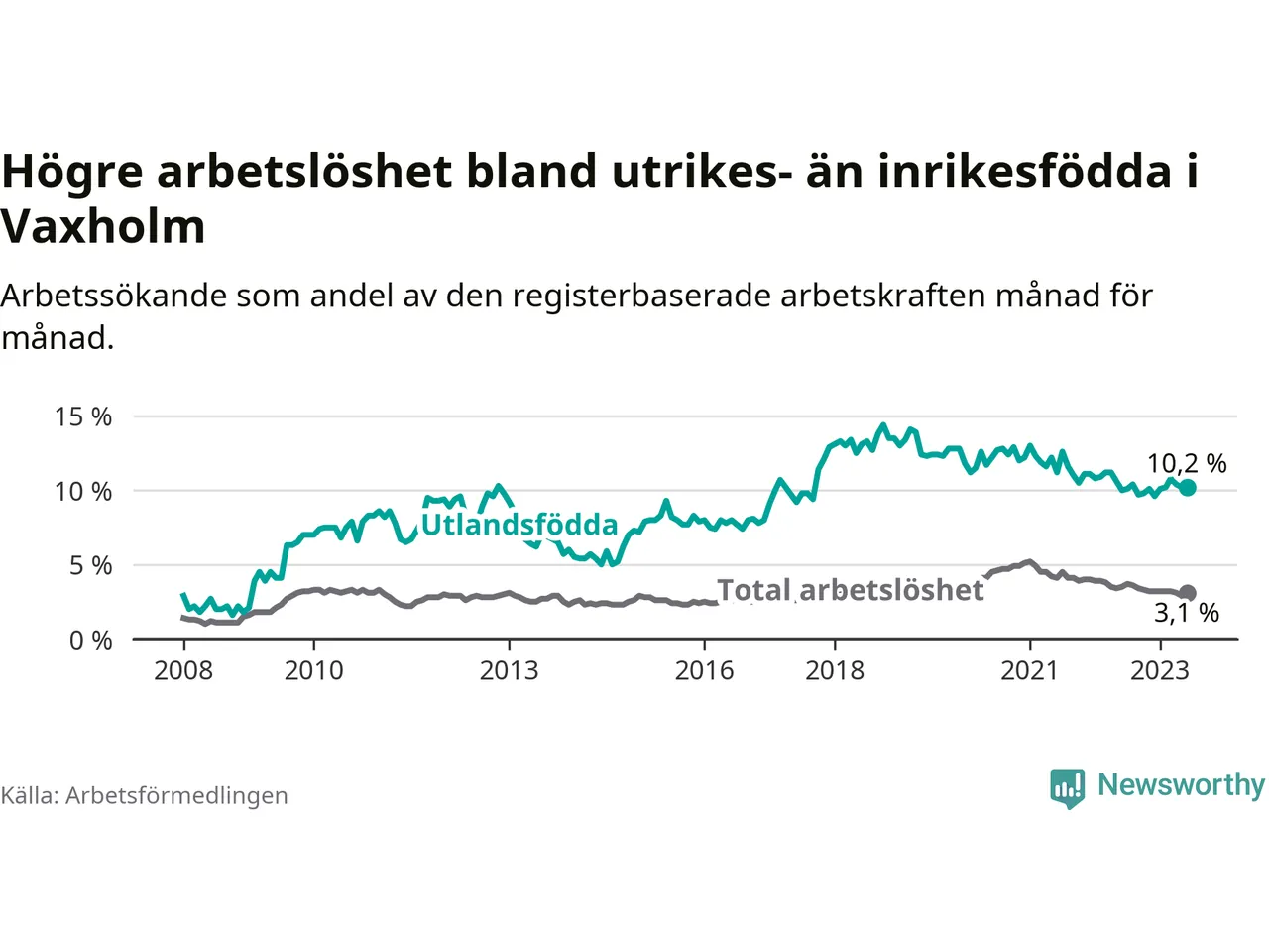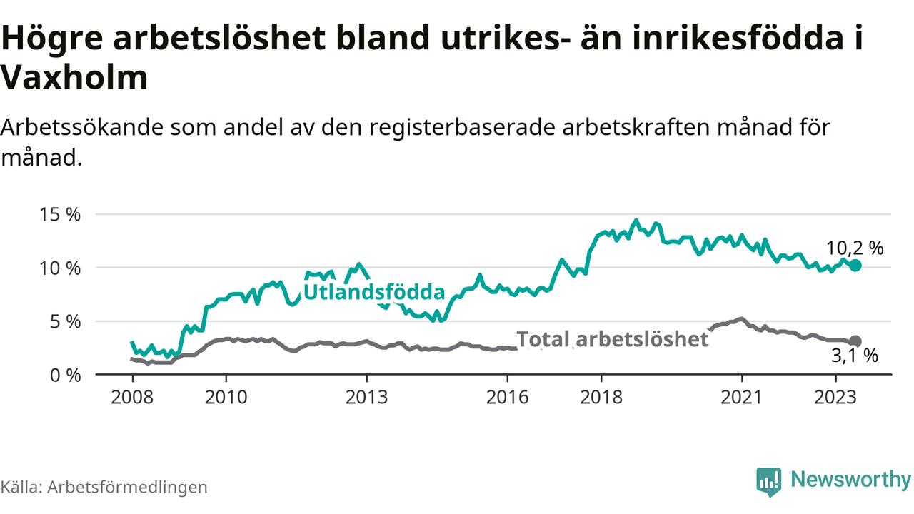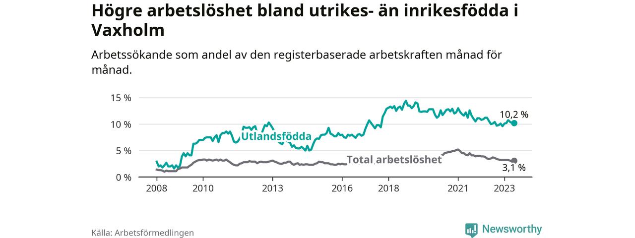 Arbetslösheten bland utlandsfödda var 10,2 procent i Vaxholm under juni månad, motsvarande 78 av 765 personer. Det är 0,2 procentenheter fler än vid samma tidpunkt i fjol (+4 om man räknar personer). Den senaste månadens uppgång innebär ett trendbrott. Under de 24 föregående månaderna hade arbetslösheten bland utlandsfödda varit lägre än motsvarande tidpunkt året innan.