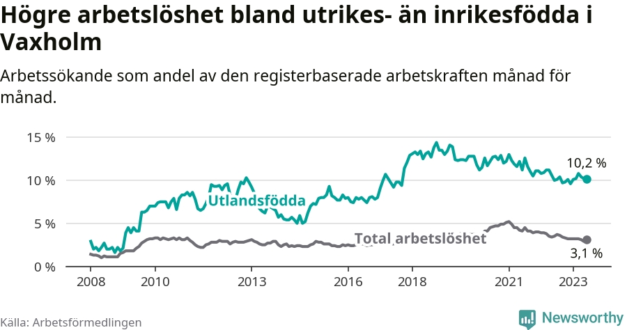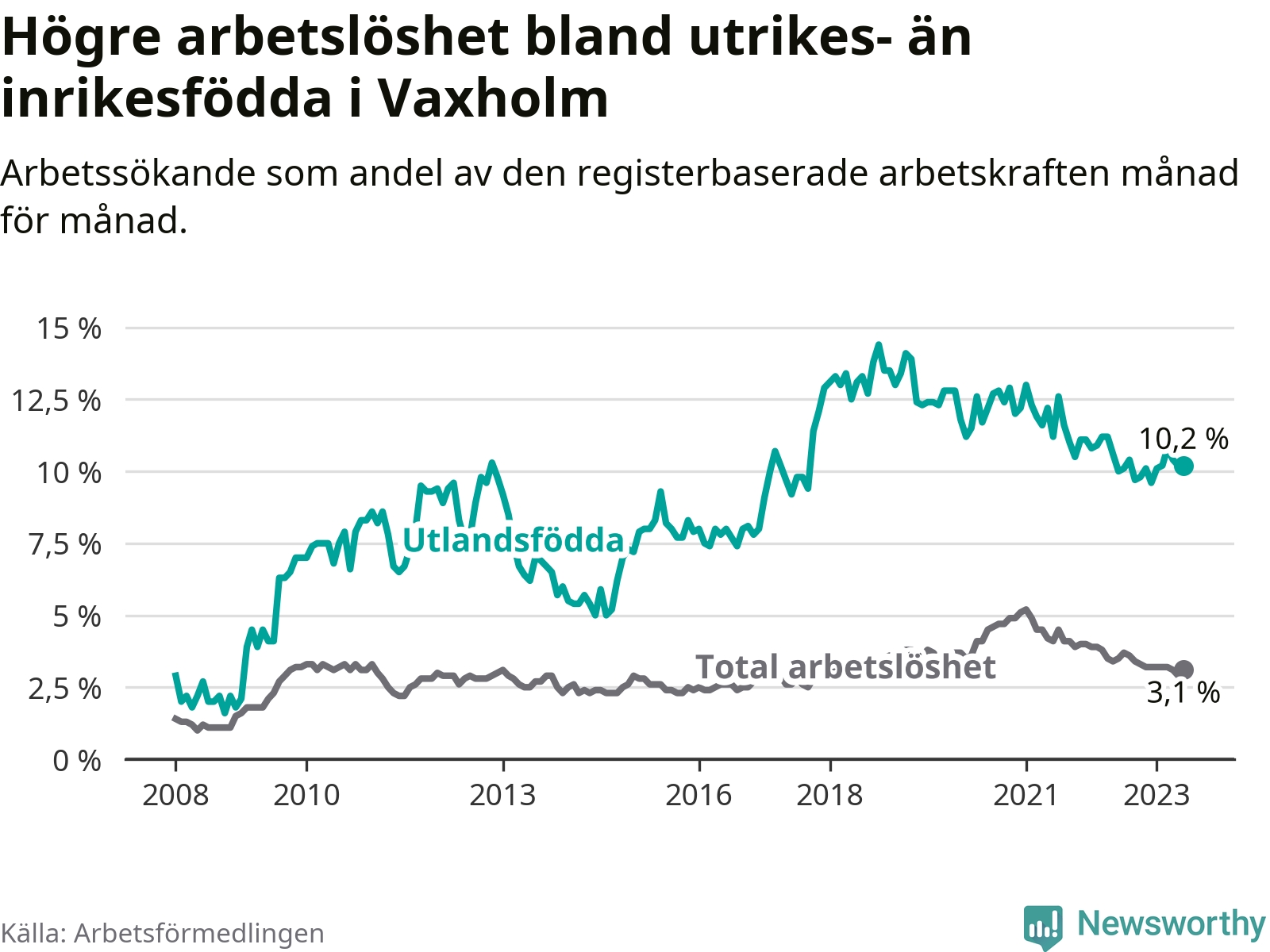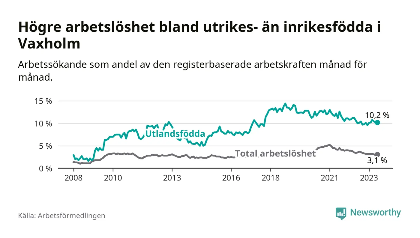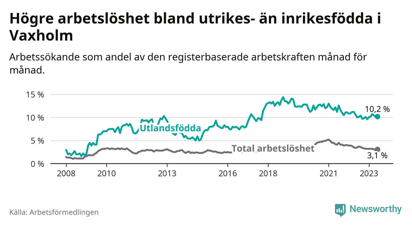 Arbetslösheten bland utlandsfödda var 10,2 procent i Vaxholm under juni månad, motsvarande 78 av 765 personer. Det är 0,2 procentenheter fler än vid samma tidpunkt i fjol (+4 om man räknar personer). Den senaste månadens uppgång innebär ett trendbrott. Under de 24 föregående månaderna hade arbetslösheten bland utlandsfödda varit lägre än motsvarande tidpunkt året innan.