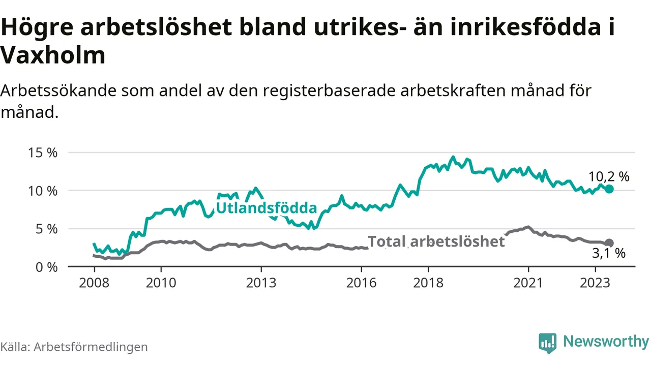 Den här skillnaden i arbetslöshet mellan inrikes- och utrikesfödda är förhållandevis stor i Vaxholm om man jämför med andra kommuner i Stockholms län. Botkyrka har, relativt sett, den minsta skillnaden i arbetslöshet mellan inrikes- och utrikes födda i länet.