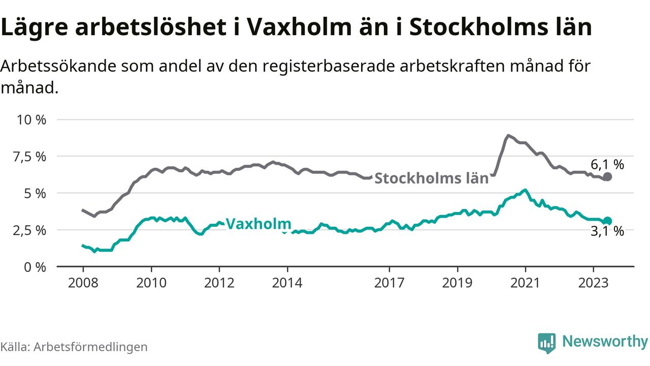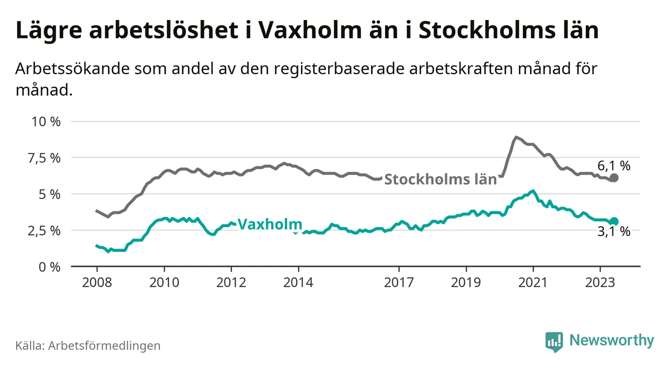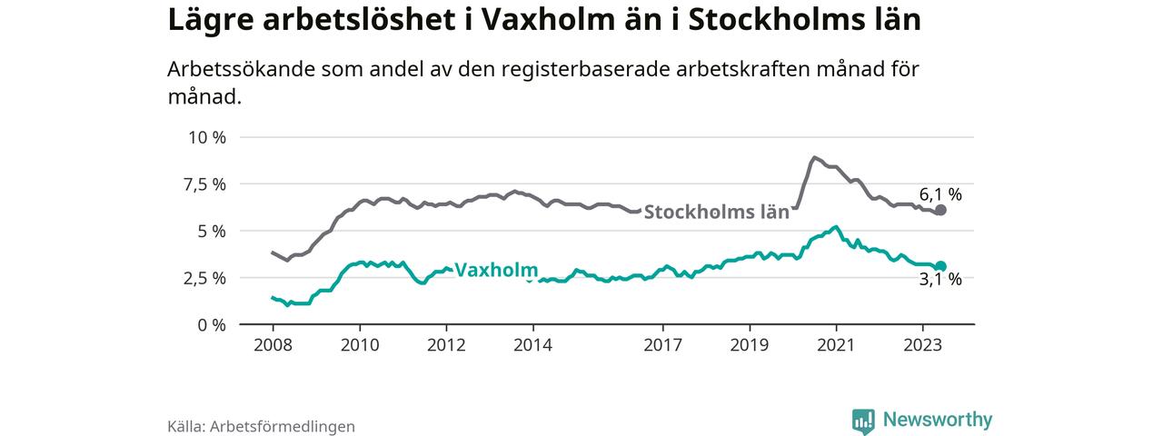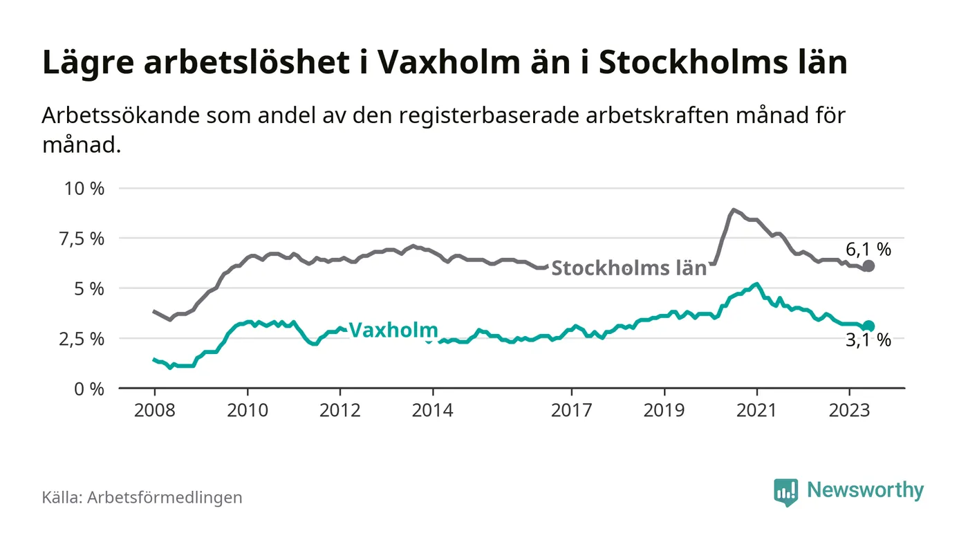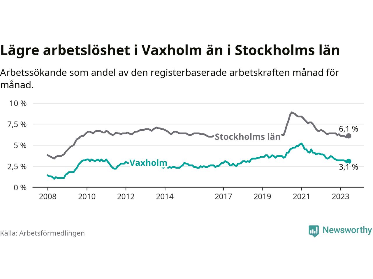 Vaxholm hade redan tidigare lägre arbetslöshet än snittet i hela Stockholms län och nu växer klyftan (3,1 procent i kommunen, jämfört med 6,1 procent i hela länet). Vaxholm har därmed även den lägsta arbetslöshetsnivån i länet. Botkyrka har den högsta (10,3 procent).