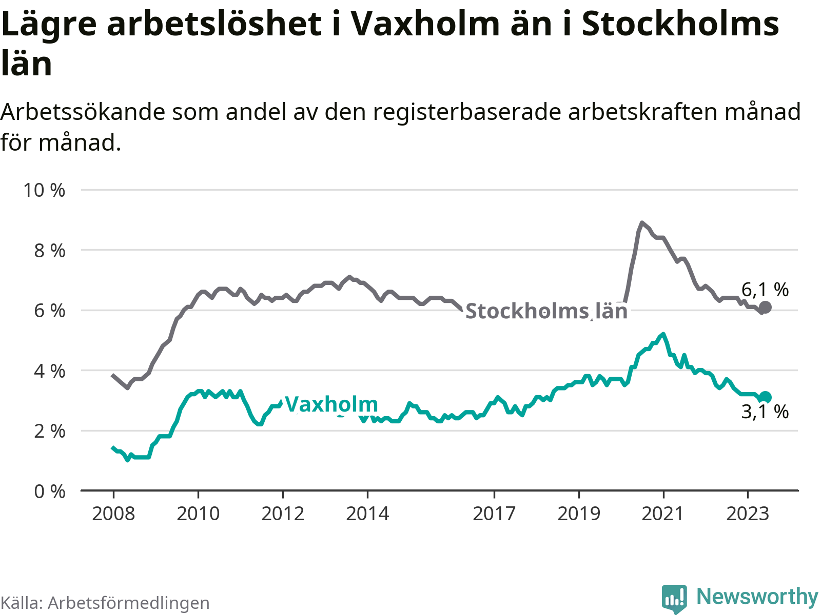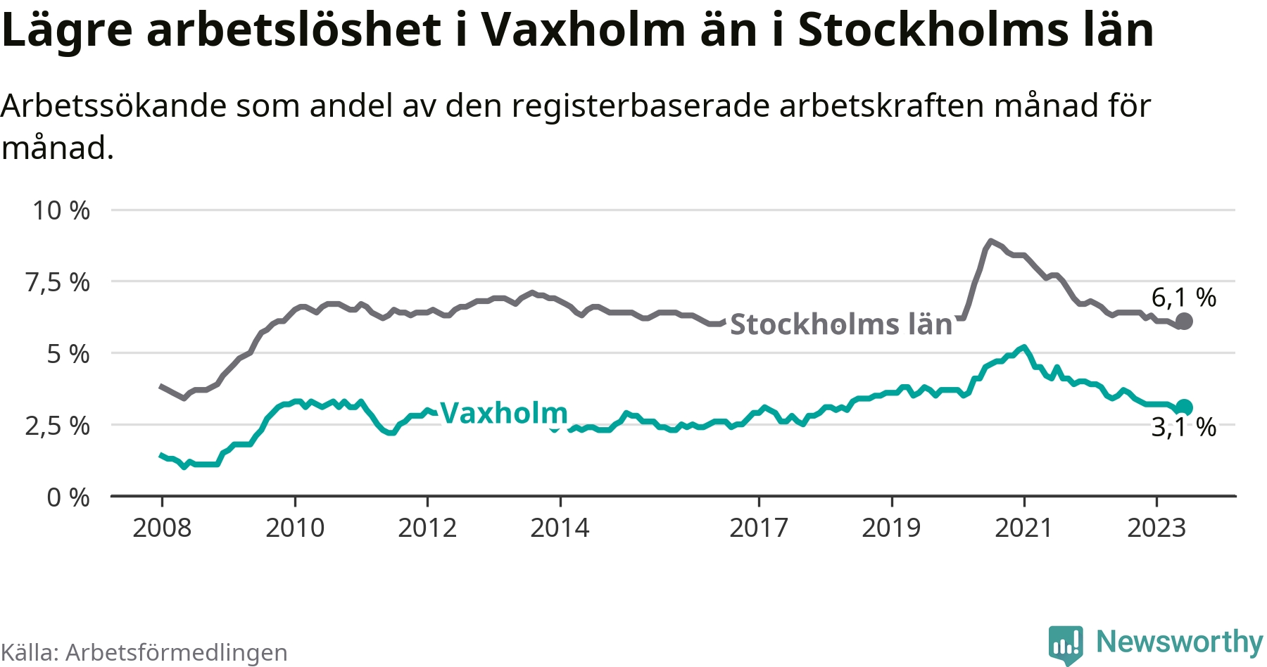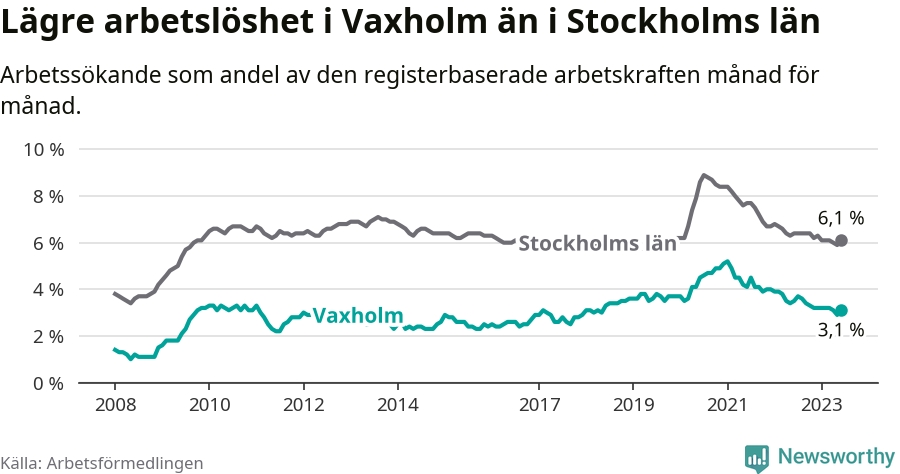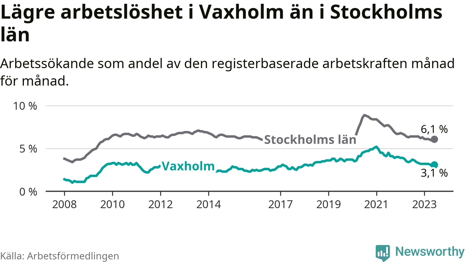 Vaxholm hade redan tidigare lägre arbetslöshet än snittet i hela Stockholms län och nu växer klyftan (3,1 procent i kommunen, jämfört med 6,1 procent i hela länet). Vaxholm har därmed även den lägsta arbetslöshetsnivån i länet. Botkyrka har den högsta (10,3 procent).