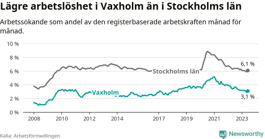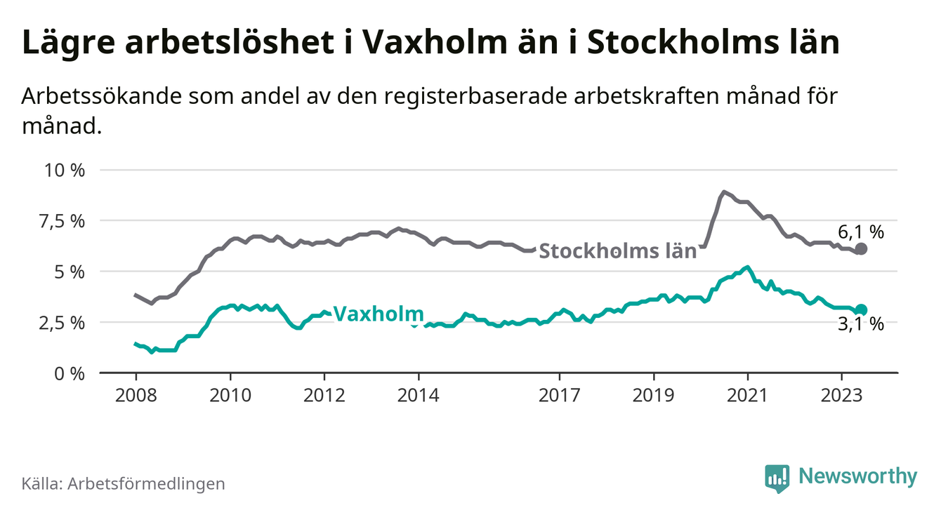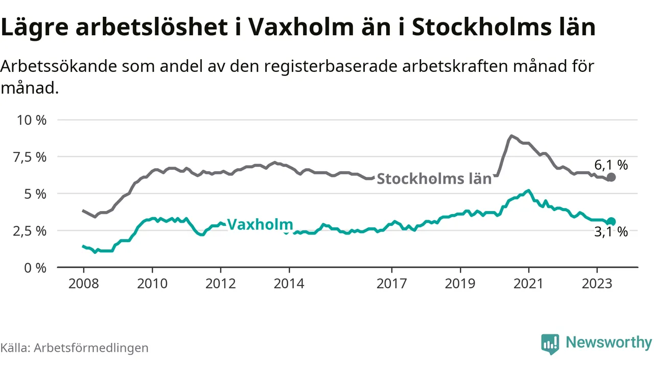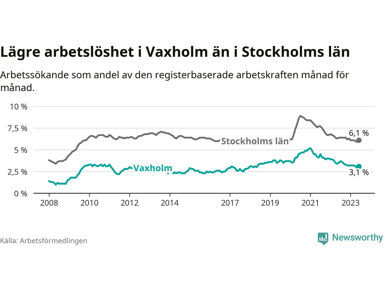 Det är 25:e månaden i följd som arbetslösheten i Vaxholm är lägre än den var under samma tidpunkt året innan. Sedan maj 2021 har arbetslösheten gått ner från 4,2 till 3,1 procent.