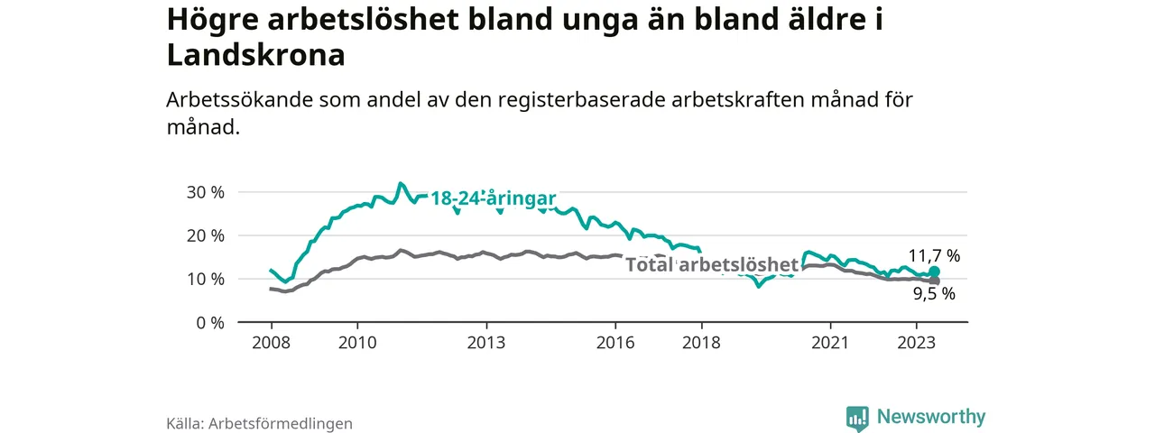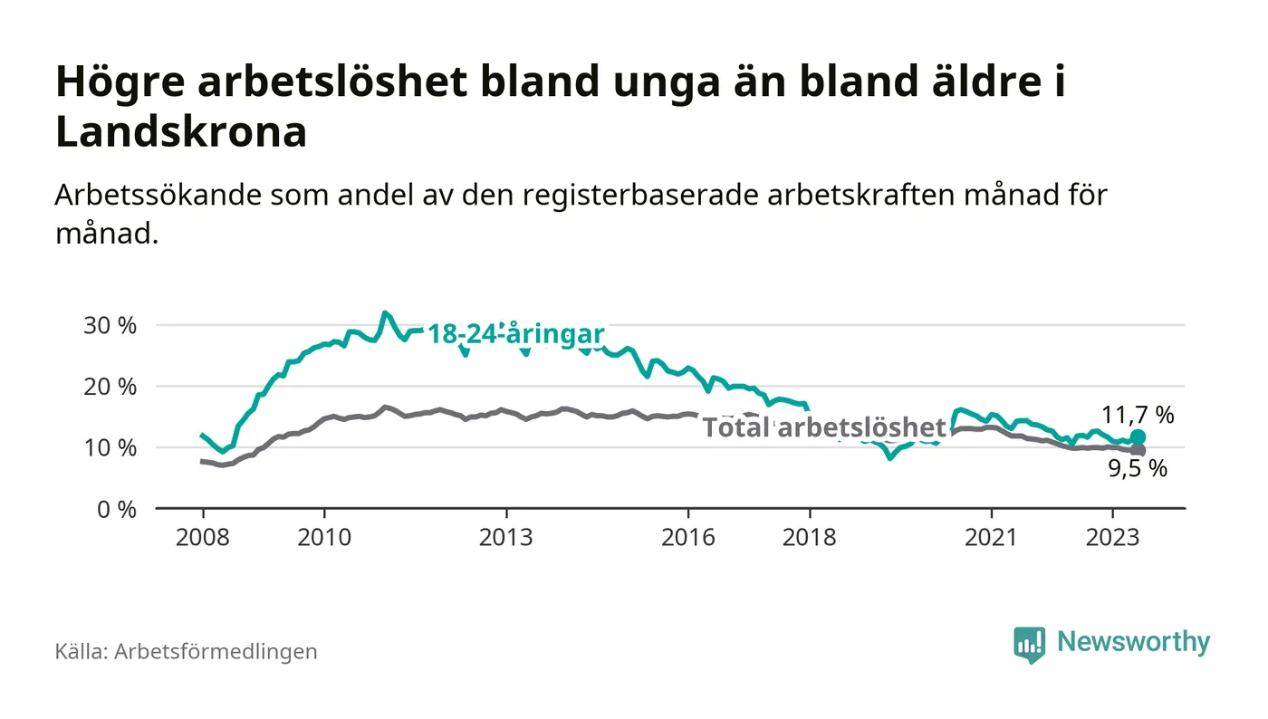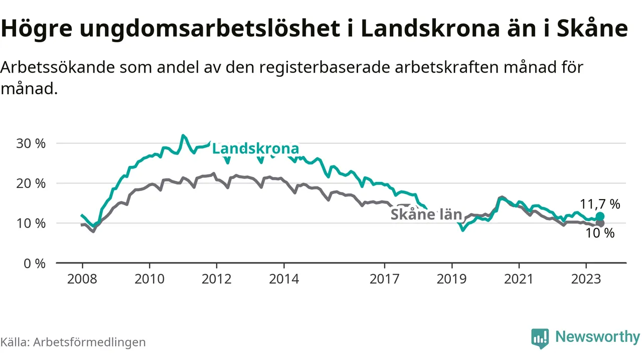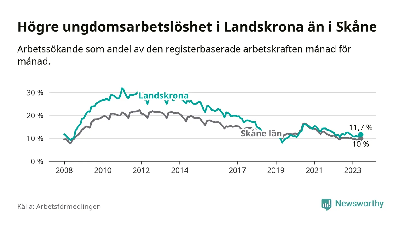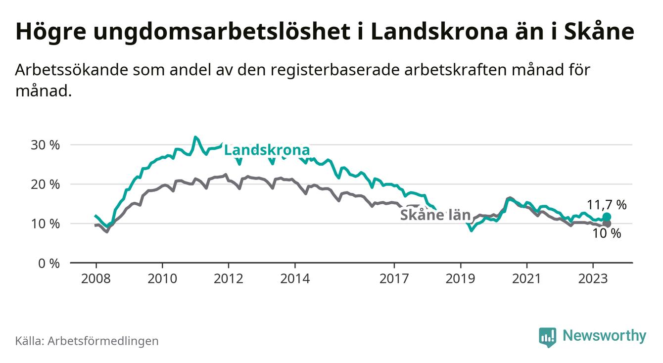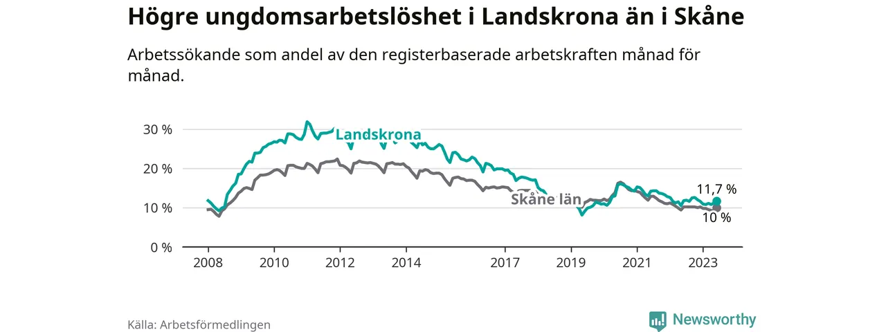 Precis som den totala arbetslösheten ligger ungdomsarbetslösheten i Landskrona högre än i Skåne som helhet. Skillnaden mellan kommunen och länet är 1,7 procentenheter.