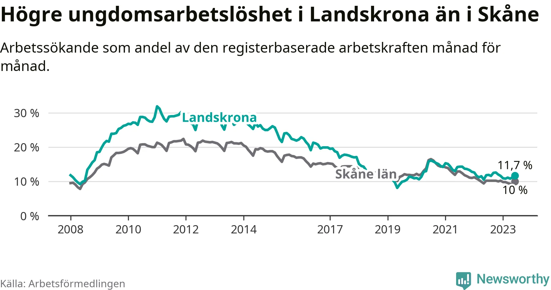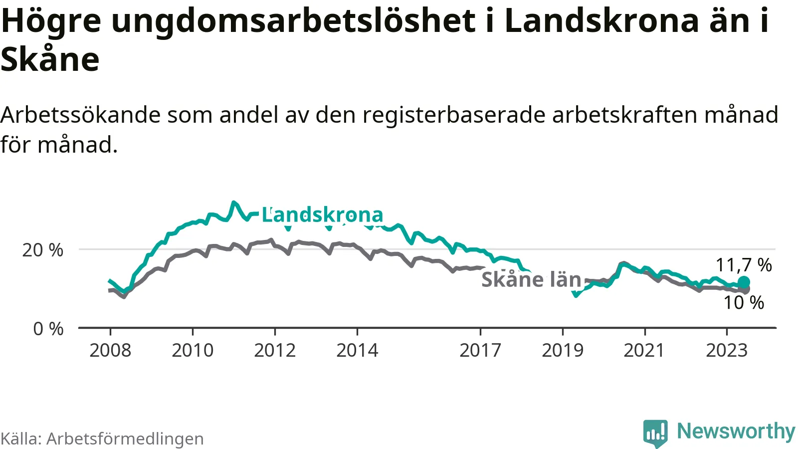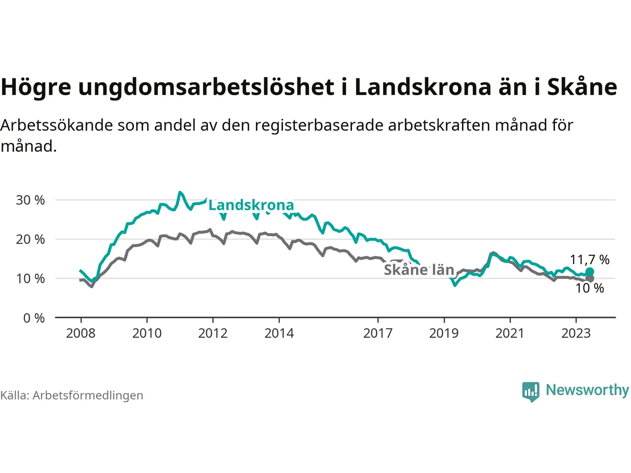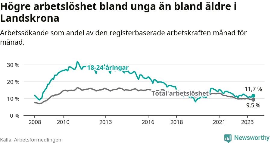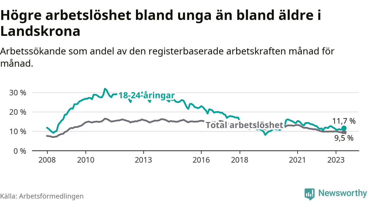 Precis som den totala arbetslösheten ligger ungdomsarbetslösheten i Landskrona högre än i Skåne som helhet. Skillnaden mellan kommunen och länet är 1,7 procentenheter.