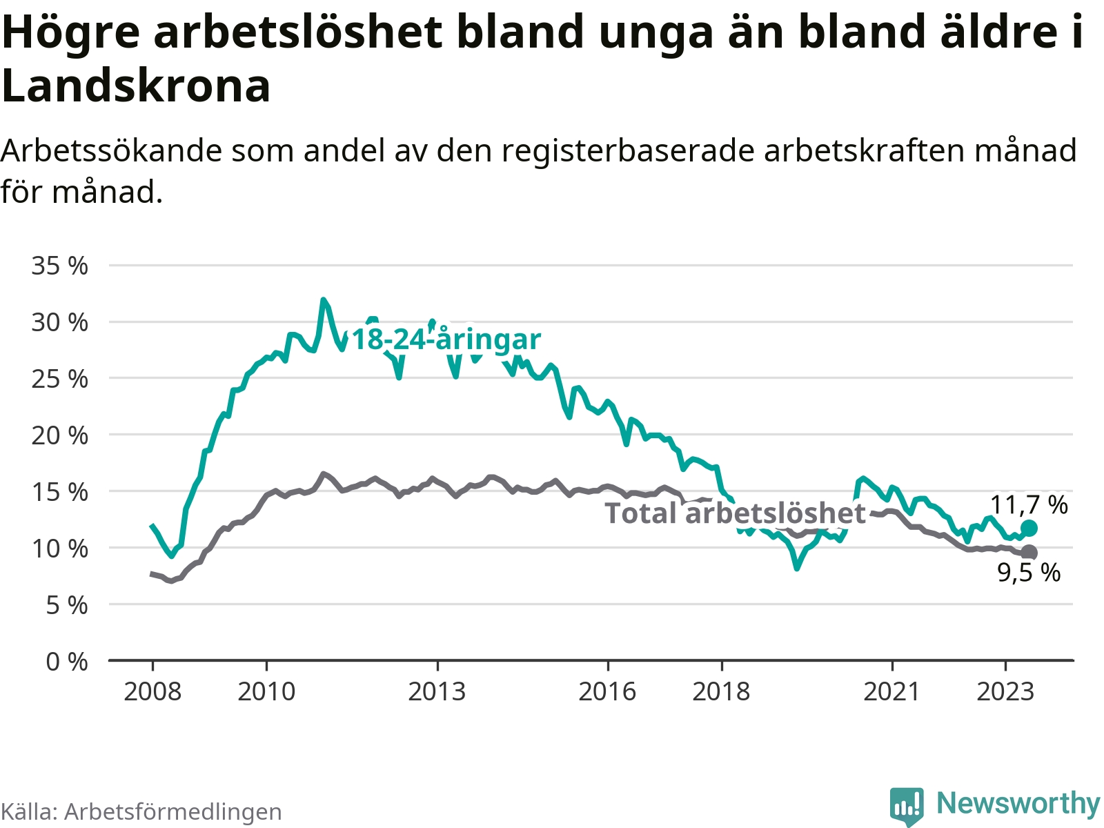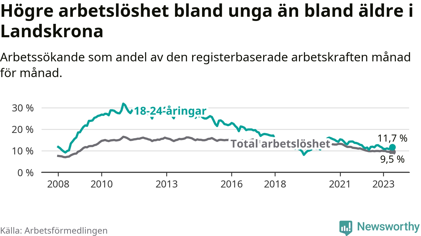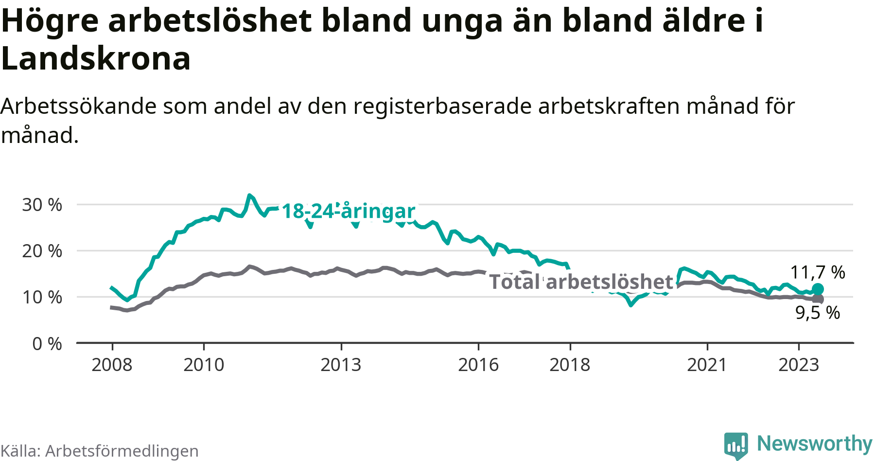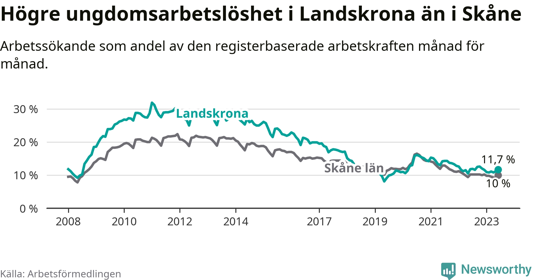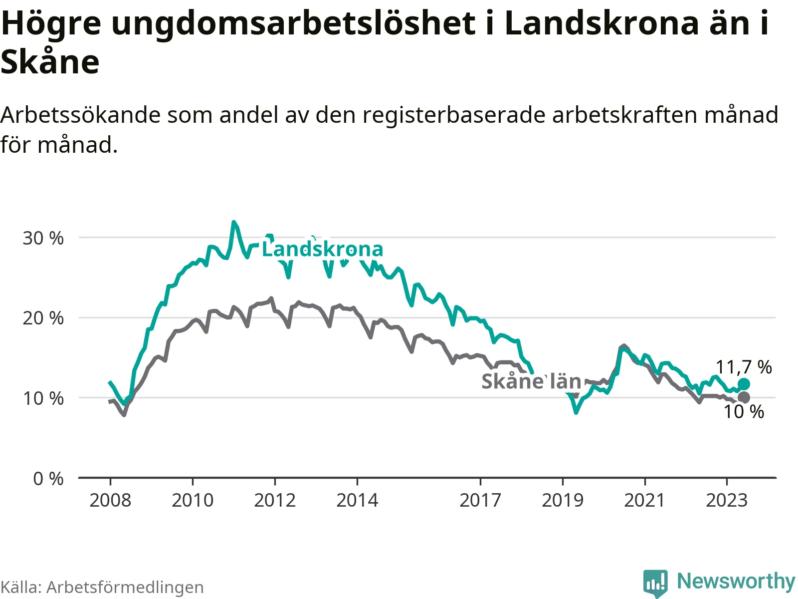 Precis som den totala arbetslösheten ligger ungdomsarbetslösheten i Landskrona högre än i Skåne som helhet. Skillnaden mellan kommunen och länet är 1,7 procentenheter.
