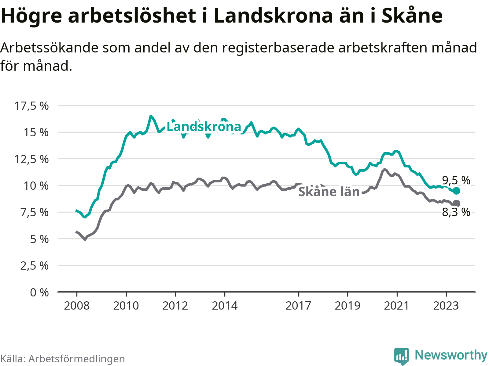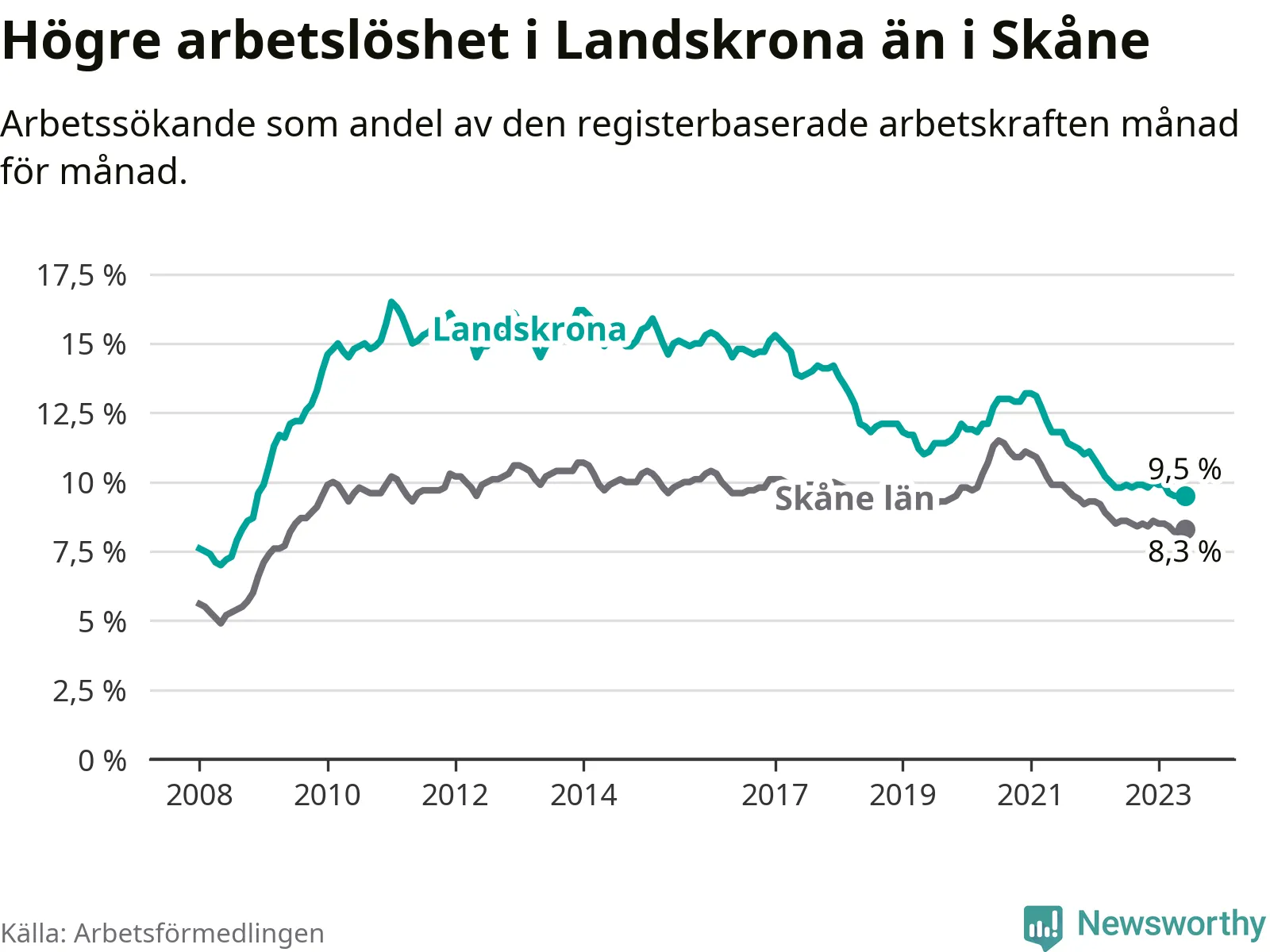 Även om arbetslösheten i Landskrona alltså minskar, så ligger den fortfarande över snittet i hela Skåne län (9,5 procent i kommunen, jämfört med 8,3 procent i hela länet). Vellinge har den lägsta arbetslösheten i länet (3,2 procent), medan Perstorp har den högsta (12,3 procent). För att Landskrona skulle komma ner i samma arbetslöshetsnivå som Vellinge skulle 1 386 personer behöva sysselsättas.