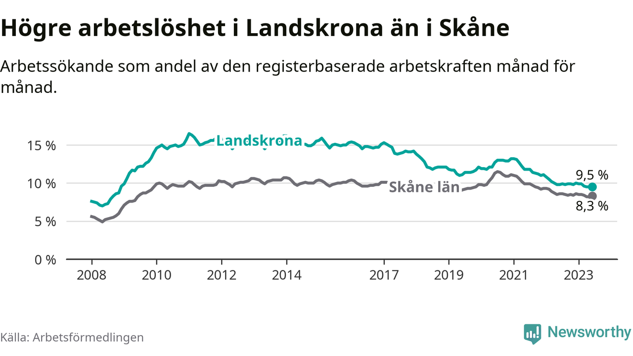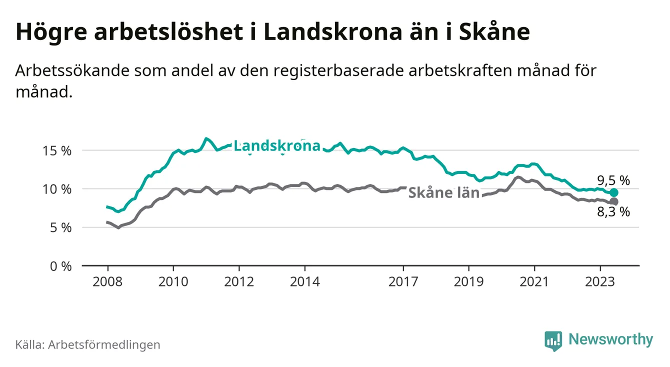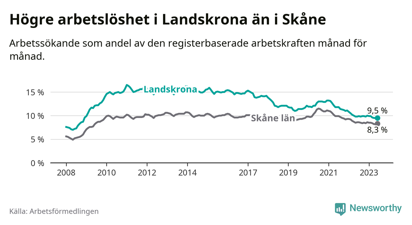 Det är 26:e månaden i följd som arbetslösheten i Landskrona är lägre än den var under samma tidpunkt året innan. Sedan april 2021 har arbetslösheten gått ner från 12,2 till 9,5 procent.