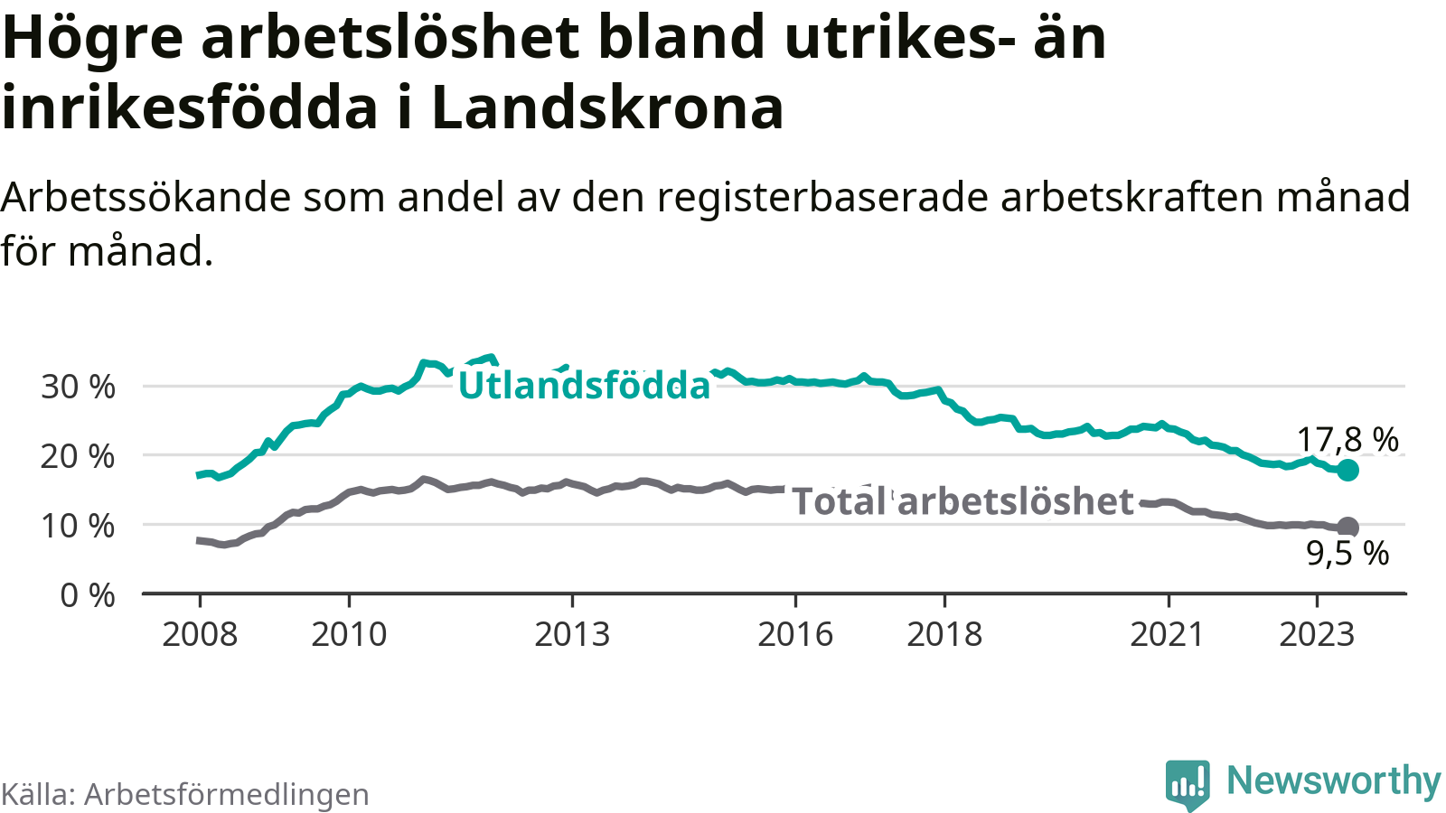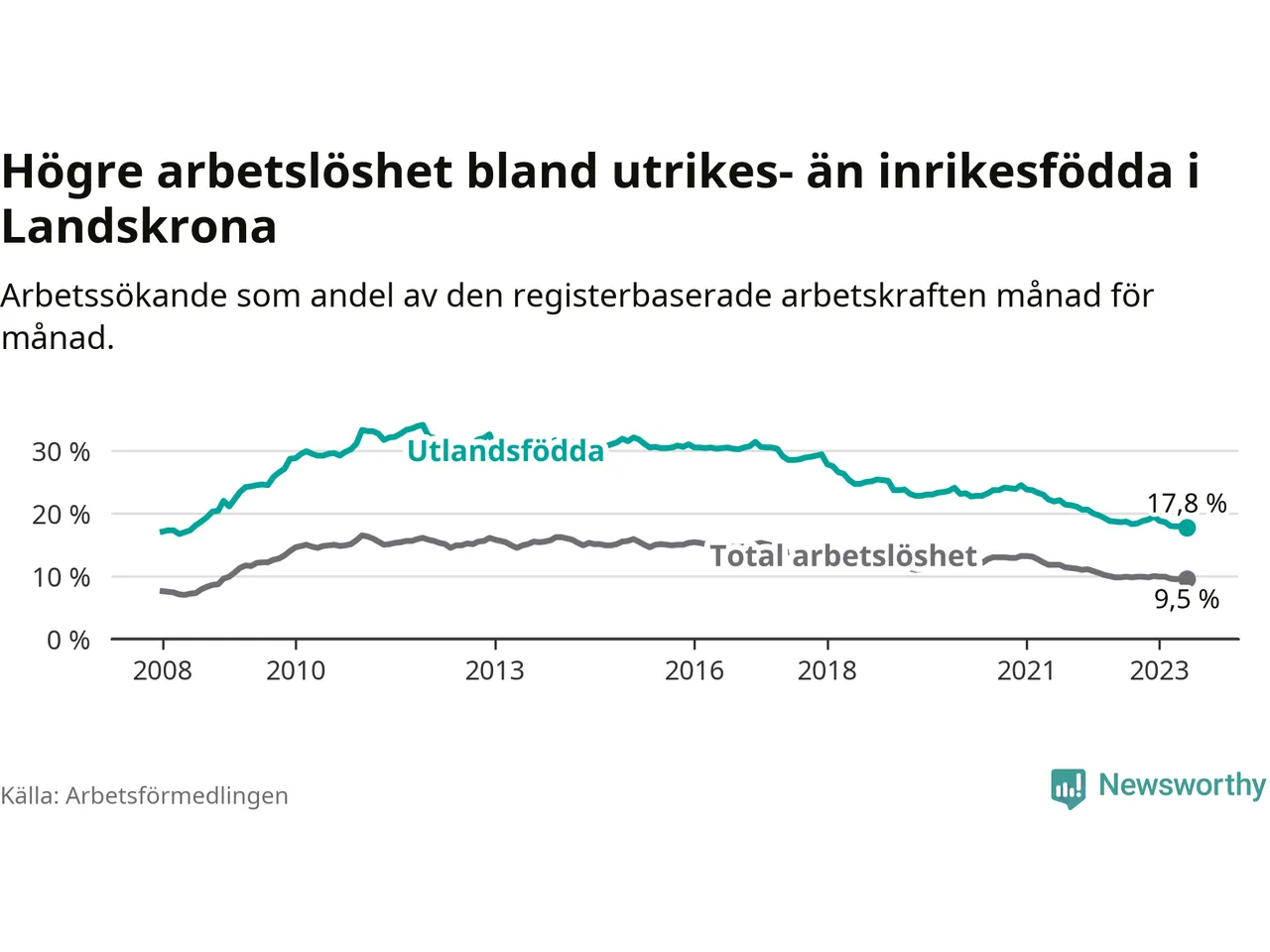 Arbetslösheten bland utlandsfödda var 17,8 procent i Landskrona under juni månad, motsvarande 1 279 av 7 185 personer. Det är 0,8 procentenheter färre än vid samma tidpunkt i fjol (+7 om man räknar personer). Därmed har de utlandsföddas arbetslöshet varit lägre än vid samma tidpunkt i fjol i över två år i sträck. Sedan april 2021 har arbetslösheten bland utlandsfödda minskat från 23,0 till 17,8 procent. Den nuvarande arbetslöshetsnivån är den lägsta sedan juni 2008.