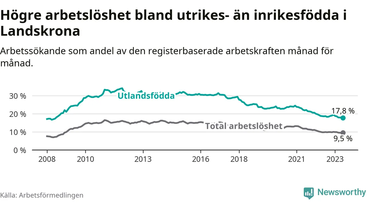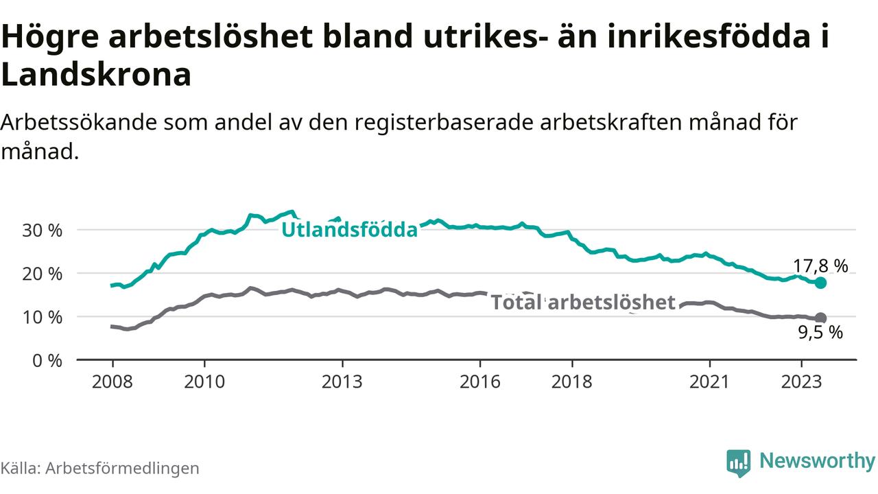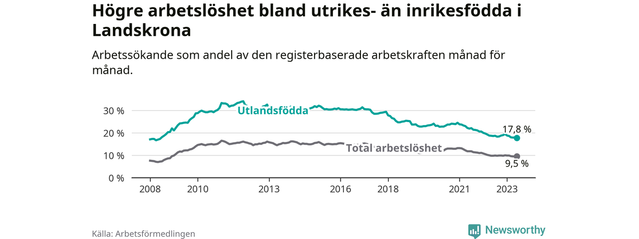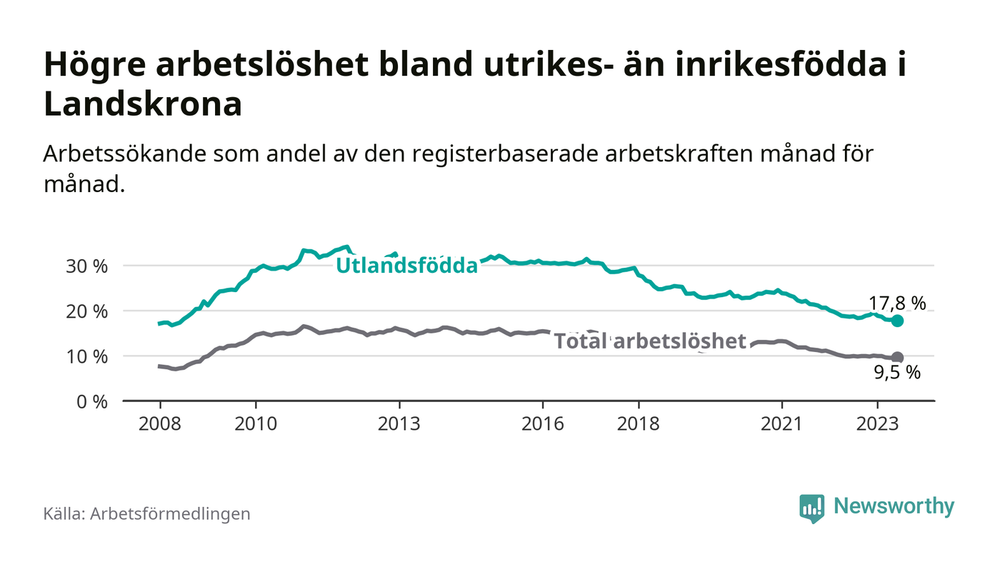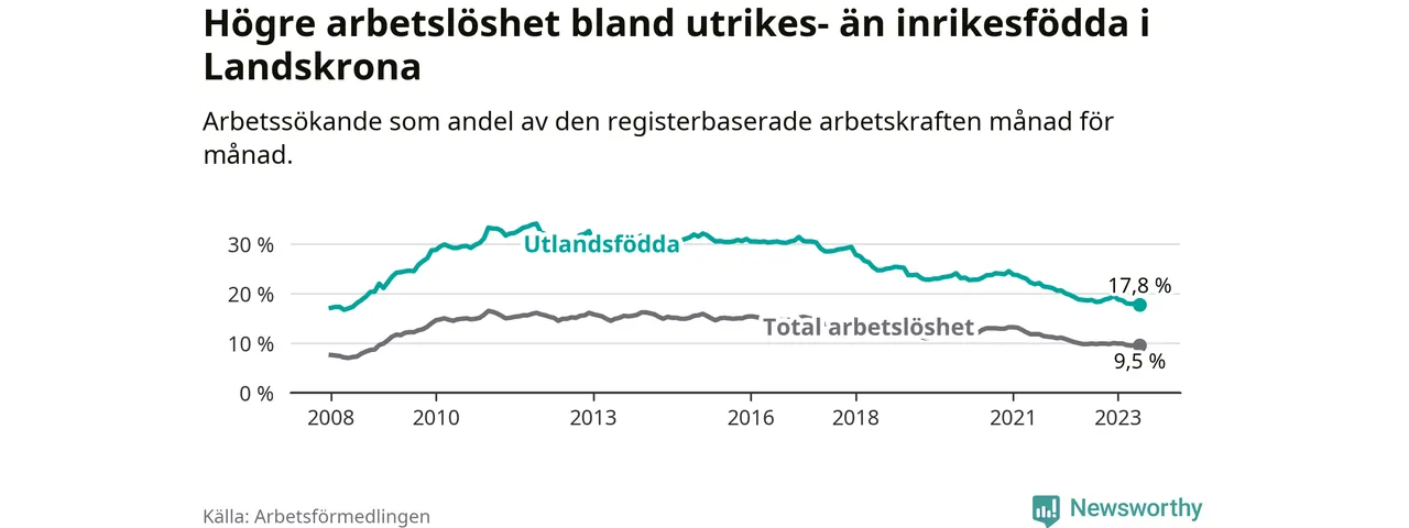 Skillnaden i arbetslöshet mellan utrikesfödda och hela befolkningen är 8,3 procentenheter i Landskrona.