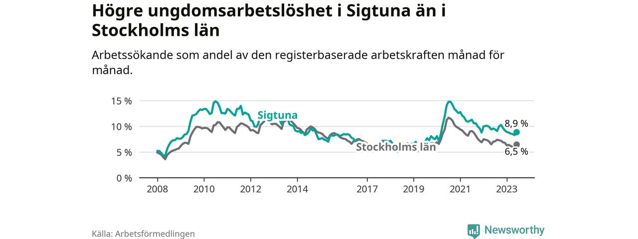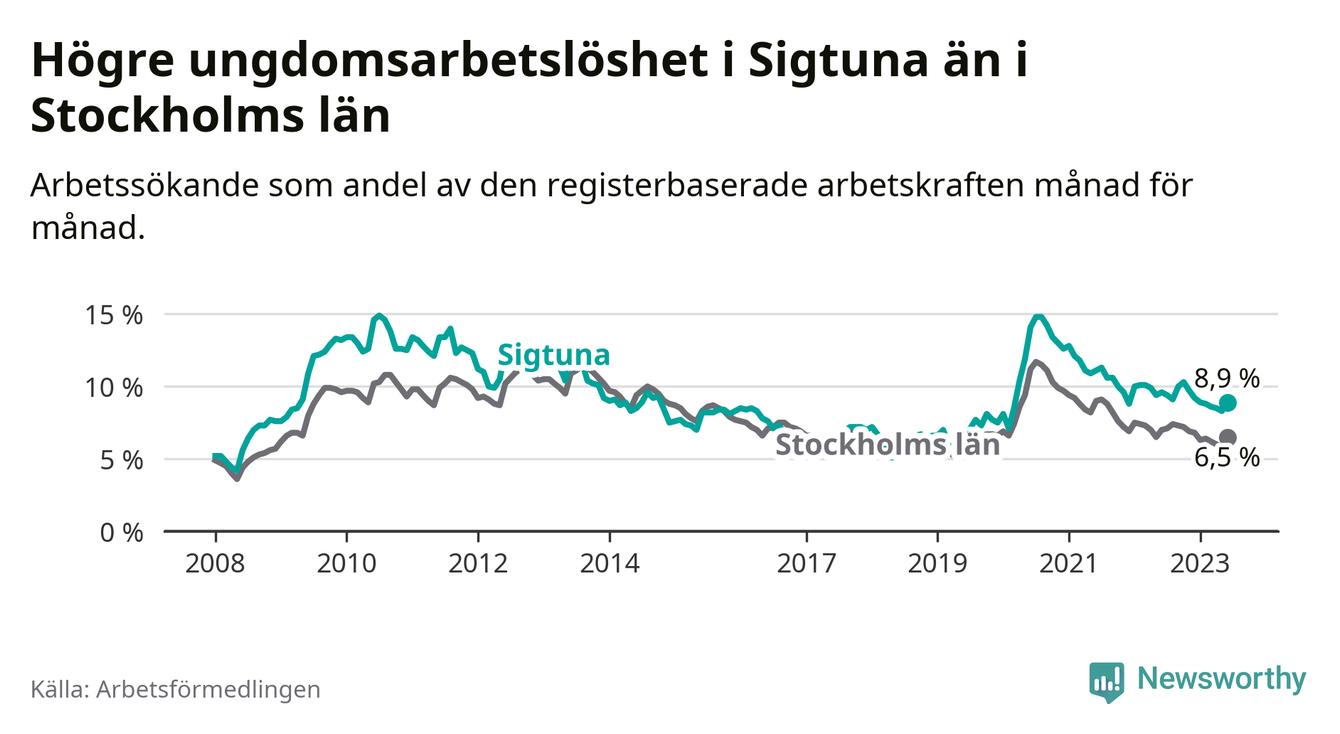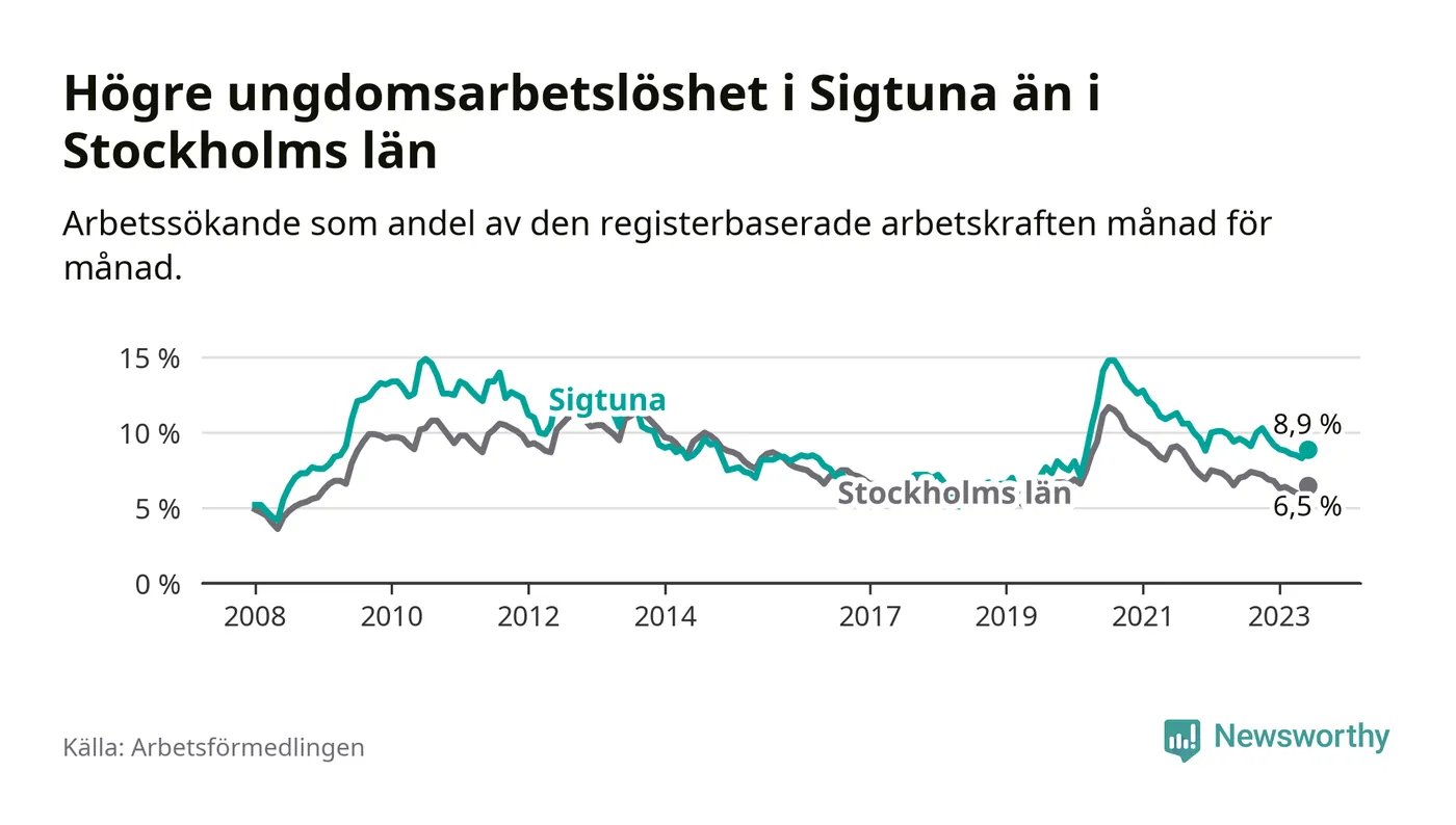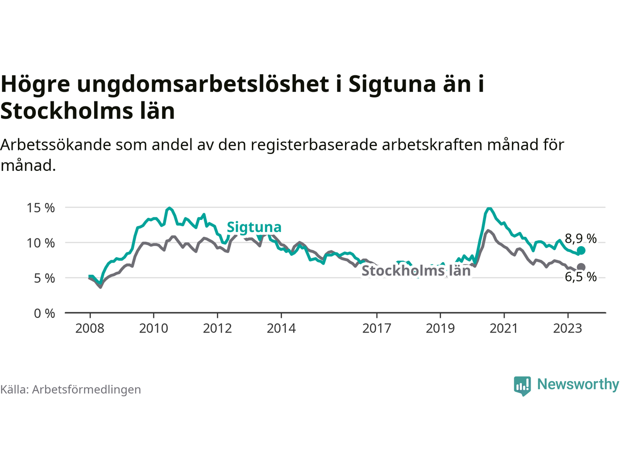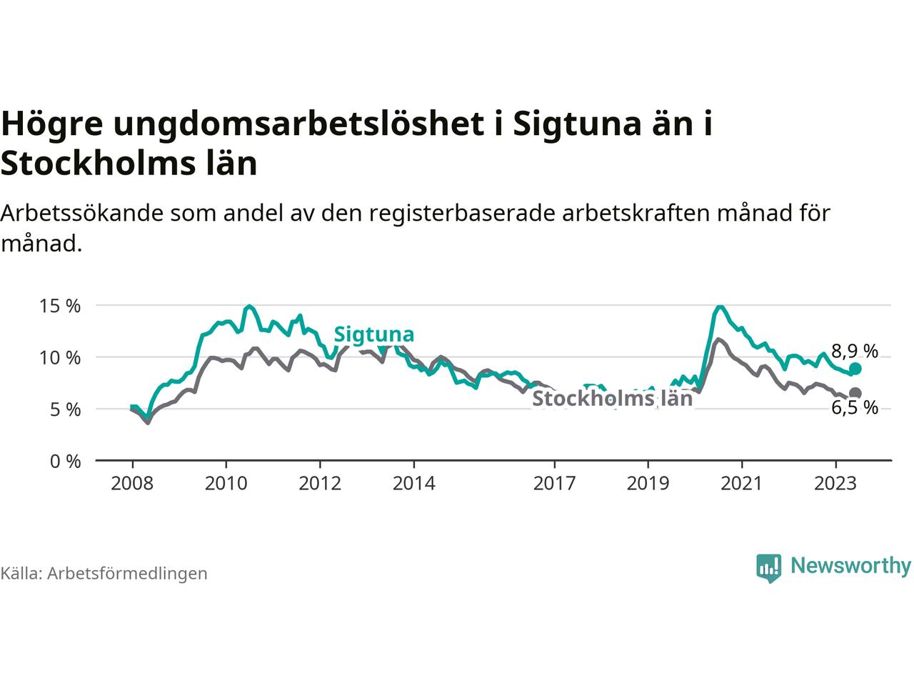 Precis som den totala arbetslösheten ligger ungdomsarbetslösheten i Sigtuna högre än i Stockholms län som helhet. Skillnaden mellan kommunen och länet är 2,4 procentenheter.