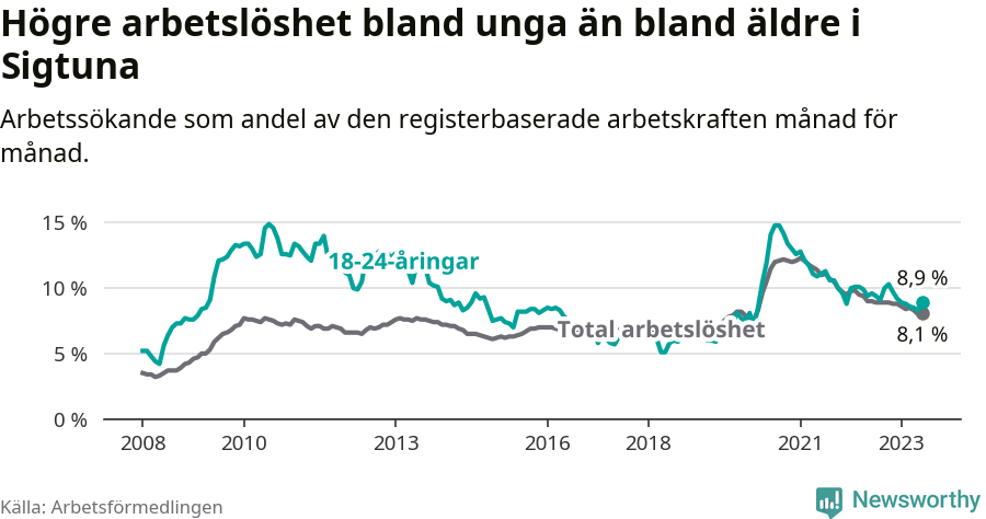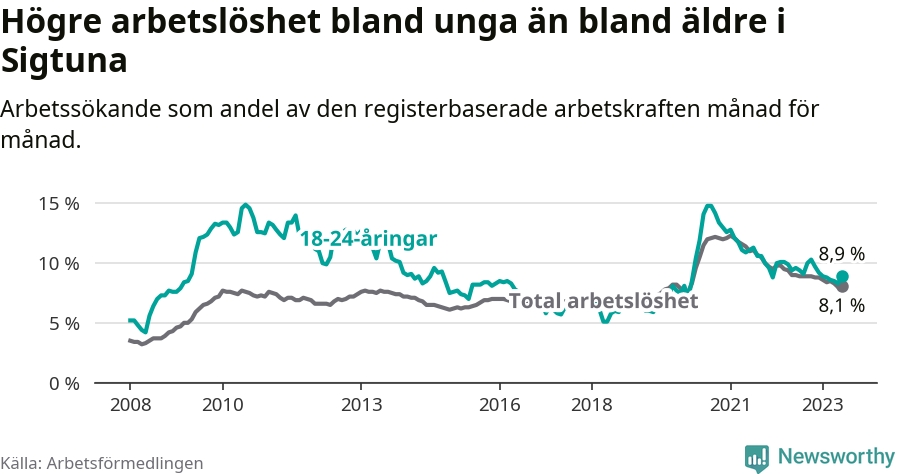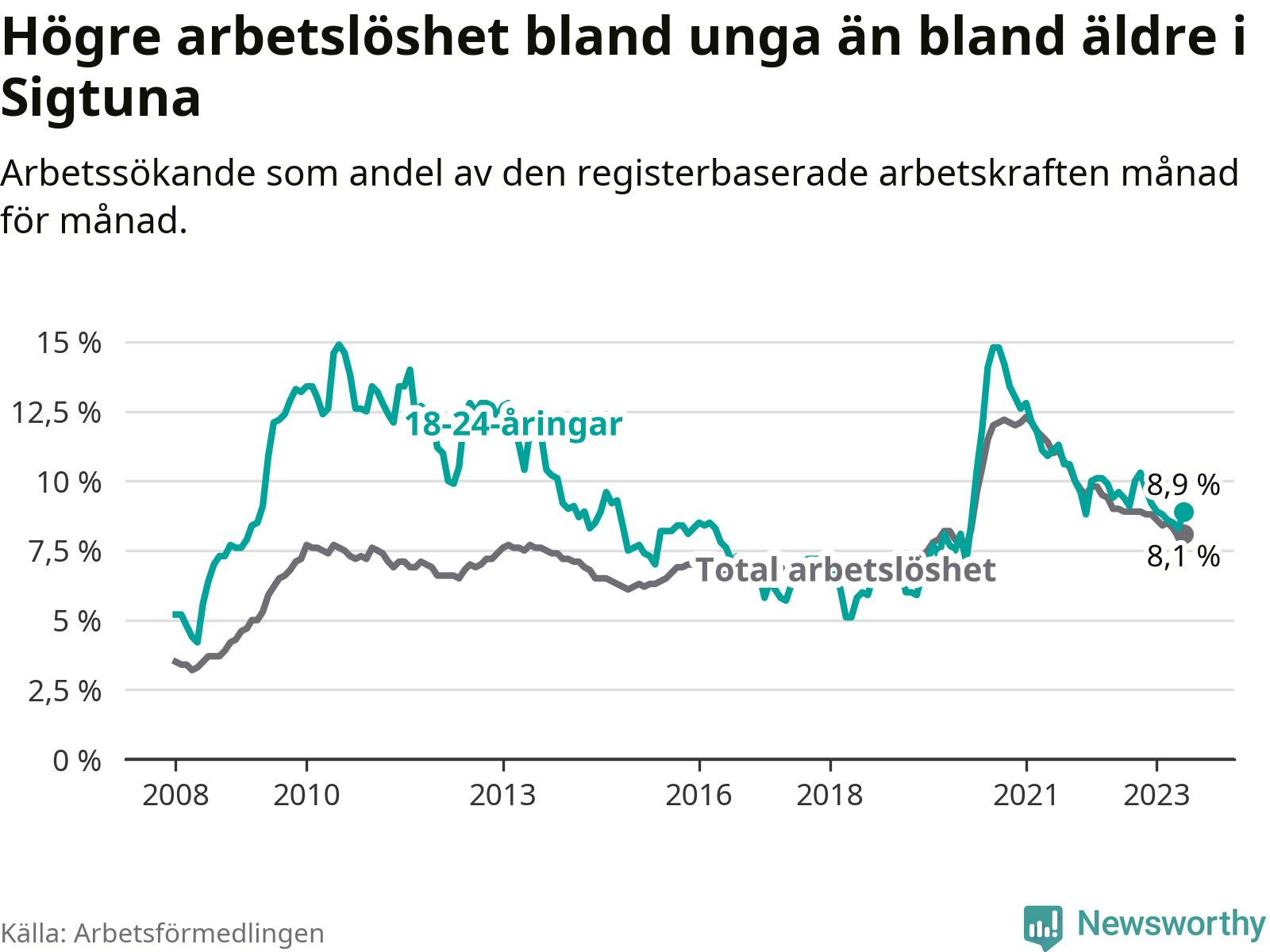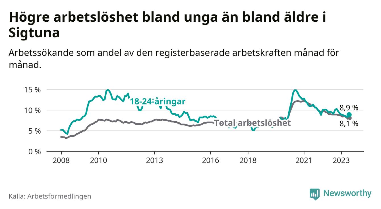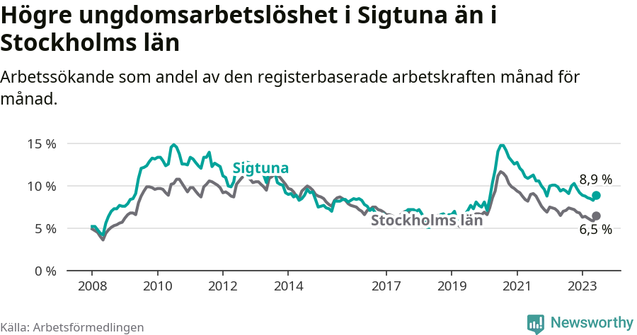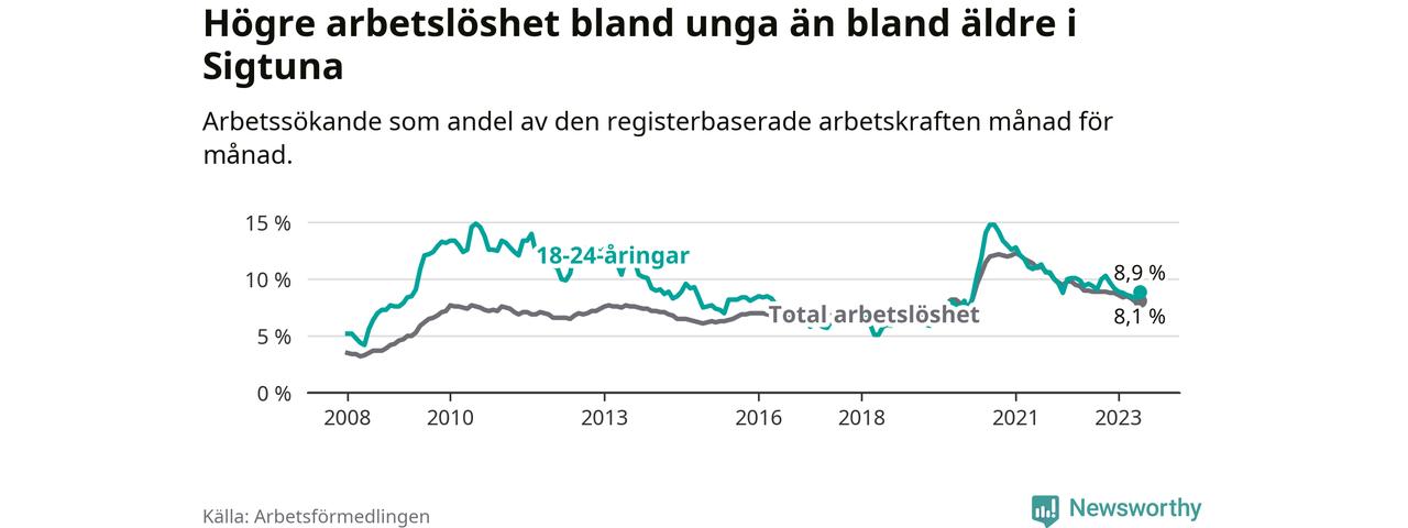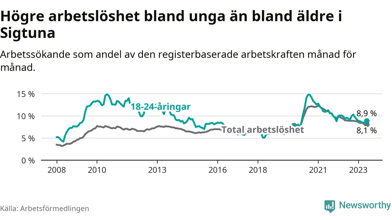 Precis som den totala arbetslösheten ligger ungdomsarbetslösheten i Sigtuna högre än i Stockholms län som helhet. Skillnaden mellan kommunen och länet är 2,4 procentenheter.
