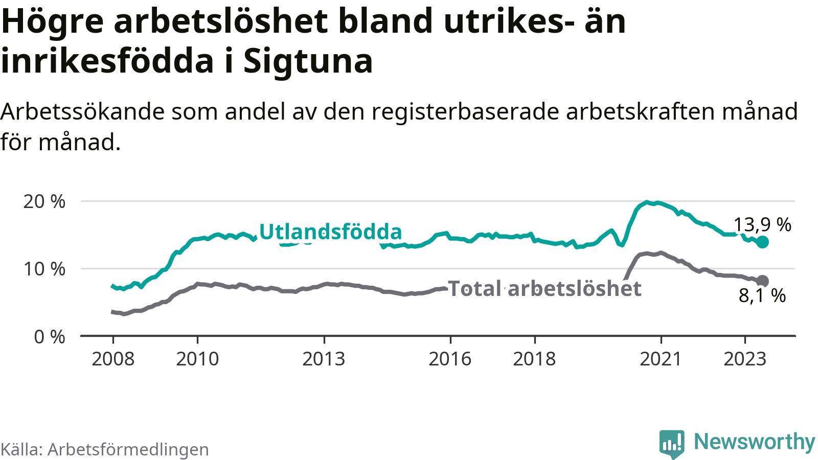 Skillnaden i arbetslöshet mellan utrikesfödda och hela befolkningen är 5,8 procentenheter i Sigtuna. Det är en mindre skillnad än för ett år sedan (−0,6 procentenheter).