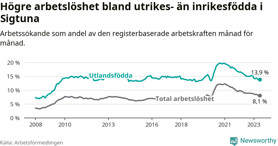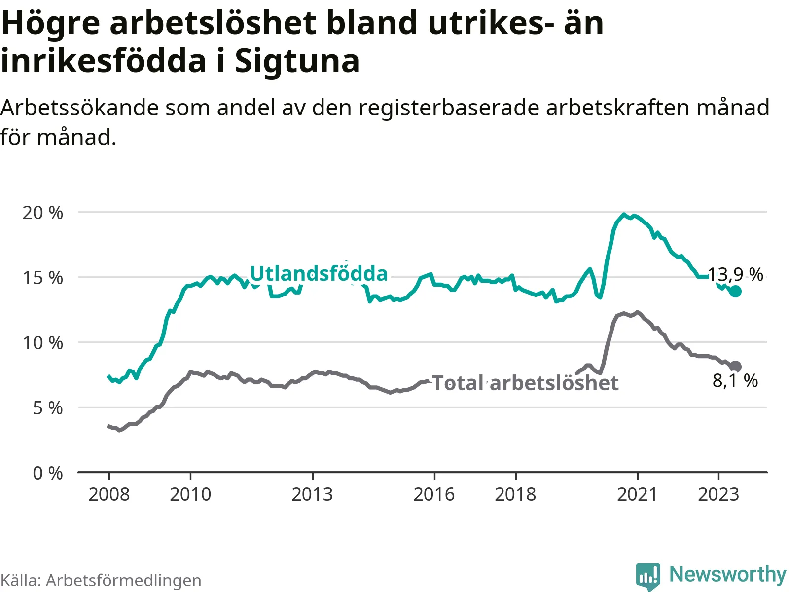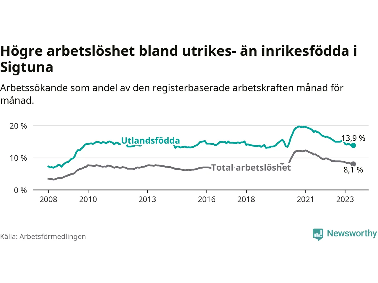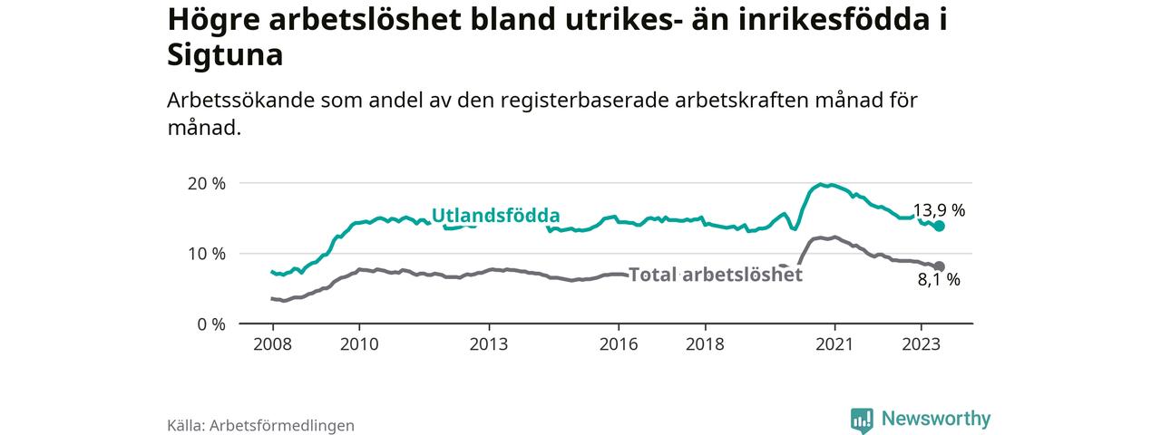 Arbetslösheten bland utlandsfödda var 13,9 procent i Sigtuna under juni månad, motsvarande 1 618 av 11 640 personer. Det är 1,5 procentenheter färre än vid samma tidpunkt i fjol (−49 om man räknar personer). Därmed har de utlandsföddas arbetslöshet varit lägre än vid samma tidpunkt i fjol i över två år i sträck. Sedan maj 2021 har arbetslösheten bland utlandsfödda minskat från 18,7 till 13,9 procent.