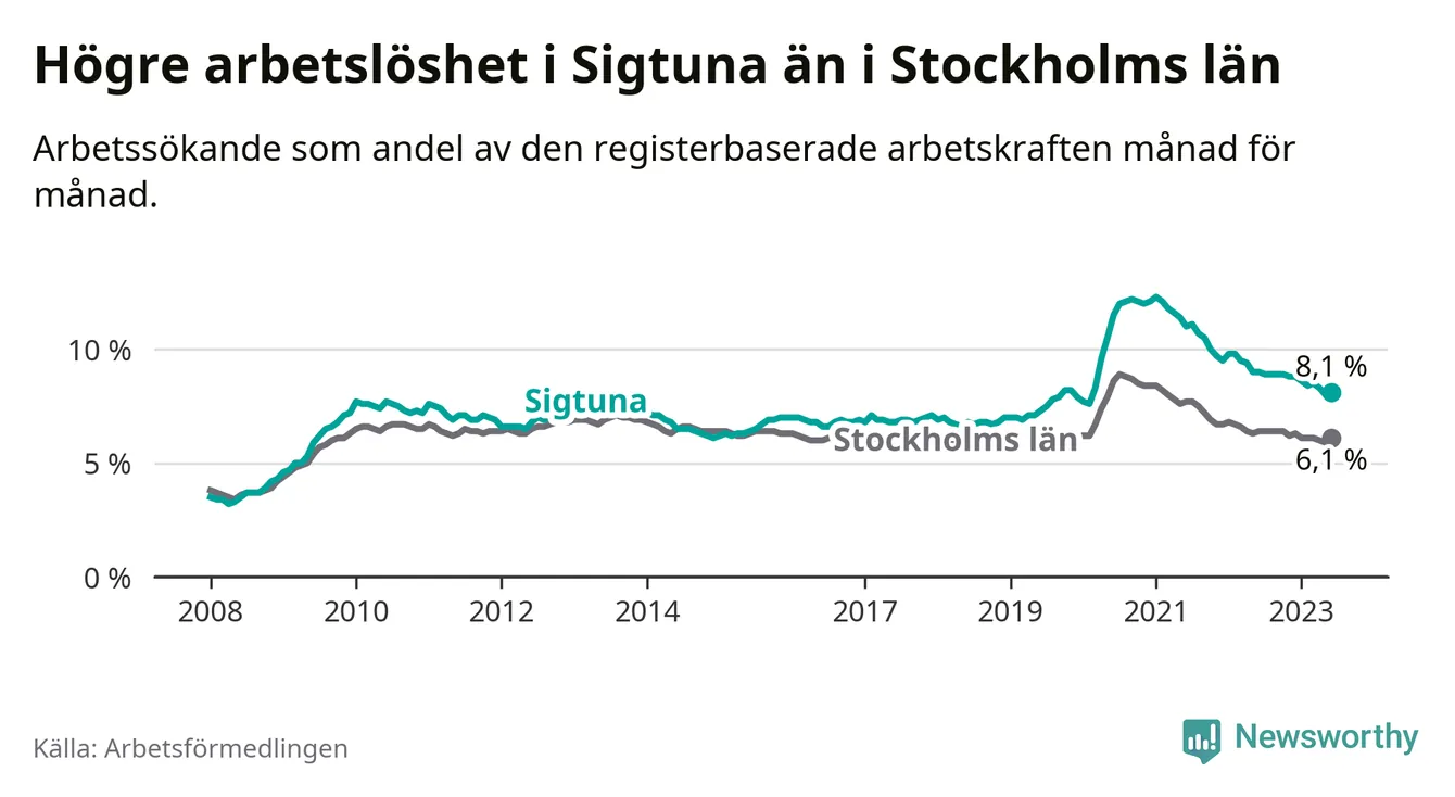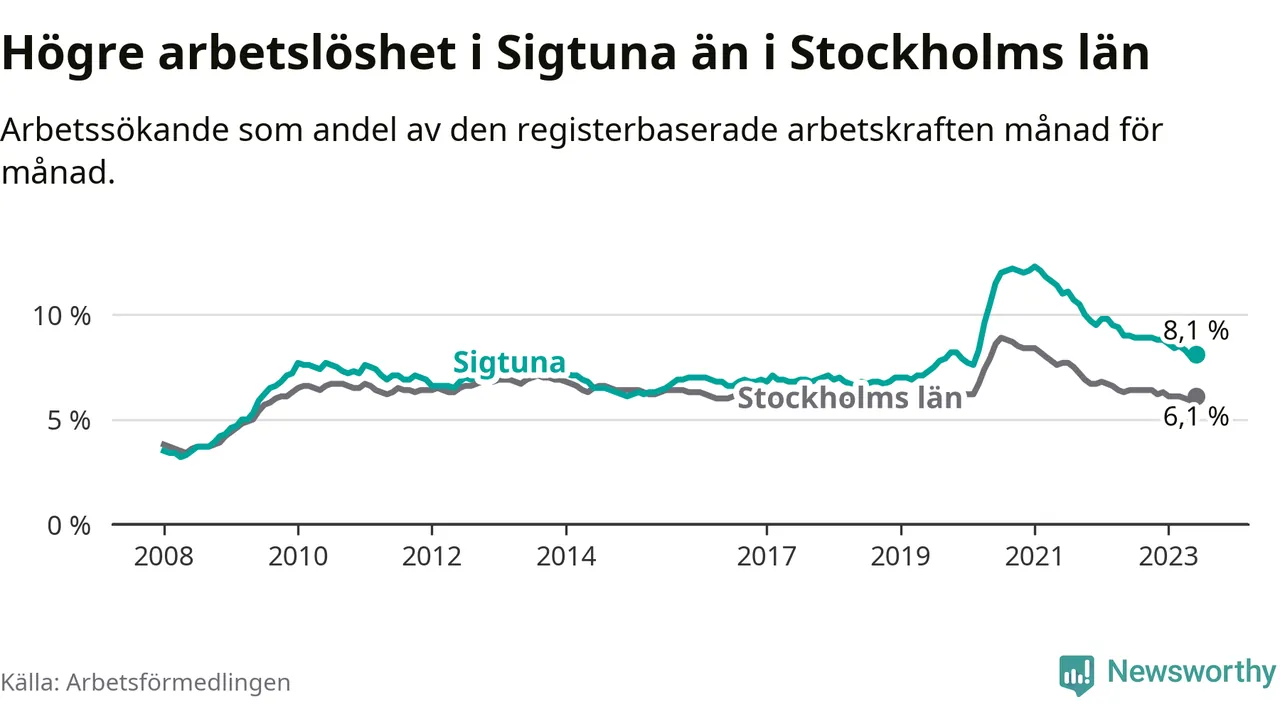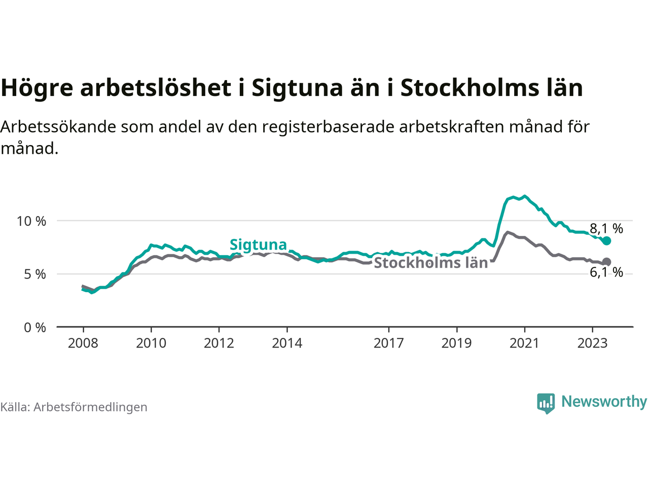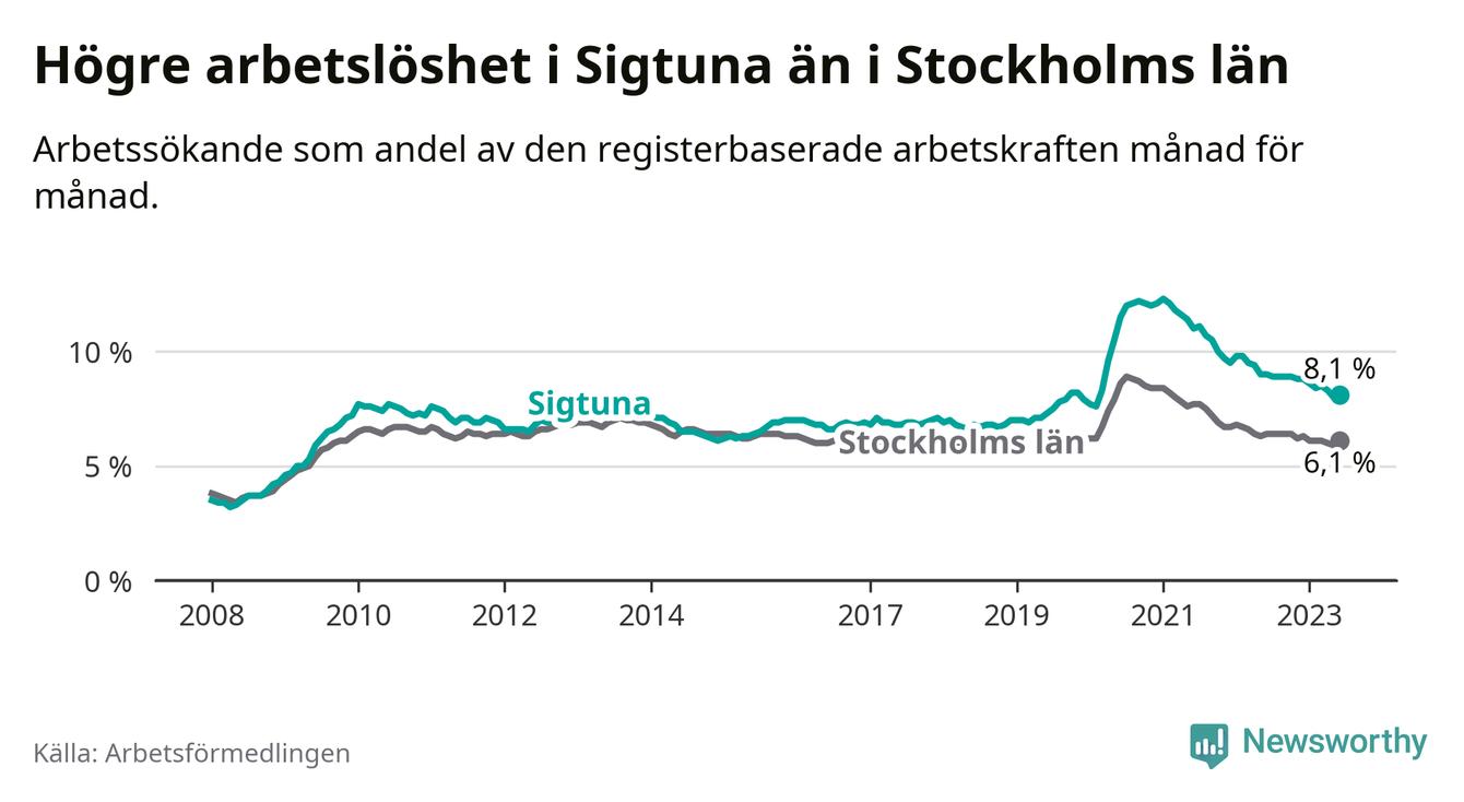 Även om arbetslösheten i Sigtuna alltså minskar, så ligger den fortfarande över snittet i hela Stockholms län (8,1 procent i kommunen, jämfört med 6,1 procent i hela länet). Vaxholm har den lägsta arbetslösheten i länet (3,1 procent), medan Botkyrka har den högsta (10,3 procent). För att Sigtuna skulle komma ner i samma arbetslöshetsnivå som Vaxholm skulle 1 295 personer behöva sysselsättas.